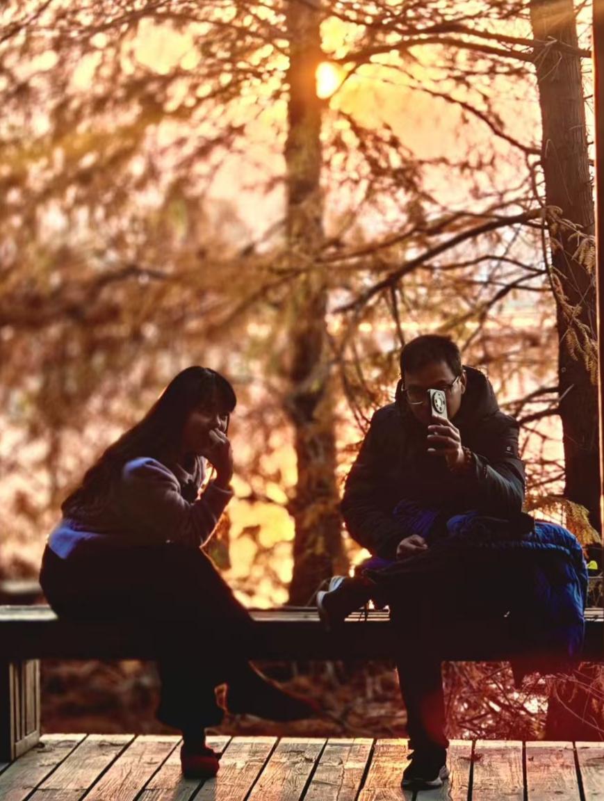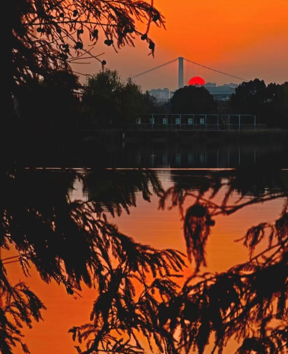 橘色暮色漫过水面,枝桠的剪影里,落日正倚着桥塔歇脚,波纹把整片暖光揉成了晃荡的糖。 落日把树影浸成暖黄,长椅上的风都裹着软光——你举着手机框住此刻,我咬着笑意偷藏这帧秋阳。