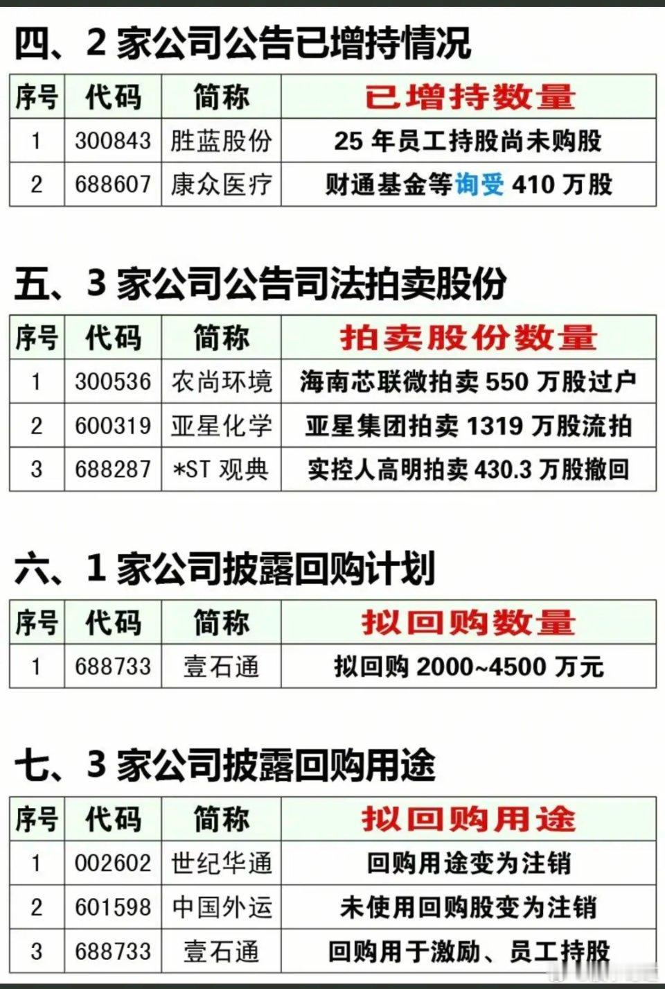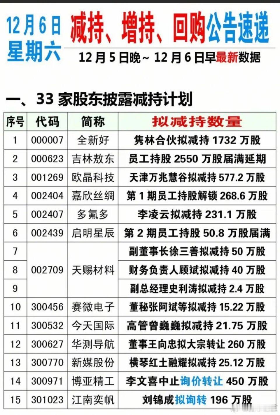 12月6日周六 最新:减持、增持、回购公告速递!33家公司减持计划。5家公司增持计划,3家法拍股份,1家回购。股事论道今日看盘股票