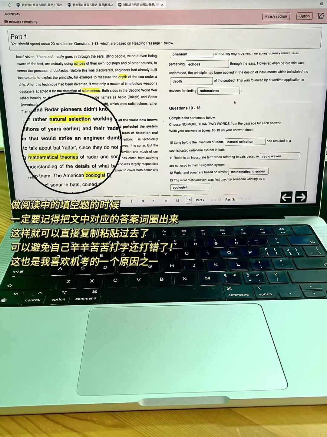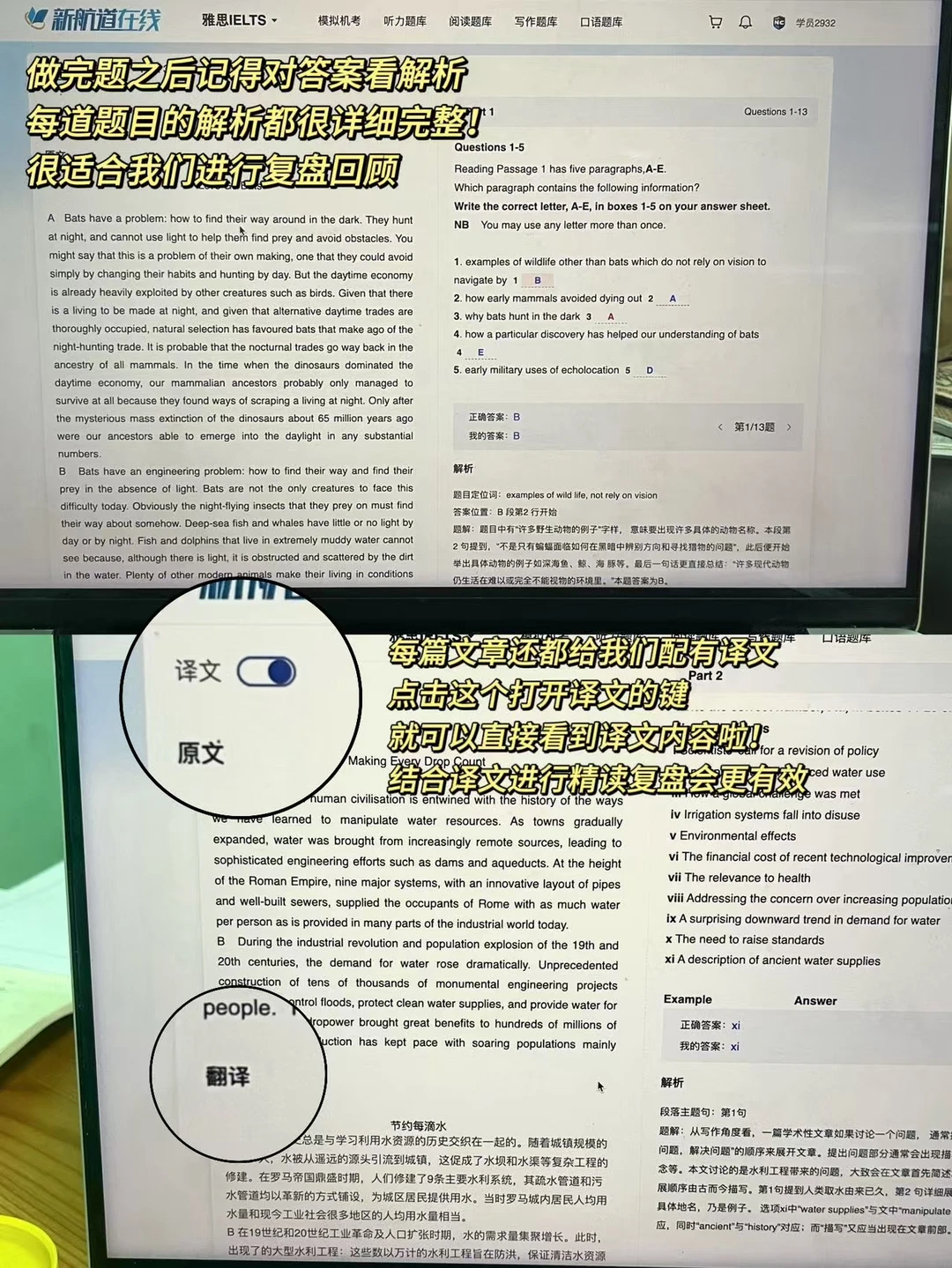 📒做阅读题的时候(特别是填空题),一定要记得将文中的答案词用高光进行标记,这样直接复制粘贴可以避免自己拼写出错。阅读部分做完题之后一定要记得进行精读!新航道九分达人机考网站会给我们提供阅读文章的翻译,在精读时可以对照着中文翻译理解英语文章,精读的效果也会有比较大的提升~