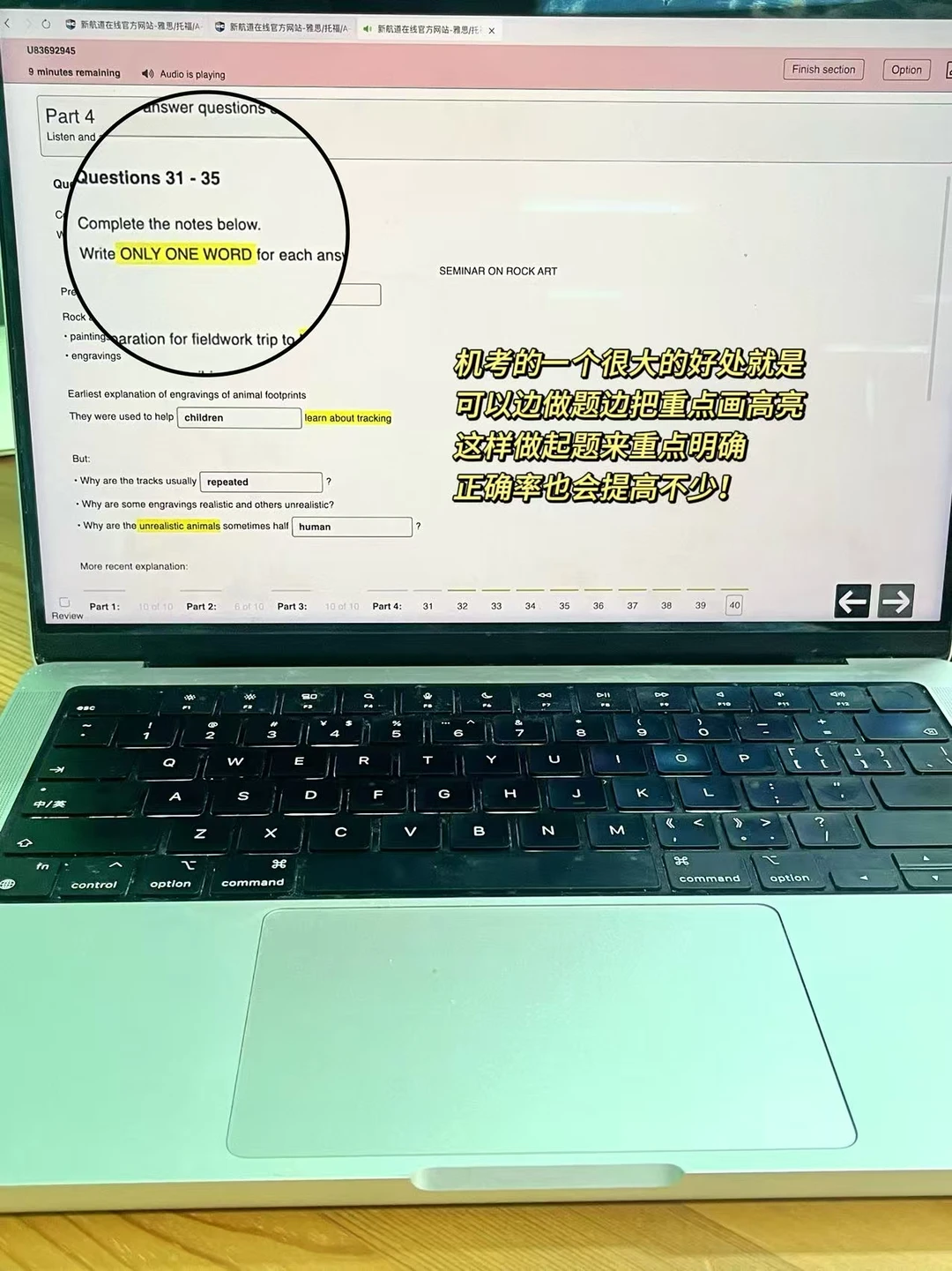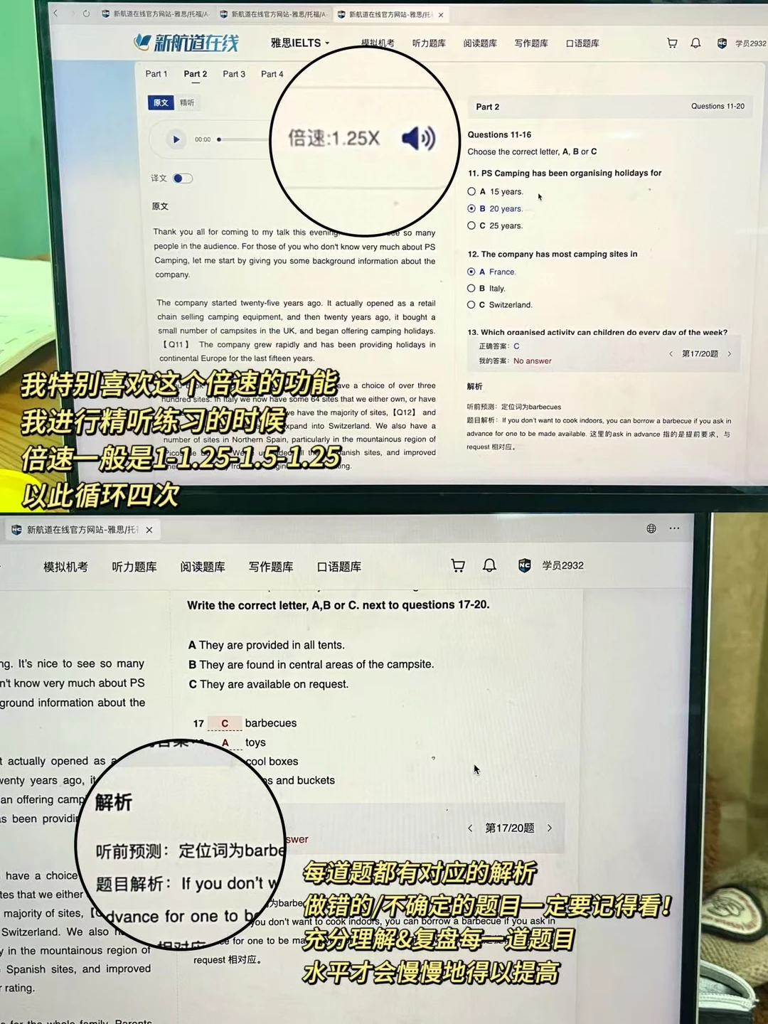 ✍️练题我特别喜欢使用新航道9分达人机考网站,它是一比一还原雅思机考界面的,同时题库资源也特别丰富,包含9分达人题库和官方剑雅真题题库。练习听力的时候注意用它的高光功能来标记重点部分,复盘听力时可以进行倍速精听(建议倍速1-1.25-1.5-1.25),同时根据它提供的错题解析来分析理解错题🥰