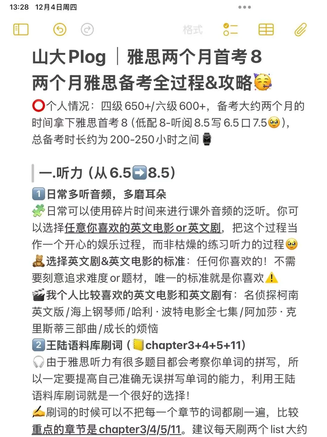 ⭕️个人情况:四级650+/六级600+,备考约两个月的时间拿下雅思首考8,总备考时长约200-250小时之间🥹