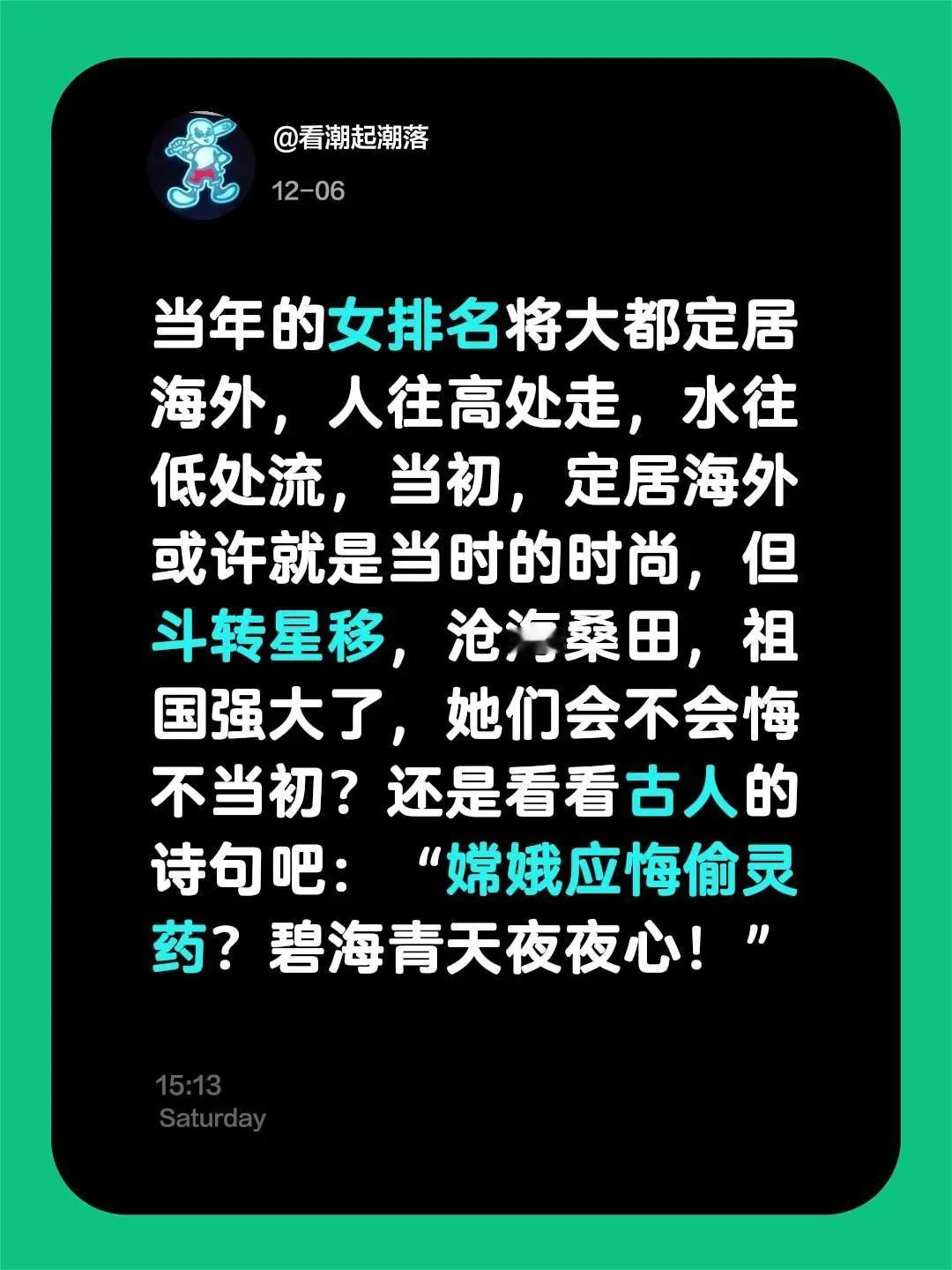 我评论了@(Ő呢喃Ő) 的作品:当年的女排名将大都定居海外,人往高处走,水往低处流,当初,定居海外或许就是当时的时尚,但斗转星移,沧海桑田,祖国强大了,她们会不会悔不当初?还是看看古人的诗句吧:“嫦娥应悔偷灵药?碧海青天夜夜心!”