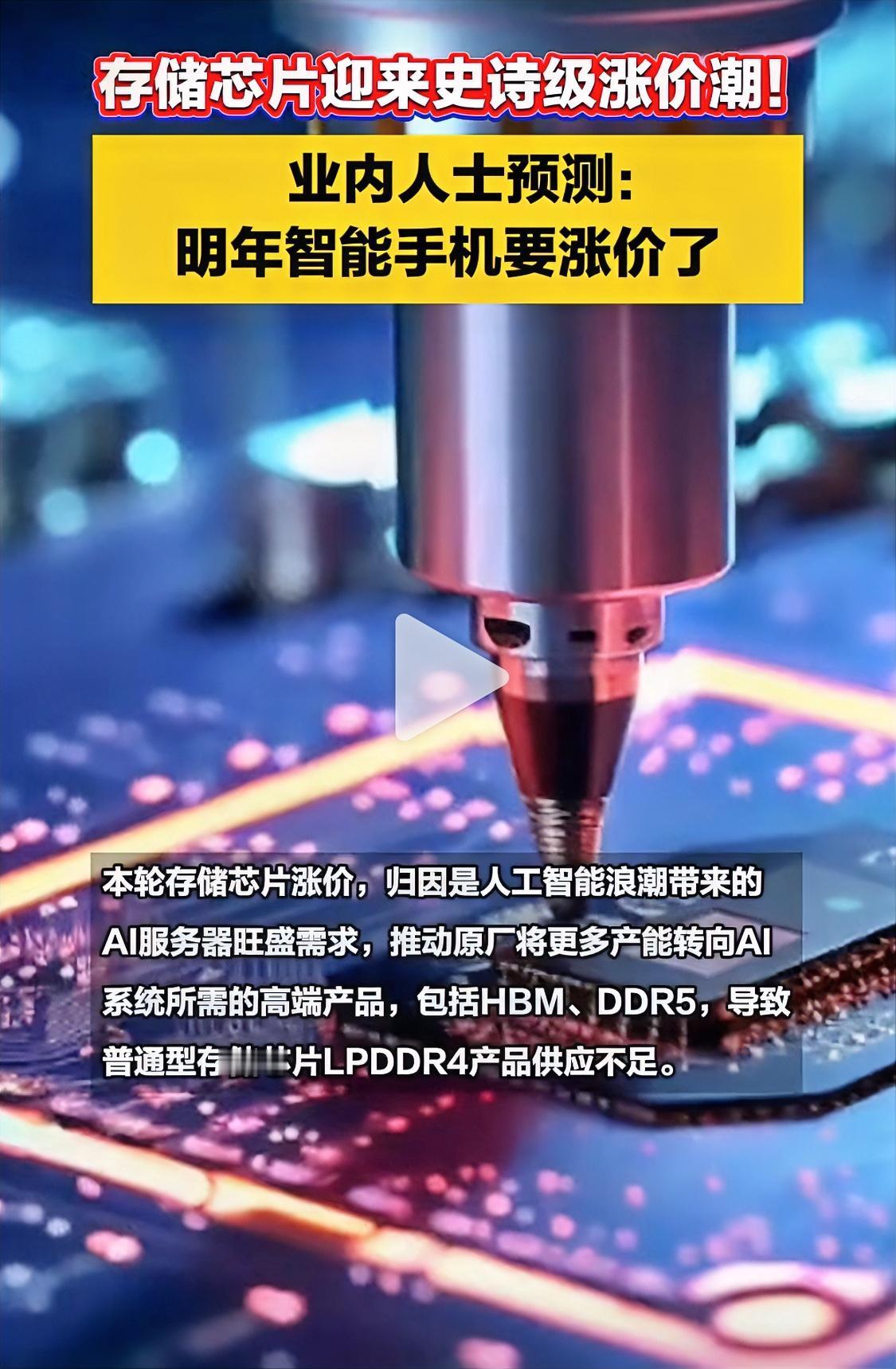 因为Ai浪潮,手机、尤其是低端的手机涨价已成必然,且还会持续较长一段时间 可能很多人不解,Ai和手机有啥关系?只因它们都需要存储芯片,而Ai训练服务器用到的存储芯片利润更高。 各个国家现在都在使劲搞Ai,直接拉动了对高带宽内存(HBM) 和大容量企业级固态硬盘(eSSD) 的爆炸式需求,加上造这类芯片利润高。自然,制造商都愿把现有生产线用在这类存储芯片的生产上。 为何投资者不趁机多建存储芯片制造厂?只因存储芯片的生产在目前来说还是门槛极高的高技术产业,有能力制造出符合要求的厂家并不多。全球内存市场的95%以上份额由三星、SK海力士、美光三家控制,NAND闪存市场也高度集中。 至于已掌握技术的这几个寡头为何不趁机扩建?一是建设一座新的存储芯片晶圆厂并实现量产,通常需要2年以上的时间。二是它们大都有过去产能过剩导致价格暴跌的教训,因此,它们更倾向于维持产能紧张和高价格,而非迅速扩大产能。 至于为何低端手机会首先提价,那就很好理解了。低端手机本就“卷”的利润微薄,已有部分手机制造商的部分机型已处于负毛利状态,存储成本上涨自然对它们冲击最大…… 总之,当前的情况是一场由AI引爆的需求革命,撞上了短期刚性的产能供给和高度集中的产业链结构。存储产业已经分裂为“AI高端市场”和“消费电子传统市场”两个世界。只要AI发展的热度不减,这种为AI发展“买单”的压力就会持续向消费电子领域传导。