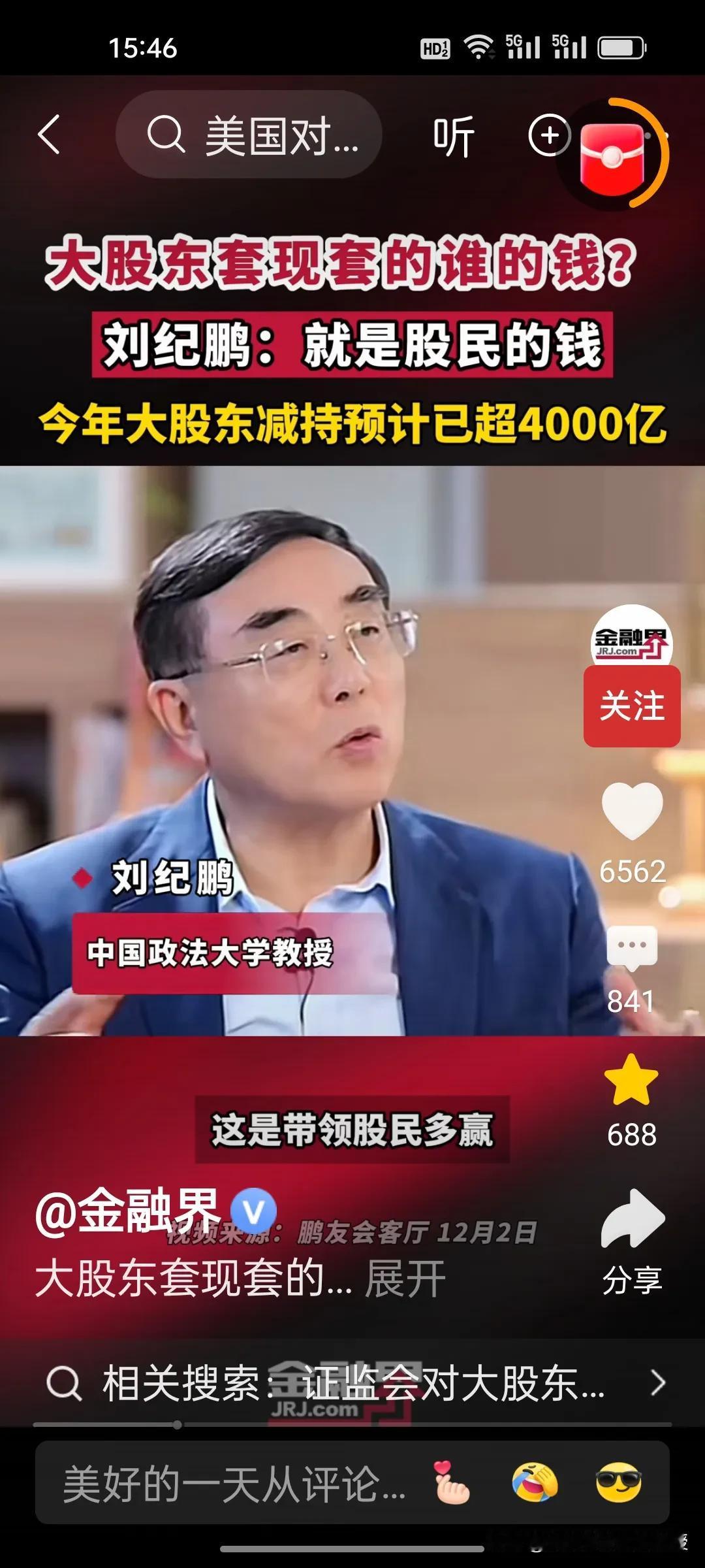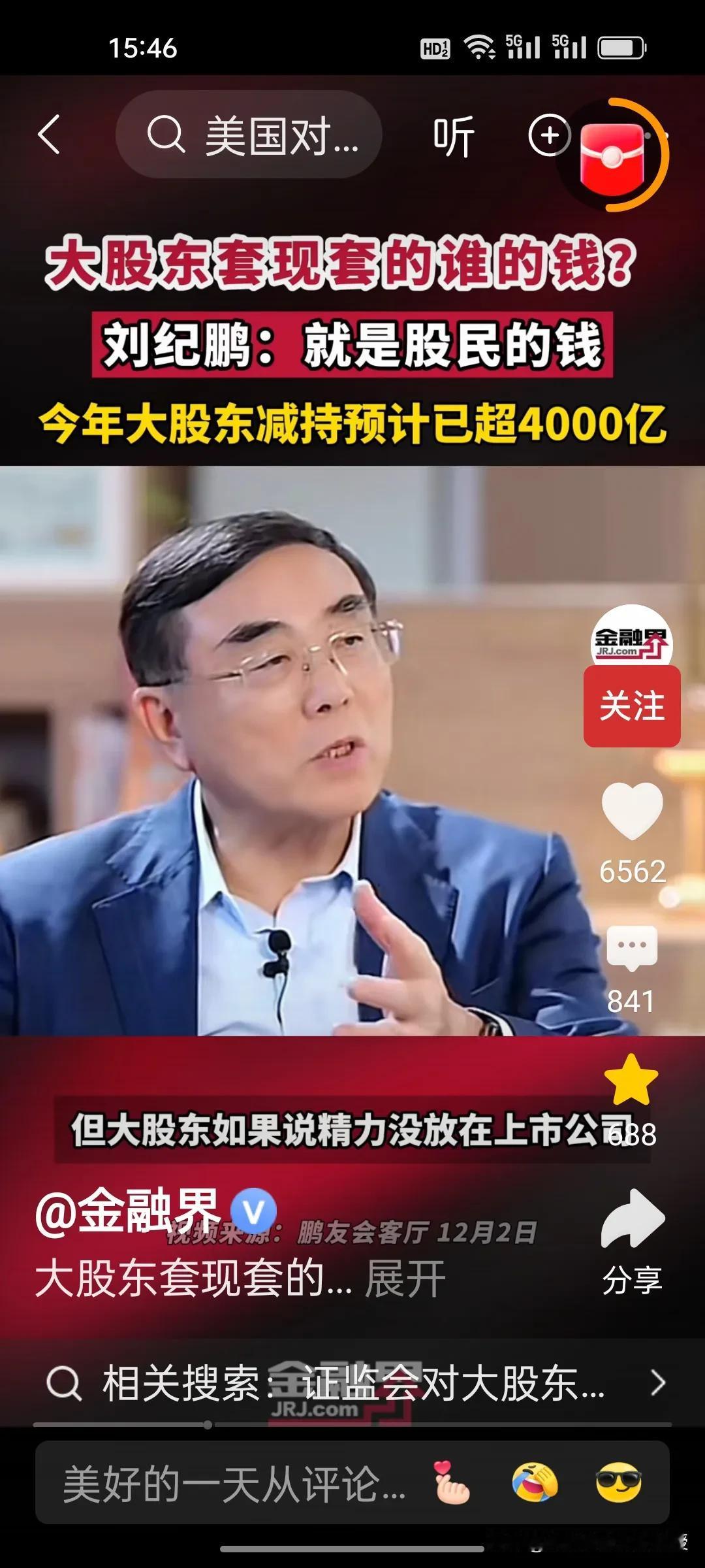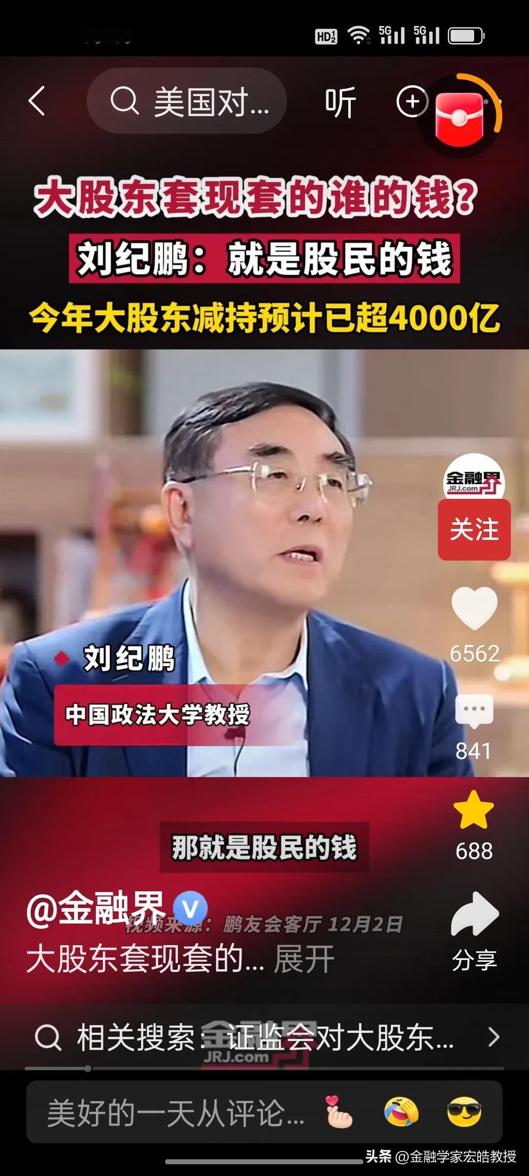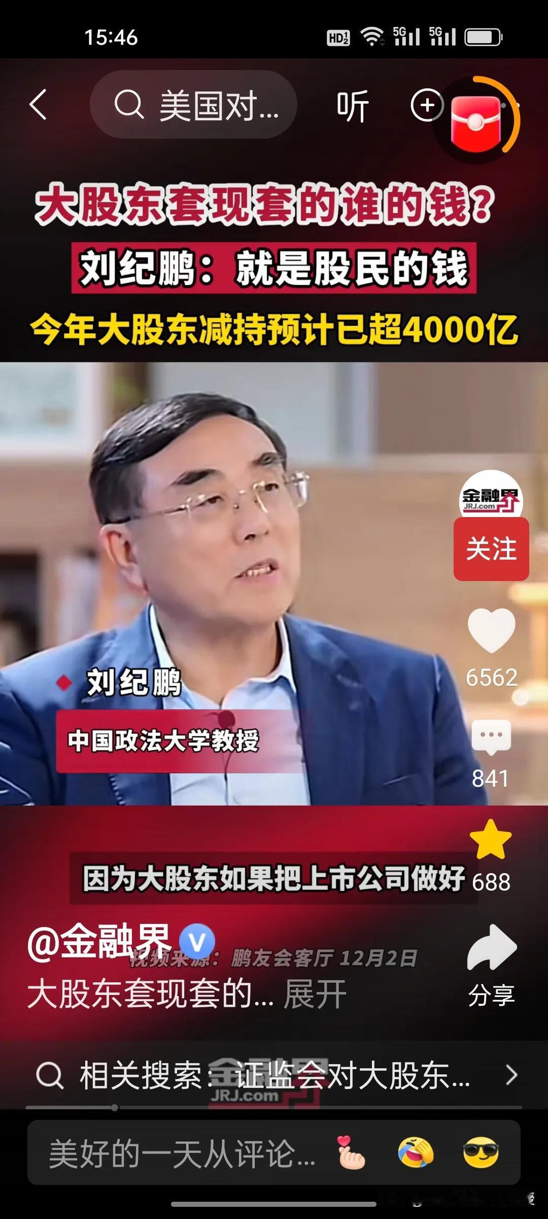 刚刚看到刘纪鹏教授视频,解释了大股东减持的是谁的钱?刘教授说就是股民的钱。 美股资本市场总市值是中国的近五倍,将近500万亿,而中国股市总市值100万亿。美股在今年上半年减持合计约515亿美元(约合人民币3678亿元),而刘纪鹏教授称国内的资本市场,今年大股东减持已经4000亿了,已经超过美股的减持数量,减持后,这些人的心都不在上市公司了。 昨天,证监会出台了首部关于上市公司监管的法规,里面提到了一条,“规范表决权让渡、放弃,以及大股东、特定股东减持等行为”。刘纪鹏教授的担心总算是有了回应。