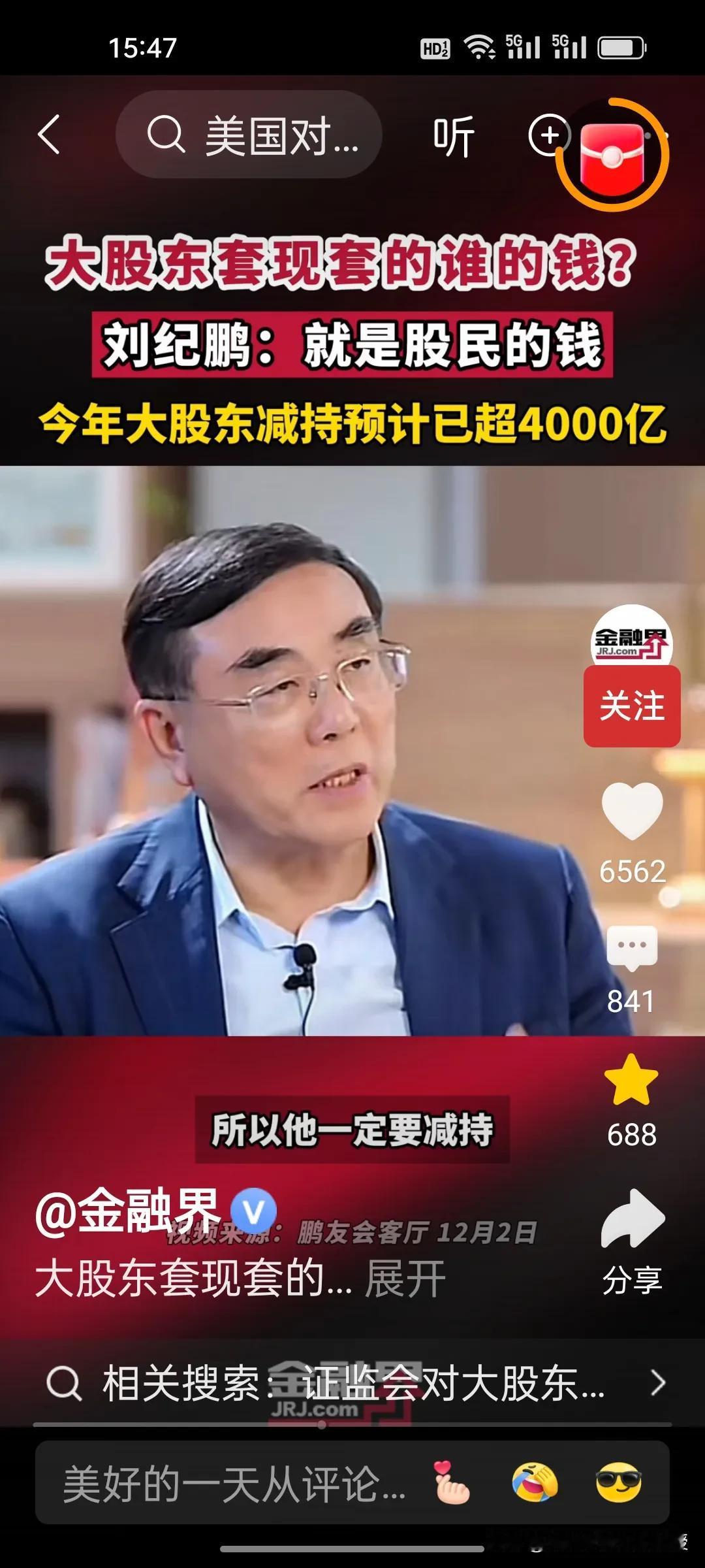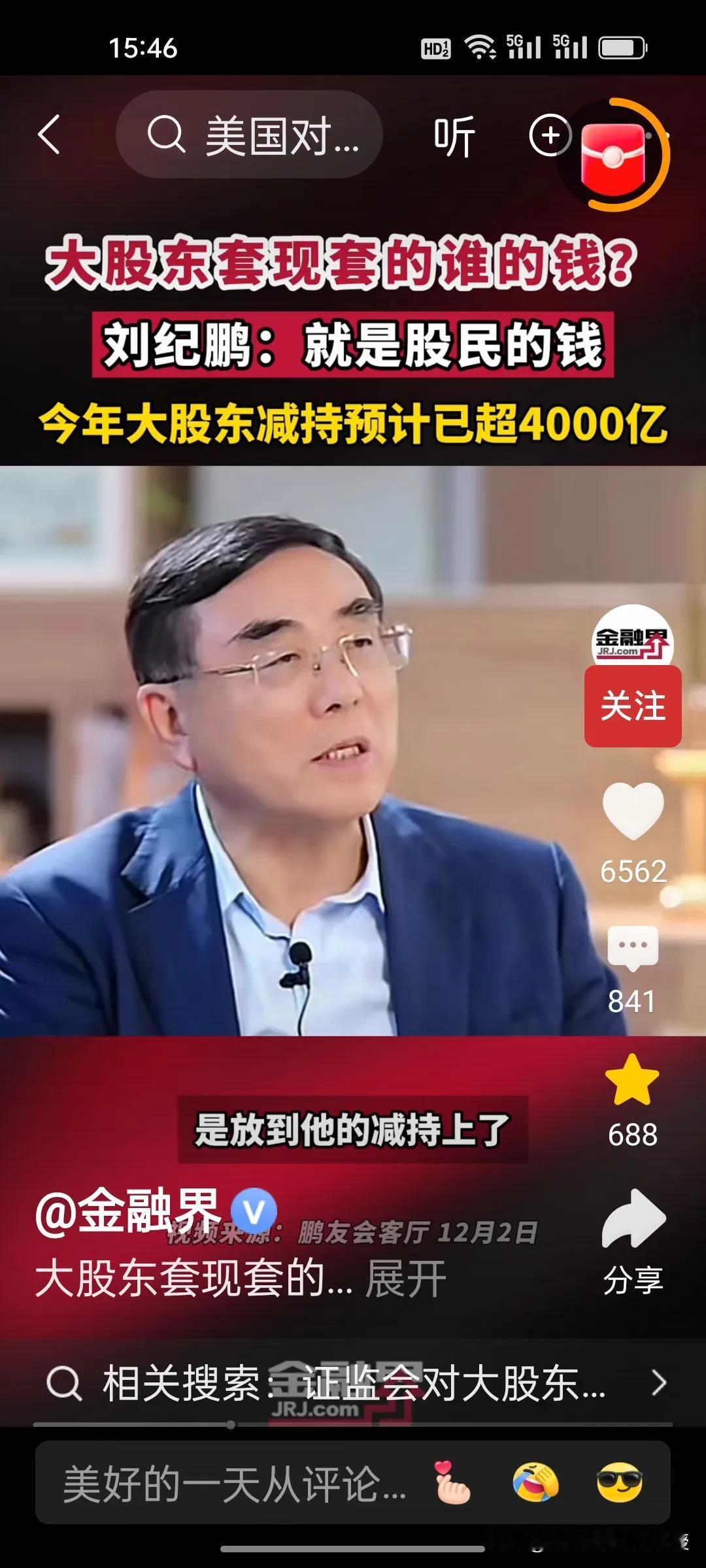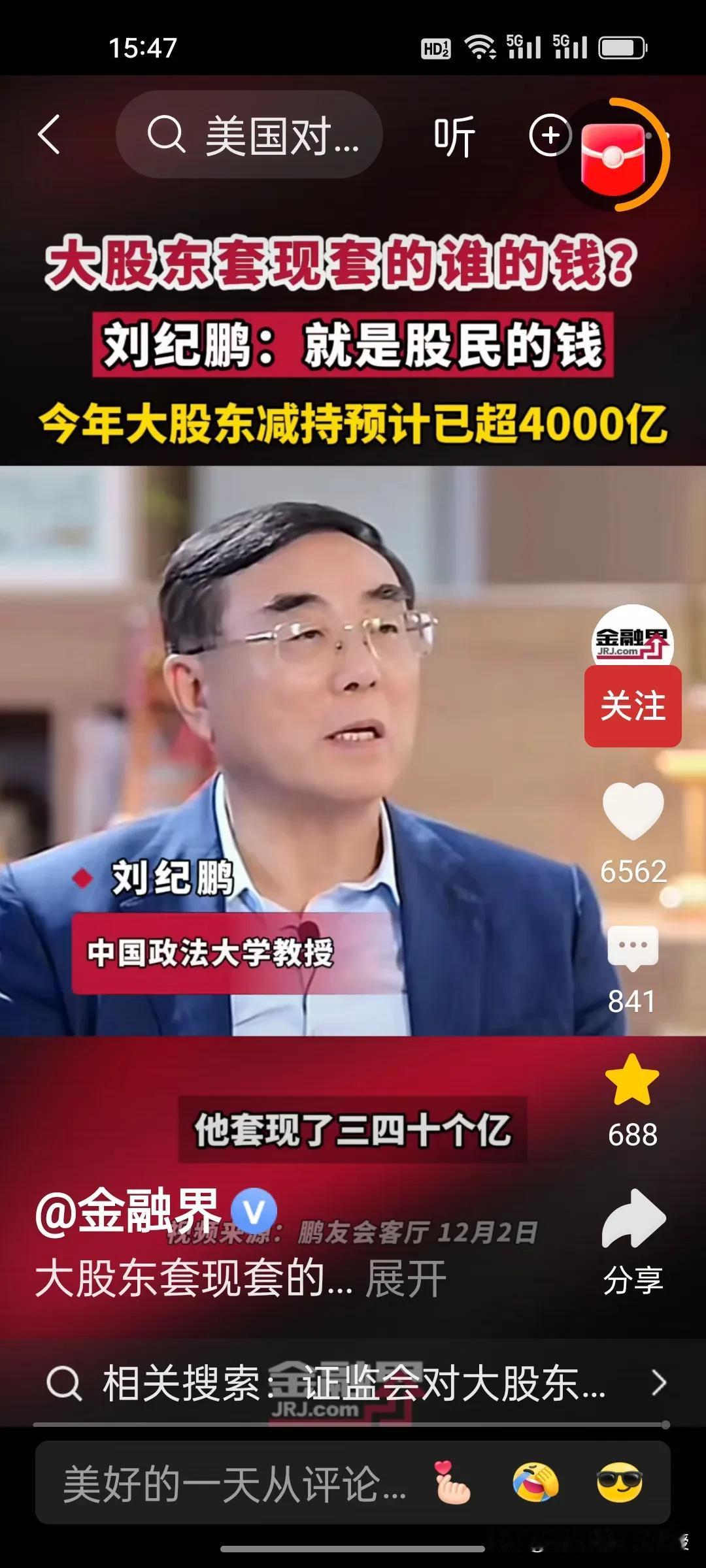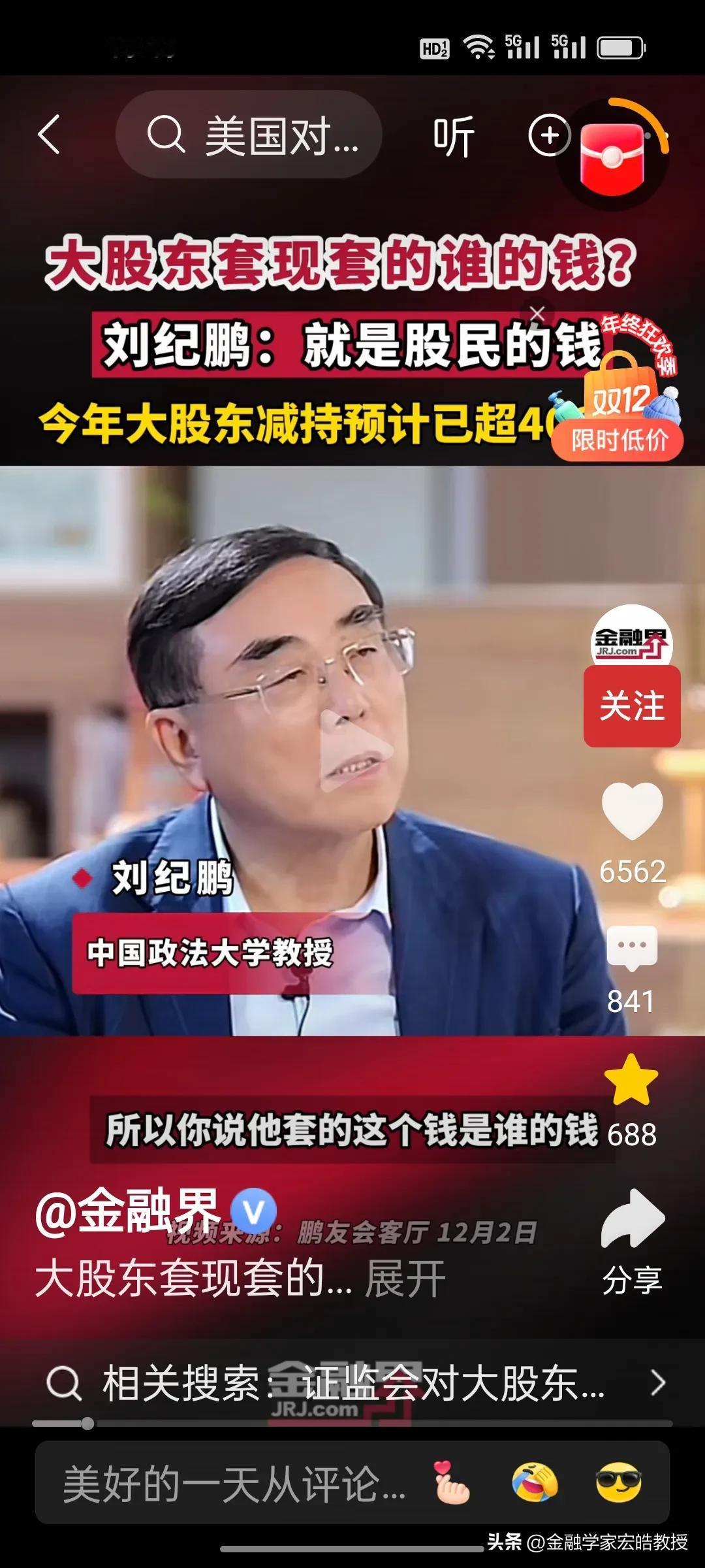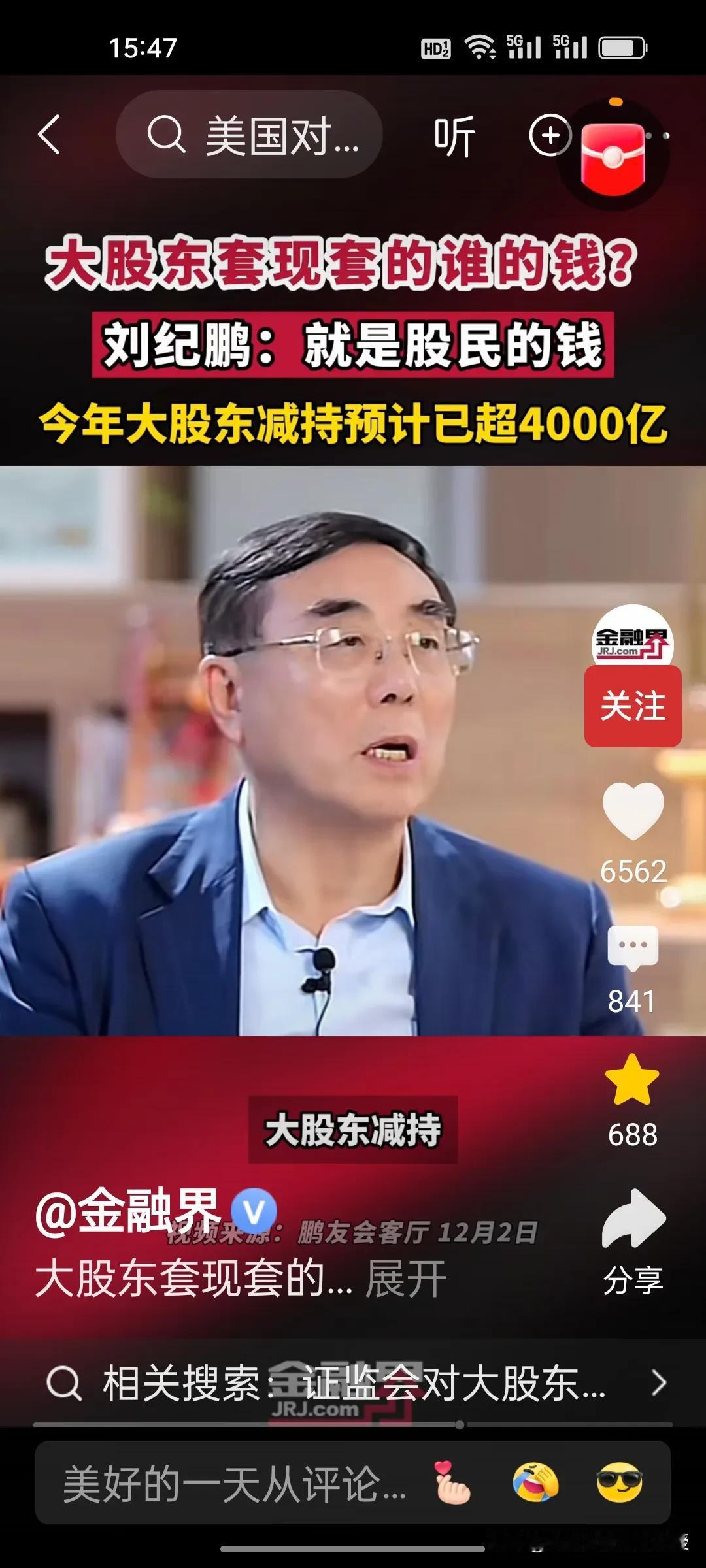 刚刚看到刘纪鹏教授视频,解释了大股东减持的是谁的钱?刘教授说就是股民的钱。 美股资本市场总市值是中国的近五倍,将近500万亿,而中国股市总市值100万亿。美股在今年上半年减持合计约515亿美元(约合人民币3678亿元),而刘纪鹏教授称国内的资本市场,今年大股东减持已经4000亿了,已经超过美股的减持数量,减持后,这些人的心都不在上市公司了。 昨天,证监会出台了首部关于上市公司监管的法规,里面提到了一条,“规范表决权让渡、放弃,以及大股东、特定股东减持等行为”。刘纪鹏教授的担心总算是有了回应。