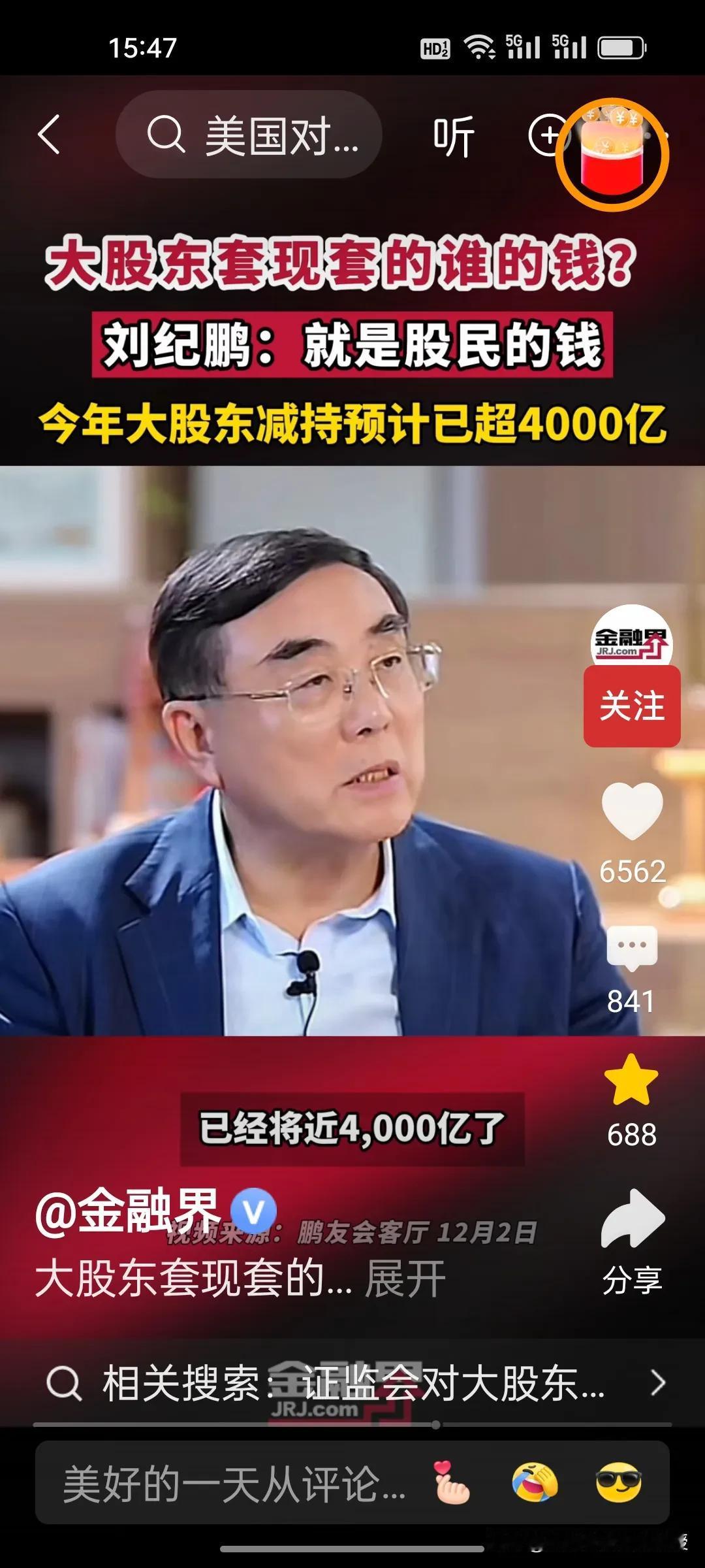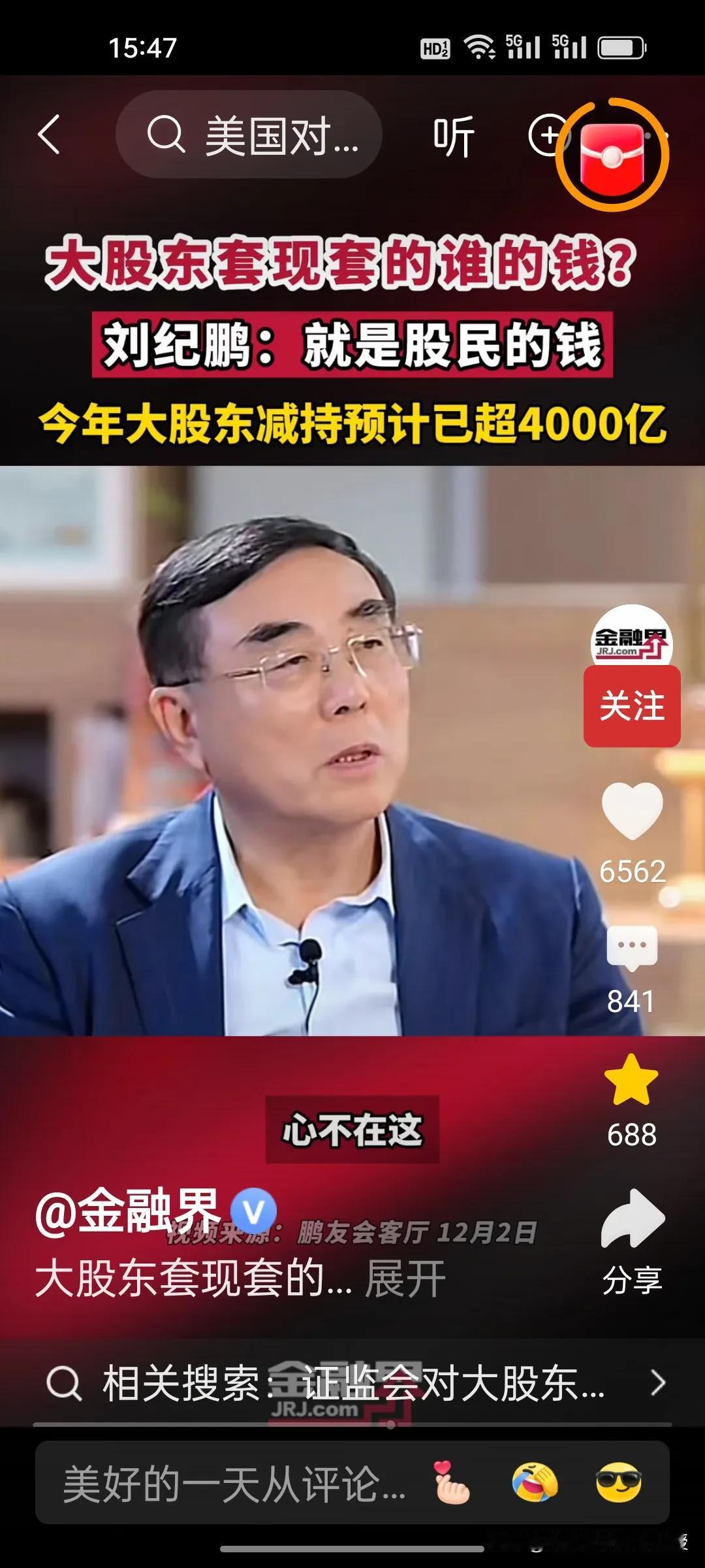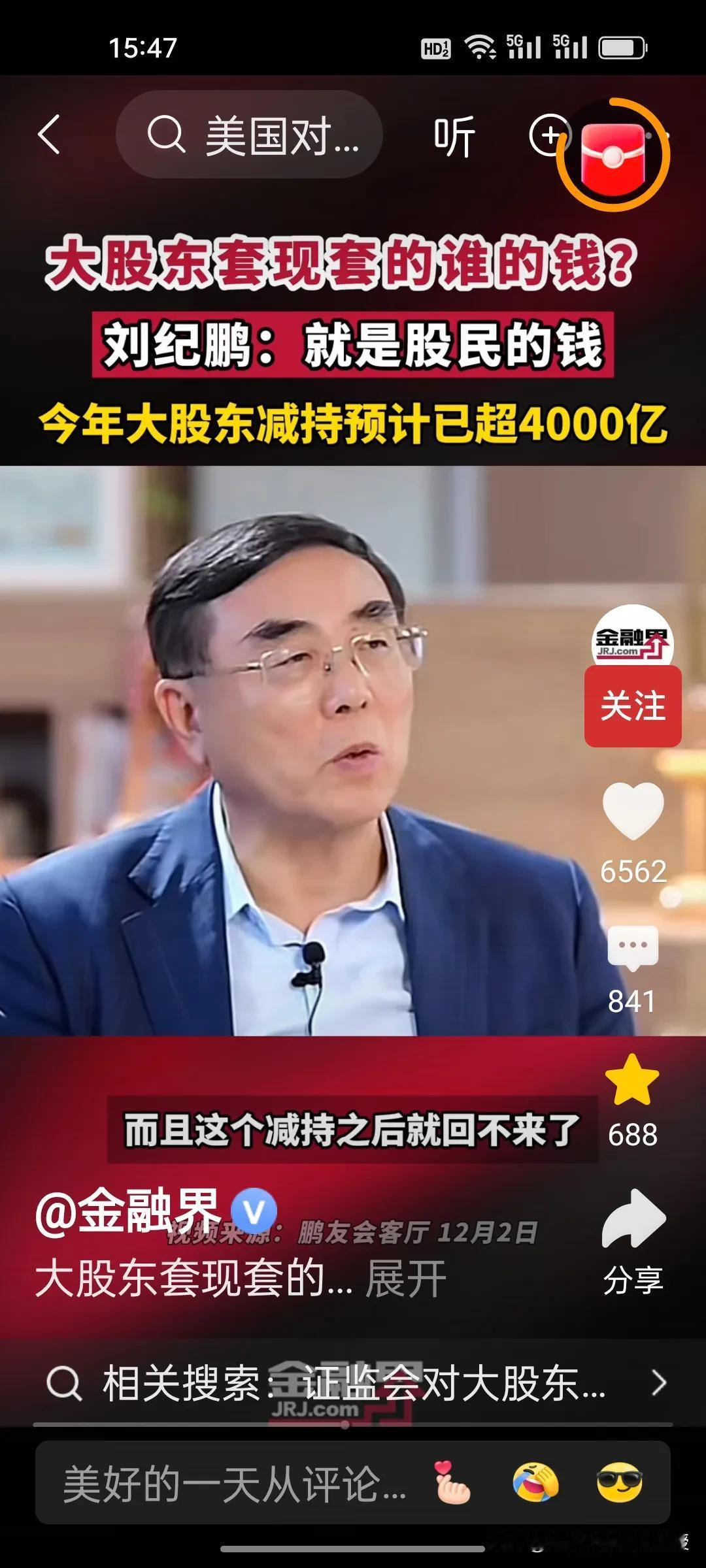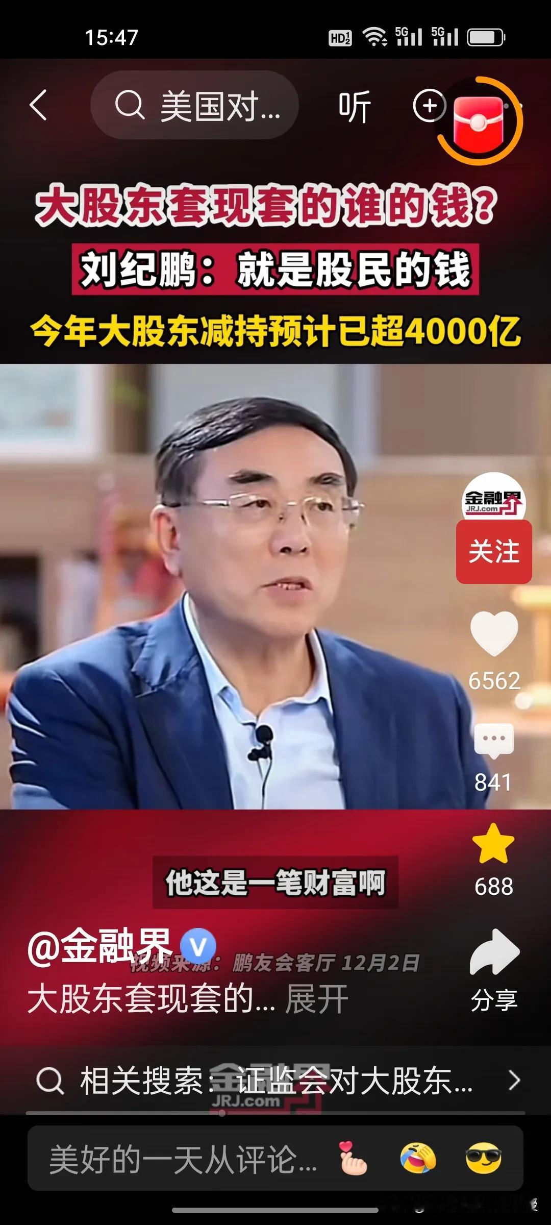 刚刚看到刘纪鹏教授视频,解释了大股东减持的是谁的钱?刘教授说就是股民的钱。 美股资本市场总市值是中国的近五倍,将近500万亿,而中国股市总市值100万亿。美股在今年上半年减持合计约515亿美元(约合人民币3678亿元),而刘纪鹏教授称国内的资本市场,今年大股东减持已经4000亿了,已经超过美股的减持数量,减持后,这些人的心都不在上市公司了。 昨天,证监会出台了首部关于上市公司监管的法规,里面提到了一条,“规范表决权让渡、放弃,以及大股东、特定股东减持等行为”。刘纪鹏教授的担心总算是有了回应。