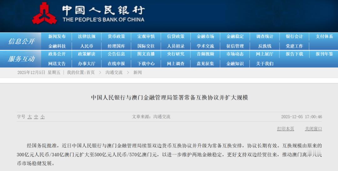 12 月 5 日央行和澳门金融管理局搞了个大动作 —— 把之前的货币互换协议升级了,额度从 300 亿提到 500 亿,而且以后不用年年续签,长期有效!可能有人听不懂 “货币互换” 啥意思,其实说白了,就是内地和澳门互相 “借钱” 更方便了,而且是直接用人民币和澳门元换,不用绕美元。 先说说这事儿对企业和普通人的好处。比如内地企业去澳门做生意、搞旅游合作,以前可能得先把人民币换成美元,再换成澳门元,又麻烦又要花手续费,还得担心美元汇率忽高忽低亏了钱。现在有了这个 500 亿的 “资金池”,两边企业直接用人民币或澳门元结算就行,省了中间环节,成本少了,生意也更好做。对去澳门旅游的朋友来说,以后换澳门元可能更方便,汇率也更稳定,不用怕去一趟汇率波动亏了差价。 再说说大方向的意义。澳门本来就是咱们和葡语国家(比如葡萄牙、巴西这些)做生意的桥梁,现在钱多了、合作时间也长期稳定了,更多外国企业可能会通过澳门用人民币做交易,咱们的人民币在国际上更吃香了。而且这也能帮澳门经济更稳定,比如遇到资金紧张的时候,能快速拿到人民币支持,不用慌。 简单总结下:这 500 亿就像内地和澳门金融市场的 “互助金”,既让跨境做生意、旅游更划算方便,又能帮人民币走出去,还能撑住澳门的经济稳定,算是一举多得的好事!
