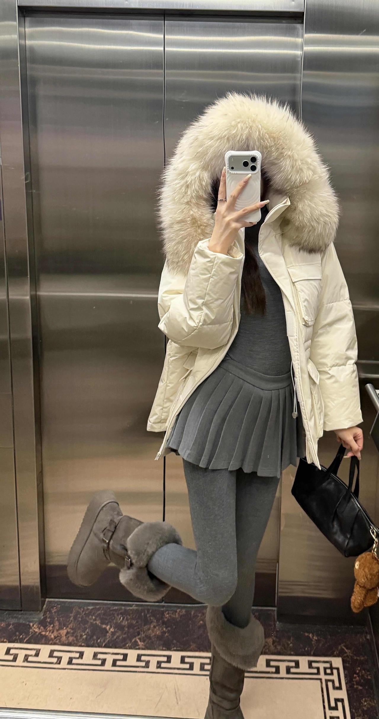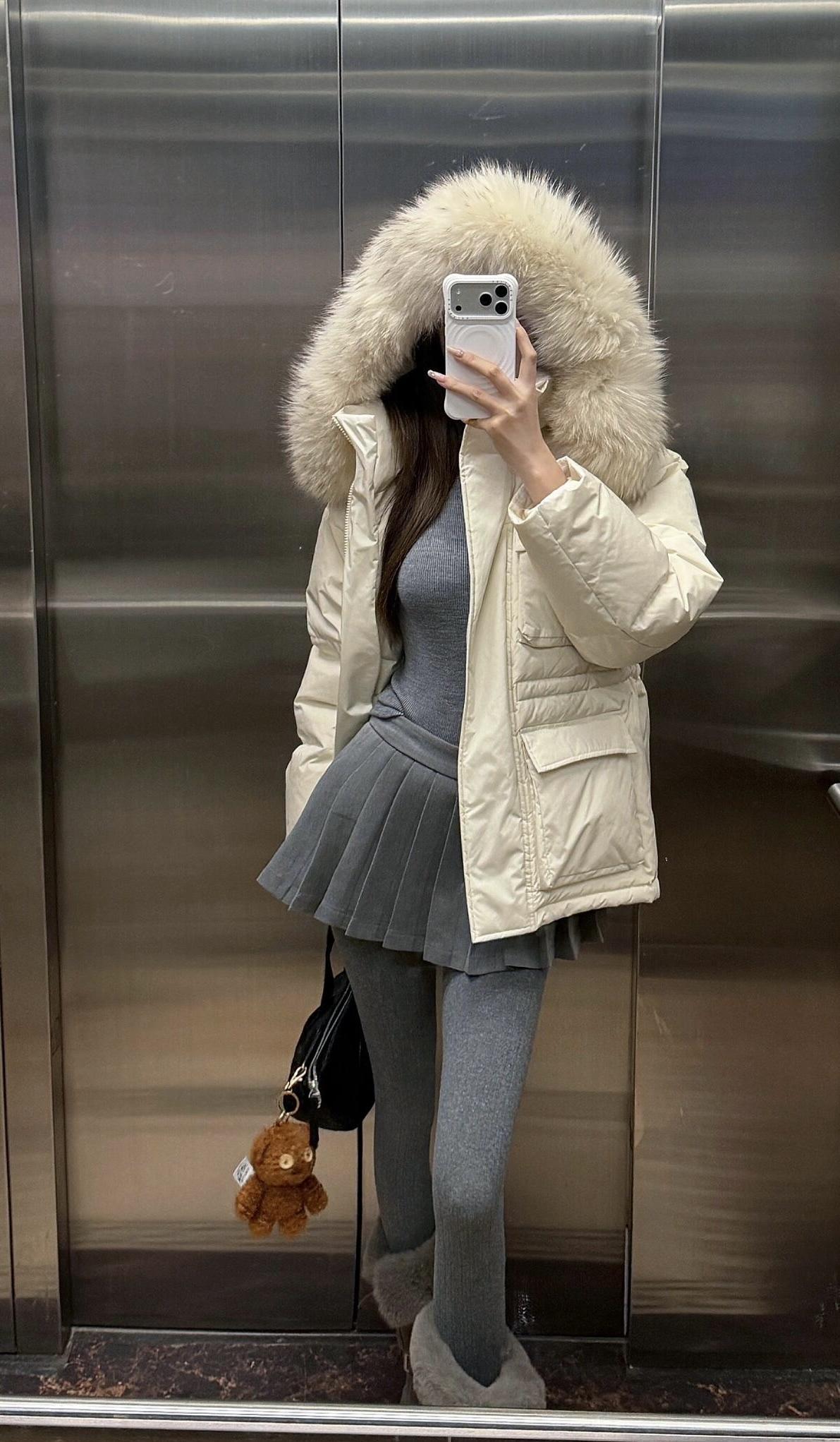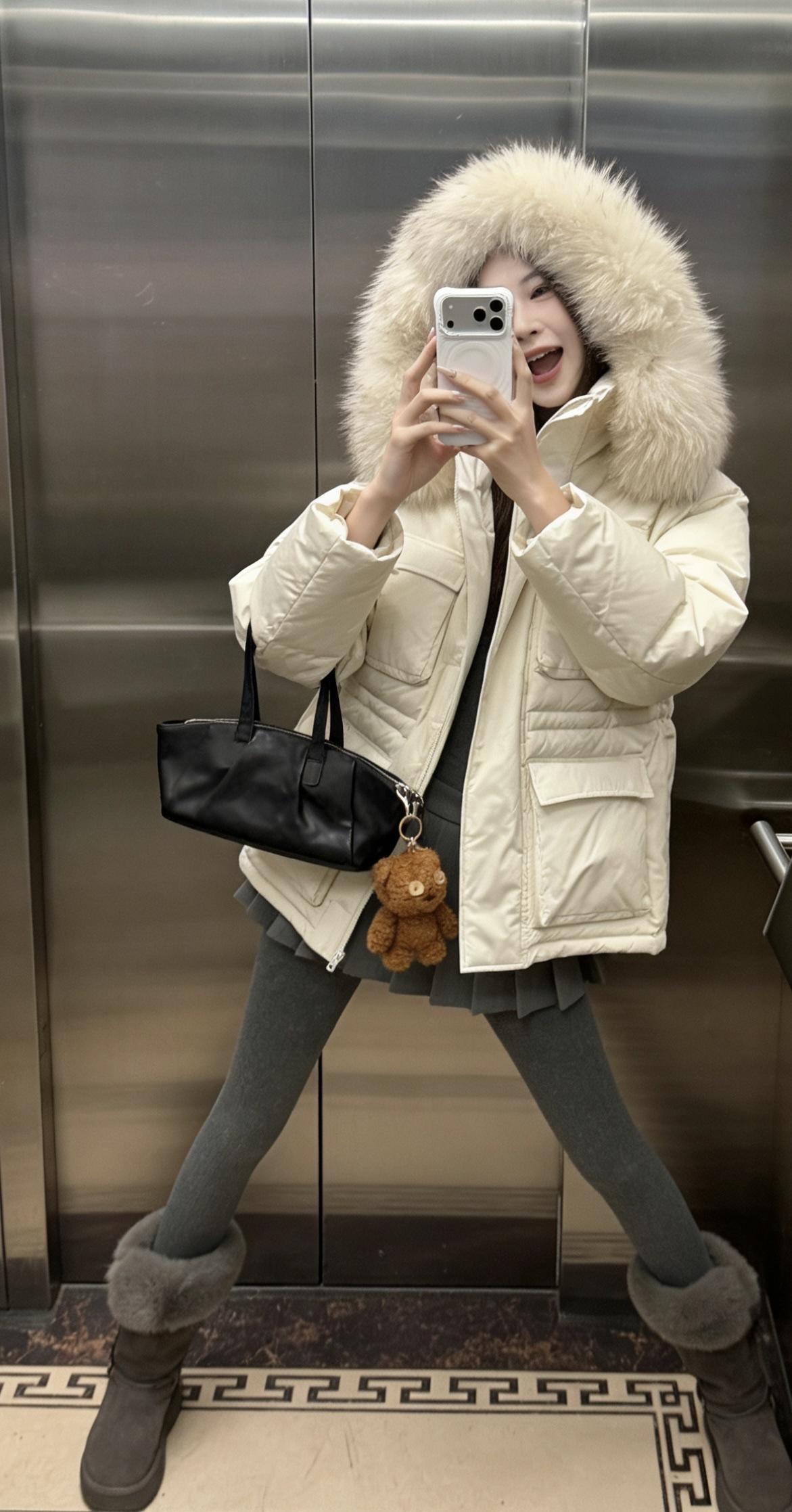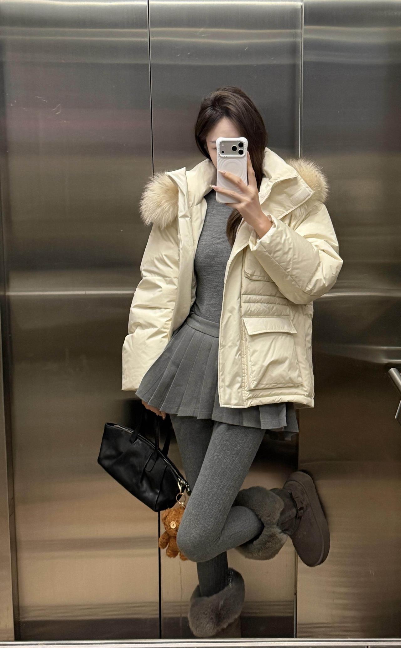 今日穿搭推荐冬季温柔休闲风,整体搭配既保暖又有少女感: 上衣:米白色大毛领羽绒服(蓬松保暖+毛领增加精致感)+灰色针织修身内搭(贴合身形,避免臃肿); 下装:同色系灰色百褶短裙+灰色紧身裤(“上宽下紧”的搭配显利落,短裙中和了羽绒服的厚重感); 配饰:黑色手提包+毛绒雪地靴(实用保暖,小熊挂饰增添可爱细节)。 适合场合:日常通勤、逛街、约会、一般聚会。温柔又有氛围感,轻松拿捏休闲甜妹感。