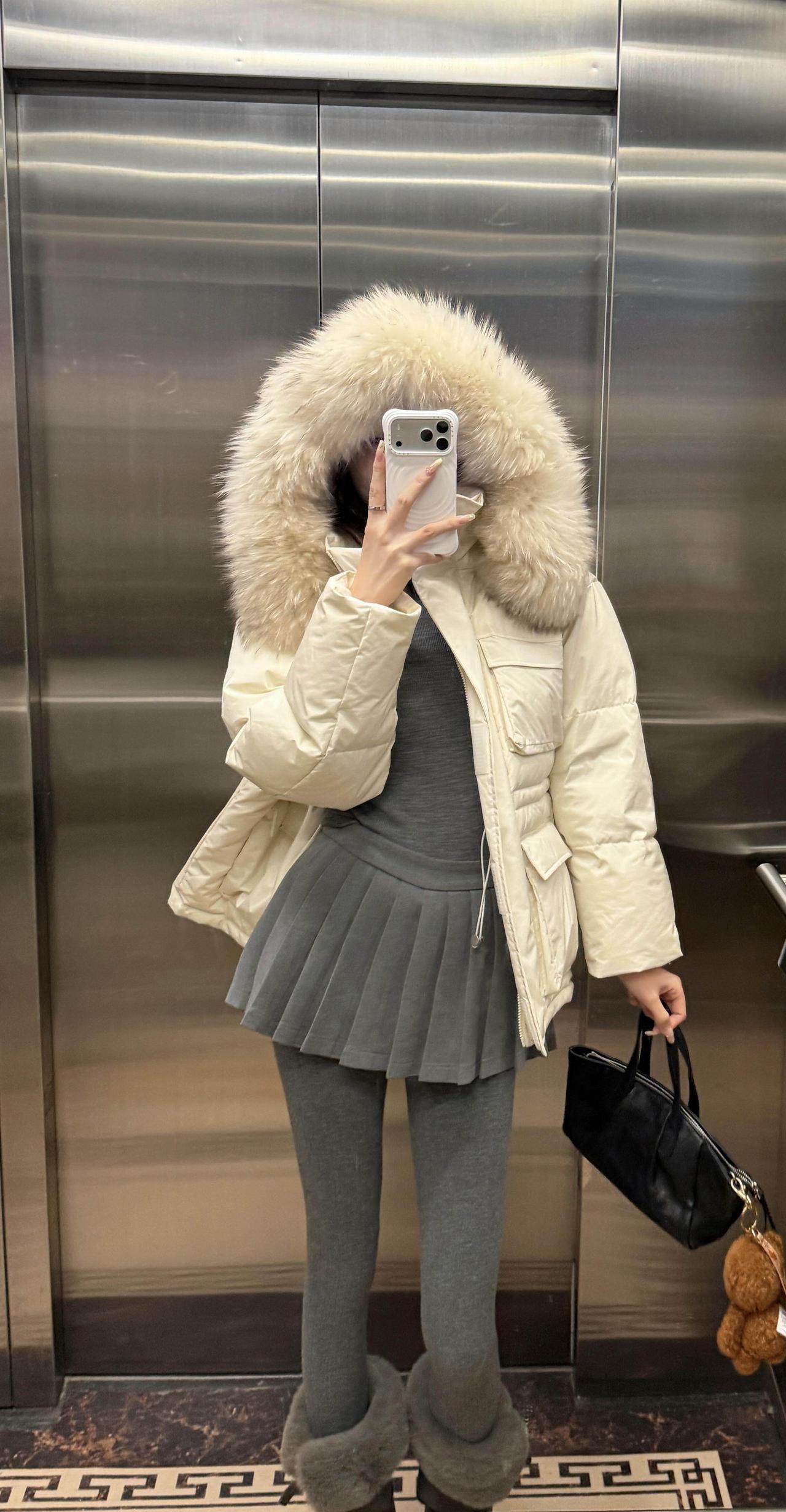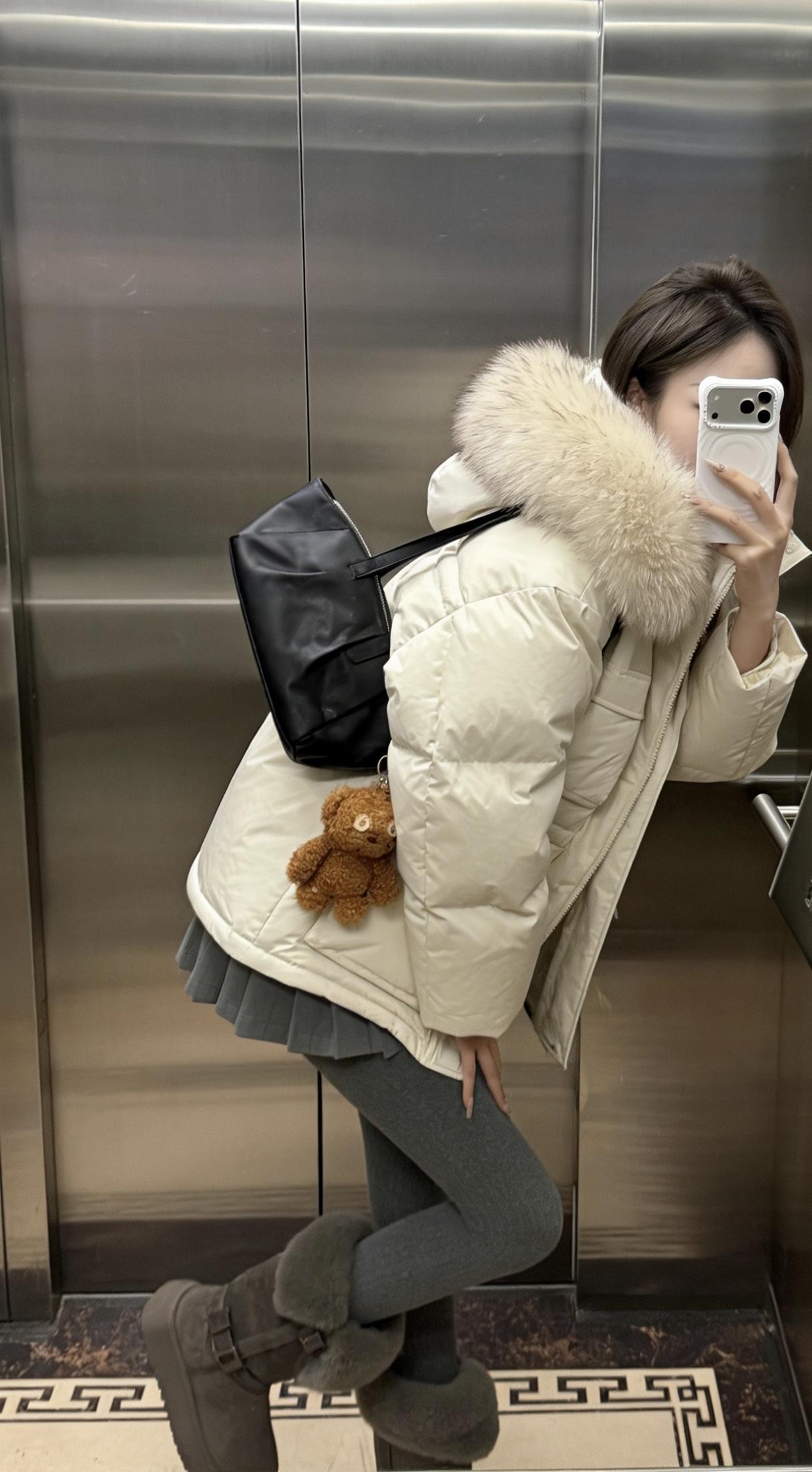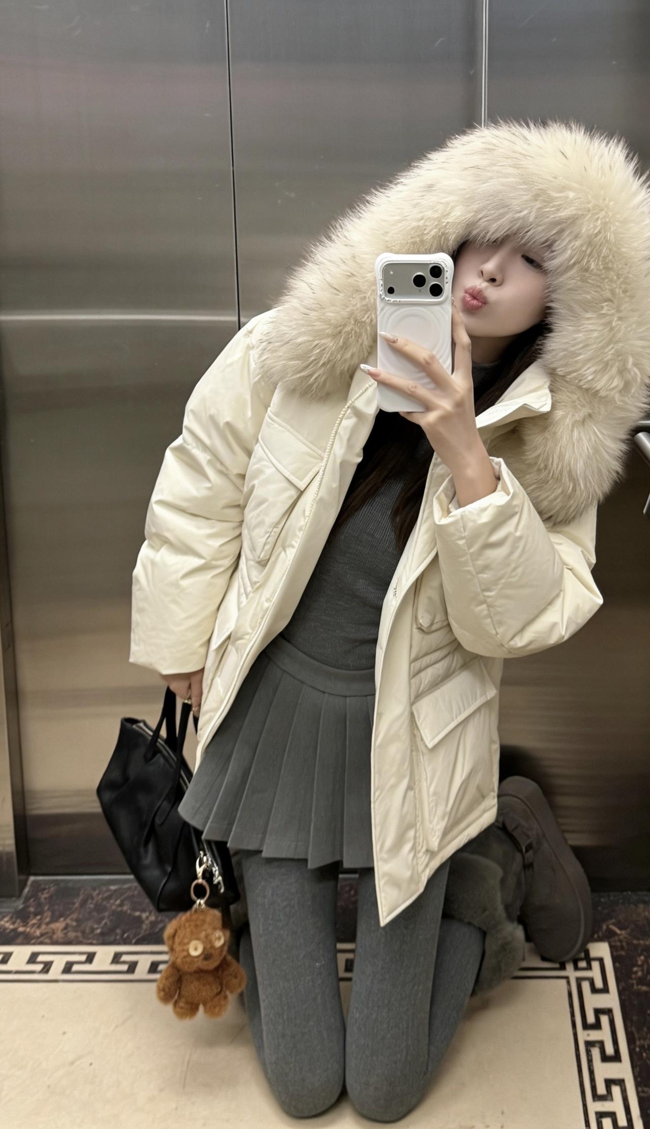 今日穿搭推荐冬季温柔休闲风,整体搭配既保暖又有少女感: 上衣:米白色大毛领羽绒服(蓬松保暖+毛领增加精致感)+灰色针织修身内搭(贴合身形,避免臃肿); 下装:同色系灰色百褶短裙+灰色紧身裤(“上宽下紧”的搭配显利落,短裙中和了羽绒服的厚重感); 配饰:黑色手提包+毛绒雪地靴(实用保暖,小熊挂饰增添可爱细节)。 适合场合:日常通勤、逛街、约会、一般聚会。温柔又有氛围感,轻松拿捏休闲甜妹感。