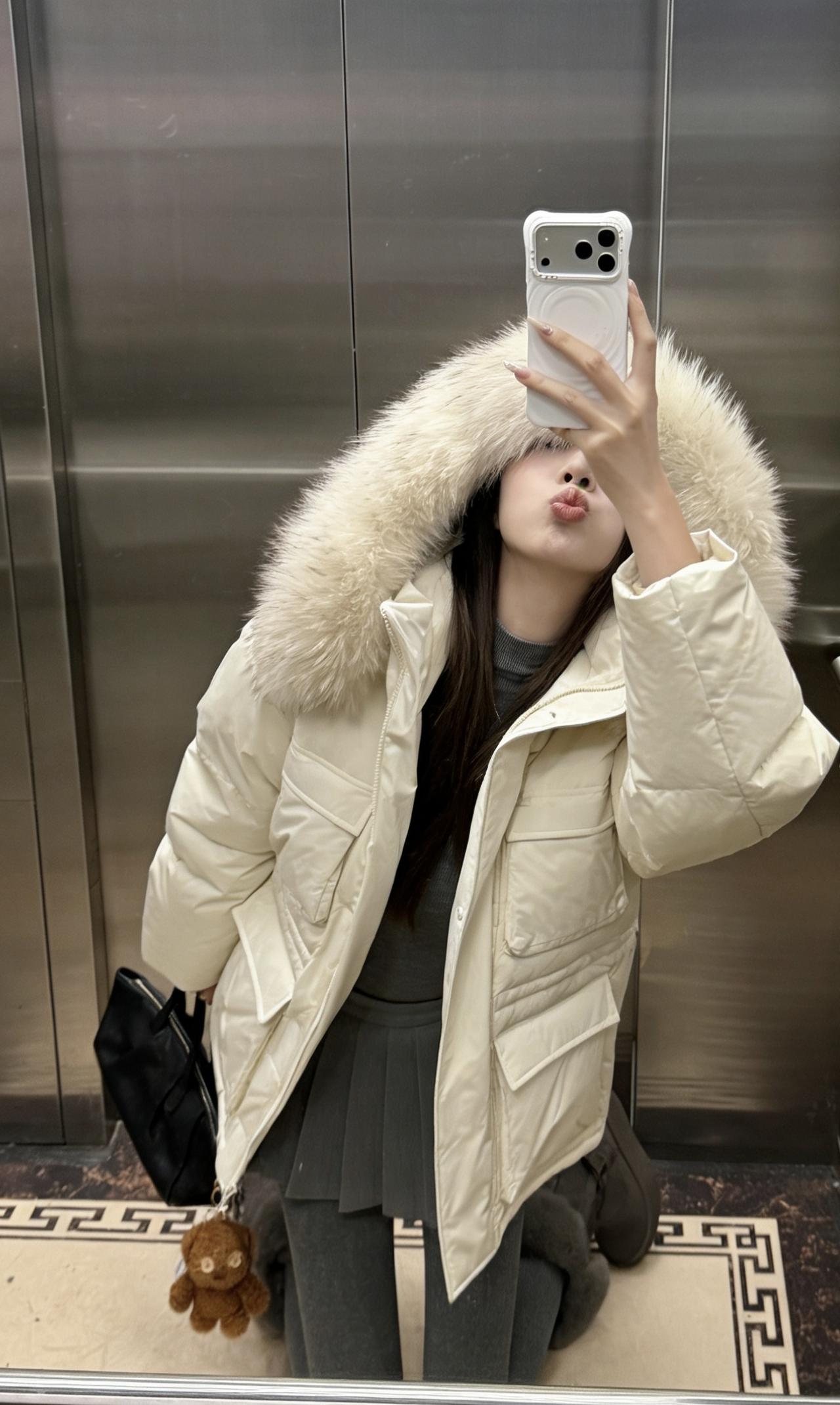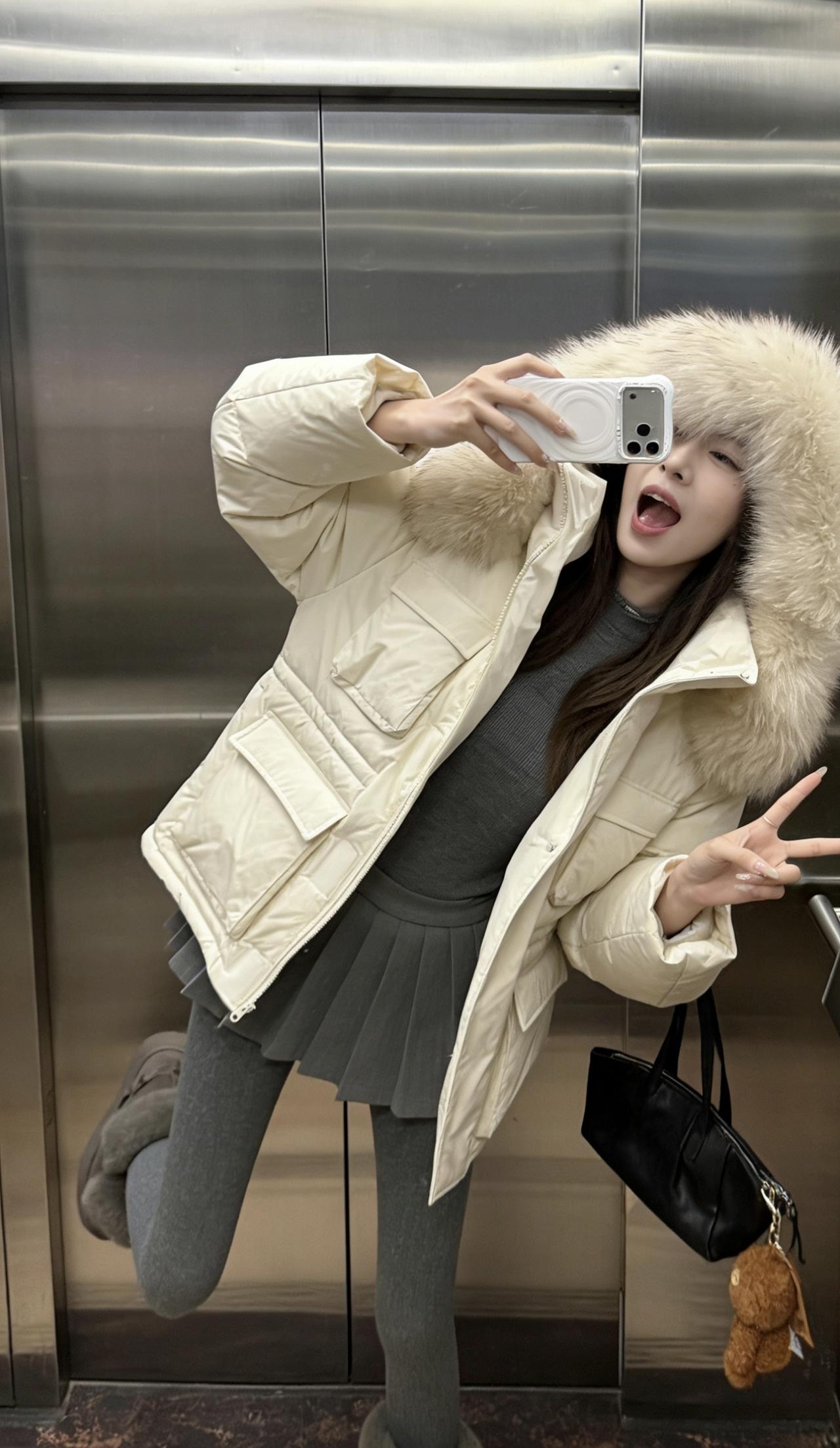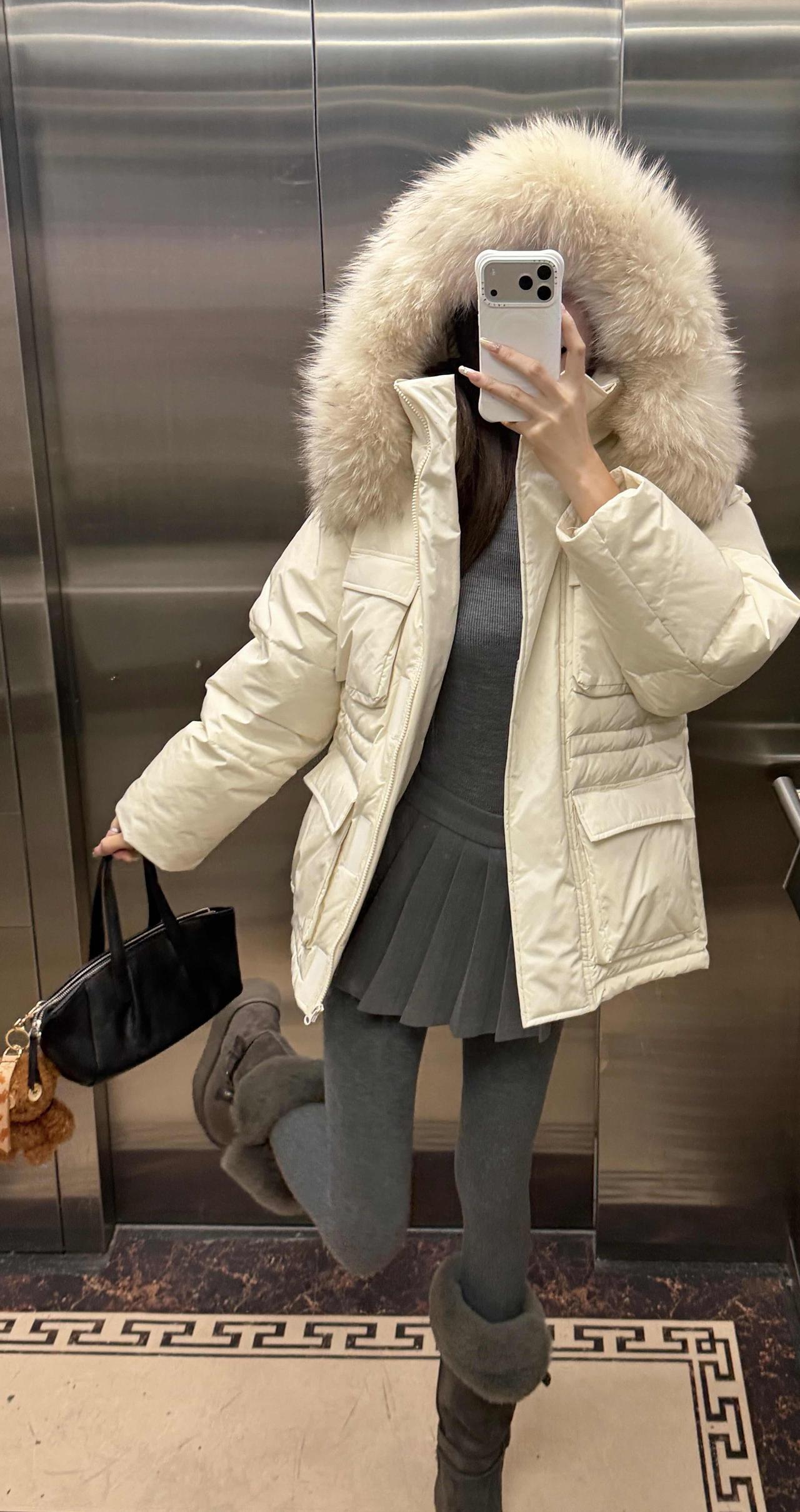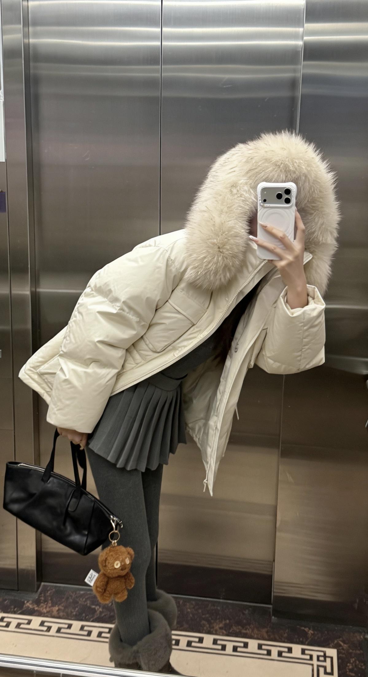 今日穿搭推荐冬季温柔休闲风,整体搭配既保暖又有少女感: 上衣:米白色大毛领羽绒服(蓬松保暖+毛领增加精致感)+灰色针织修身内搭(贴合身形,避免臃肿); 下装:同色系灰色百褶短裙+灰色紧身裤(“上宽下紧”的搭配显利落,短裙中和了羽绒服的厚重感); 配饰:黑色手提包+毛绒雪地靴(实用保暖,小熊挂饰增添可爱细节)。 适合场合:日常通勤、逛街、约会、一般聚会。温柔又有氛围感,轻松拿捏休闲甜妹感。