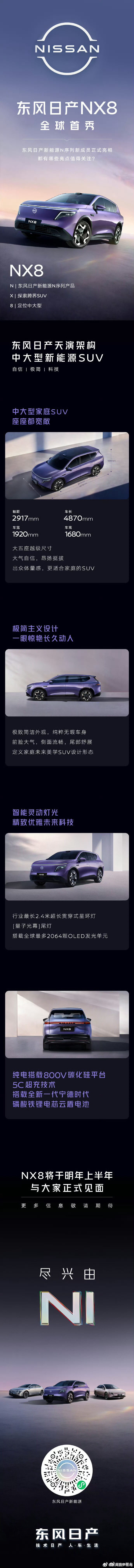 东风日产的N系列SUV也来了N8X 有两个版本搭载宁德时代电池 800V 5C超充磷酸铁锂上次有跟日产的同学们交流过日产N系列车型已经纯粹是中国团队在做了产品力可以从N6和N7上看可见一斑这次N8X看起来也有爆款潜质明年来看的话,SUV的市场会比轿车更激烈NX8东风日产中大型新能源SUV东风日产