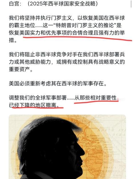 看见美国这一动作,估计高市早苗拔凉拔凉的!12月5日,美国白宫发布了最新版的《国家安全战略》,而该战略明确表示,我们将坚持并执行门罗主义,以恢复美国在西半球的主导地位。这一特朗普对门罗主义的阐明,被视为美国的强势回归,也是其战略收缩的信号。 这份文件一出,华盛顿在做什么就清楚了。所谓“新门罗主义”,说白了就是不再远征,而是守住老家,从文件内容到军事动作,美国的调整已经非常明显 。那些常年部署在日本的关键装备正在一件件被撤回。宙斯盾陆基导弹、堤丰导弹系统悄然运走,原本说好的驻日美军司令部升级也被取消,美军扩编计划更是直接搁置,日本原以为这是短暂喘息,但事实说明,美国压根没打算回来。 这些变动,意味着美国的战略重心正在离开印太。过去几年,美国借“重返印太”挑起地区紧张,让日本当先锋打头阵,可现在,美国突然回身,把资源和注意力重新锁定在西半球。 它在文件中写得明明白白,要防止“非半球国家”在美洲有军事存在,甚至要重新配置全球部队——这就是在告诉盟友:我们顾不上你们了。 对于日本,这是一盆彻底的冷水。美国的撤离,让日本的安全幻觉瞬间破碎,日本的情报、指挥、后勤几乎都靠美军支撑,一旦美军收缩,日本的自卫队立刻陷入“缺心少脑”的状态。即便装备再先进,没有情报支持和后勤补给,也成不了气候。 高市早苗的尴尬正出在这里。她在政治上的强硬,全都建立在“美日同盟牢不可破”的幻想上,可美国现在在忙着修自己的后院,根本没空给她撑腰,那些原本靠着“美国会帮我们”的自信,如今变成了彻彻底底的空话。美国要的是自身安全,日本则成了可以被舍弃的筹码。 这是美国国力下降后的必然选择。钱不够、军力分散,再想两头押已不现实,与其吃力维持全球存在,不如回到身边的领地重新加固。 问题是,这一步虽然对美国有利,却让日本彻底失去平衡,过去它在美国的旗帜下敢说敢动,现在才发现,如果惹出祸事,美国未必会帮它收拾残局。 对于我们来说,美国的战略收缩其实提供了一个新的观察窗口,亚太的安全格局正在重新洗牌,美国退一步,日本就得自己面对现实。 美国的门罗主义,表面看是巩固西半球主导地位,实际上是一种保命计划,而在这场权力重新分配的过程中,东亚不会逆流而下。 对于中国而言,只需稳住自身节奏,看清对方动向,该准备的准备好,该应对的应对到位。谁在重组联盟,谁在撤退,这些变动最终都会改变地区格局。