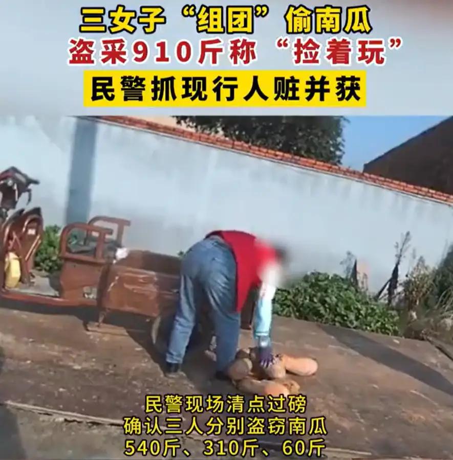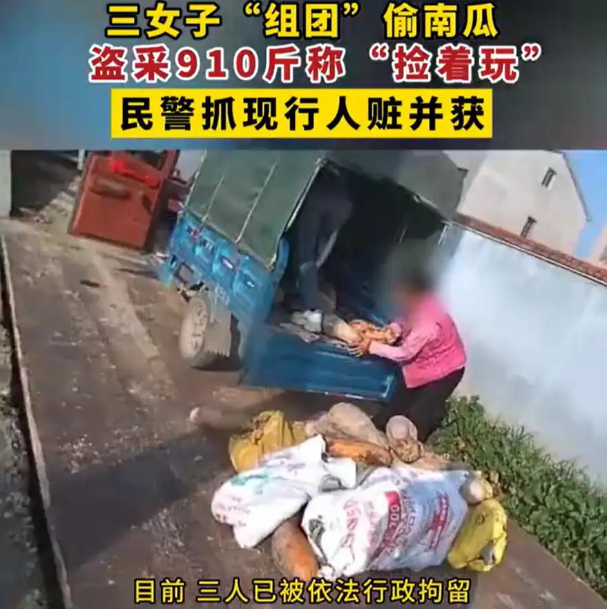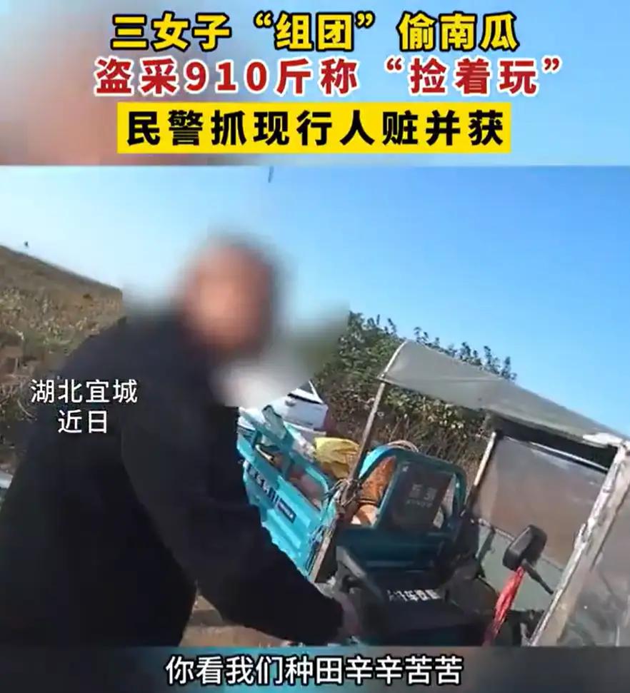 湖北宜城,三名女子开着三轮车组团去偷偷南瓜,结果被农户当场抓个正着,谁知三人不但没有道歉,反而说自己是“捡着玩,农户也没惯着,直接报警,民警到场清点后,三名女子直接被带走拘留。 据了解,事发当天,这三名女子驾驶三轮车来到当地一处农田,趁农户不备,偷偷采摘地里的南瓜,以为神不知鬼不觉,却没想到被巡查的农户抓了个正着。 面对农户的质问,三人丝毫没有愧疚之意,反而辩称自己只是捡着玩,觉得摘几个南瓜算不上什么大事,试图用这种借口蒙混过关。 农户见三人态度蛮横,根本没有认识到自身错误,也不愿私下调解,当即选择报警处理。 民警赶到现场后,对三名女子采摘的南瓜进行了清点,确认其行为已构成盗窃,三人这才面露悔色,但为时已晚。 最终,三名女子因盗窃行为被依法处以拘留处罚。 这起事件也提醒大家,勿以恶小而为之,即使是看似不起眼的财物,盗窃行为也会受到法律的惩处,遵守法律和社会公德应是每个人的基本准则。