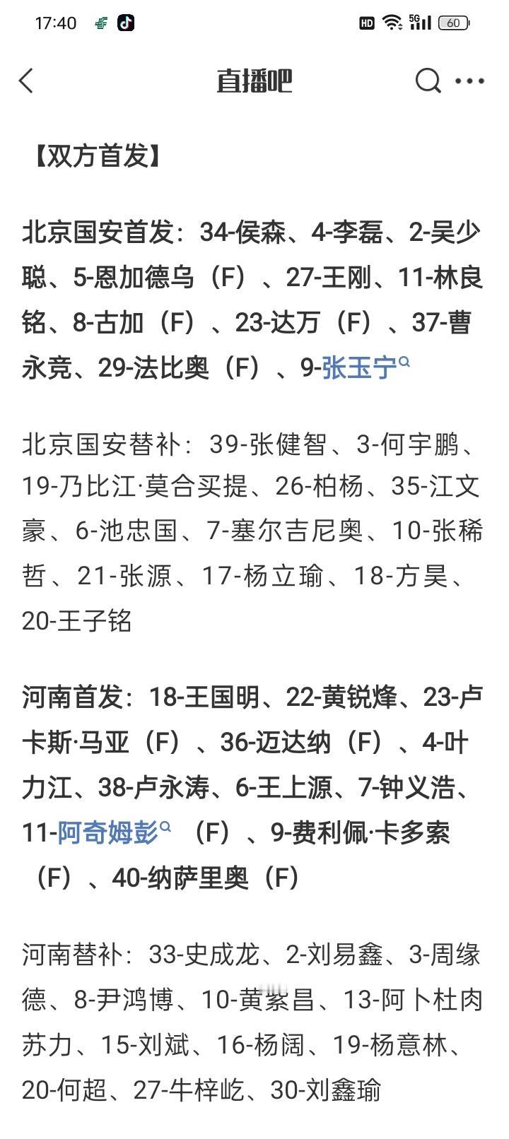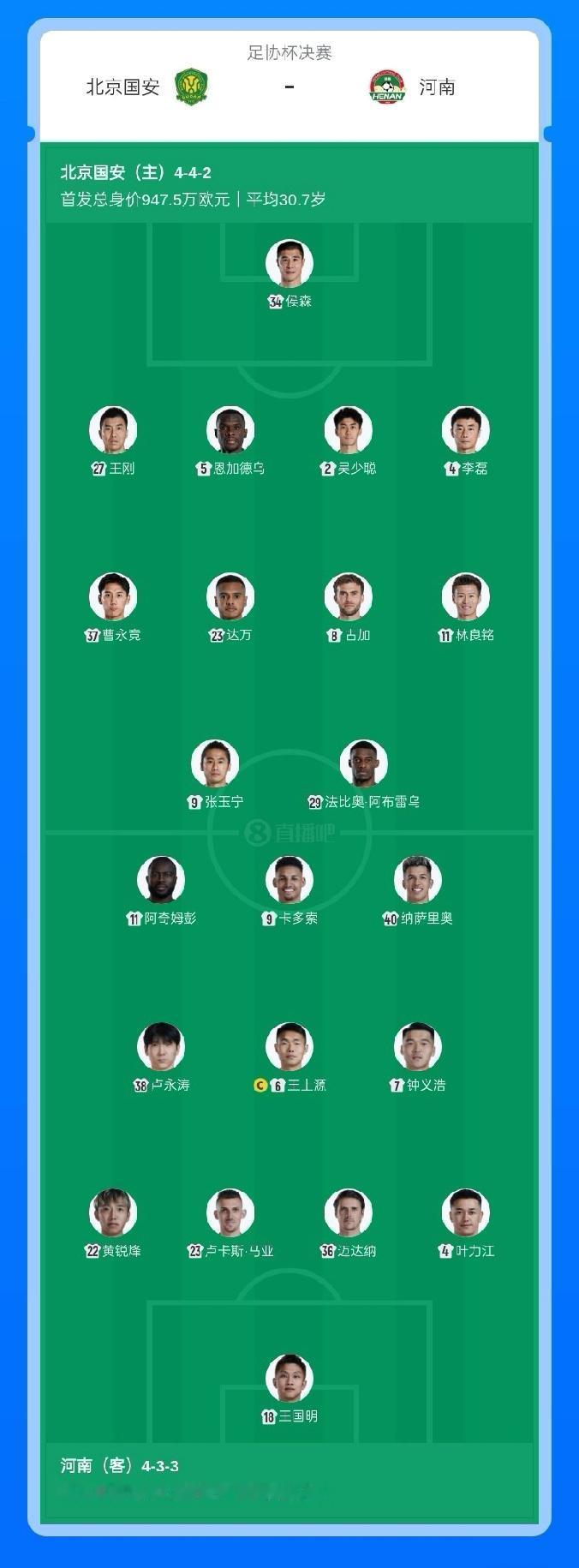 足协杯决赛-国安vs河南首发:张玉宁、法比奥、林良铭先发,阿奇姆彭、费利佩、纳萨里奥出战 12月06日19:00,2025足协杯决赛,北京国安vs河南队在苏州奥体中心体育场,赛前,双方首发阵容出炉:北京国安方面:恩加德乌、林良铭、达万、曹永竞、法比奥、张玉宁悉数首发!河南方面:卢卡斯、迈达纳、阿奇姆彭、费利佩、纳萨里奥出战