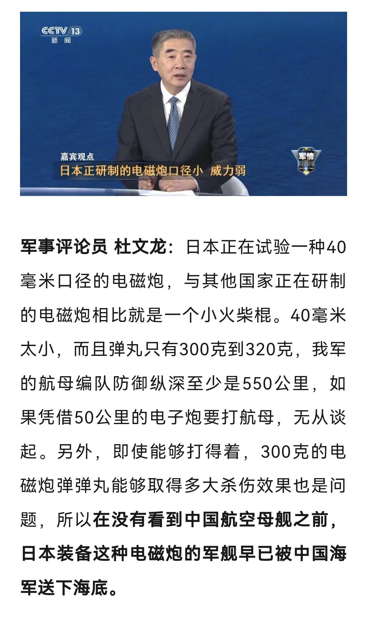 央视军事评论:日本正在研制的电磁炮口径只有四厘米。。跟其他国家相比就是个火柴棍。