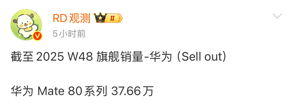 华子Mate 80系列首周销量37.66万台,这个成绩是在备货不足、比友商品牌旗舰晚发布情况下取得的,这个含金量不用多说了吧。