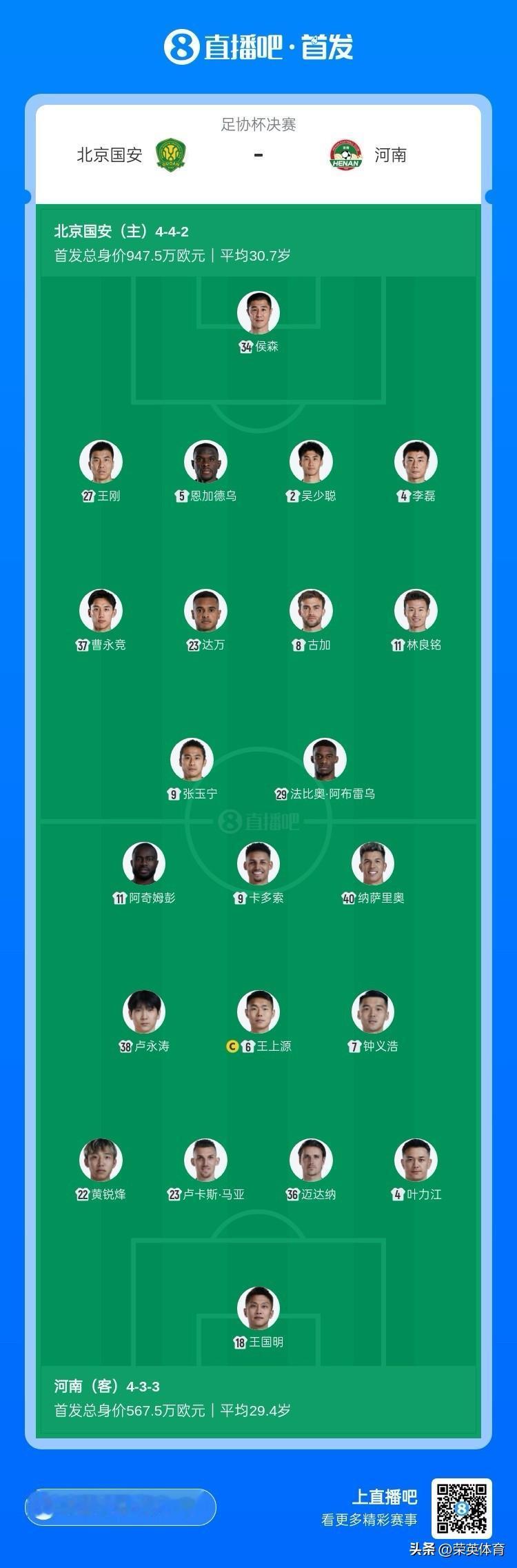 今晚19:00,本年度中国足坛最重要的一场焦点大战将在苏州打响!2025中国足协杯决赛准时开打!这场焦点大战一触即发! 对于本场比赛,河南队极其重视!虽说没有明确表示一定要夺冠!但从赛前的发布会来看!争冠的信心非常足!对冠军的渴望也较迫切! 而北京国安也希望用一座冠军奖杯来完成本年度的完美收官!尽管联赛尾声阶段状态欠佳!再加上亚二联赛出局,球队也希望用足协杯冠军来重振旗鼓! 旦前双方的首发阵容已出!都是主力尽出!下面是双方的首发名单 河南首发 门将 王国明 后卫 黄锐锋 马亚 迈达纳 叶力江 .中场 钟义浩 王上源 卢永涛 前锋 阿奇姆彭 卡多索 纳萨里奥 北京国安首发 门将 候森 后卫 王刚 恩德加乌 吴少聪 李磊 中场 曹永竞 达万 古加 林良铭 前锋 张玉宁 法比奥