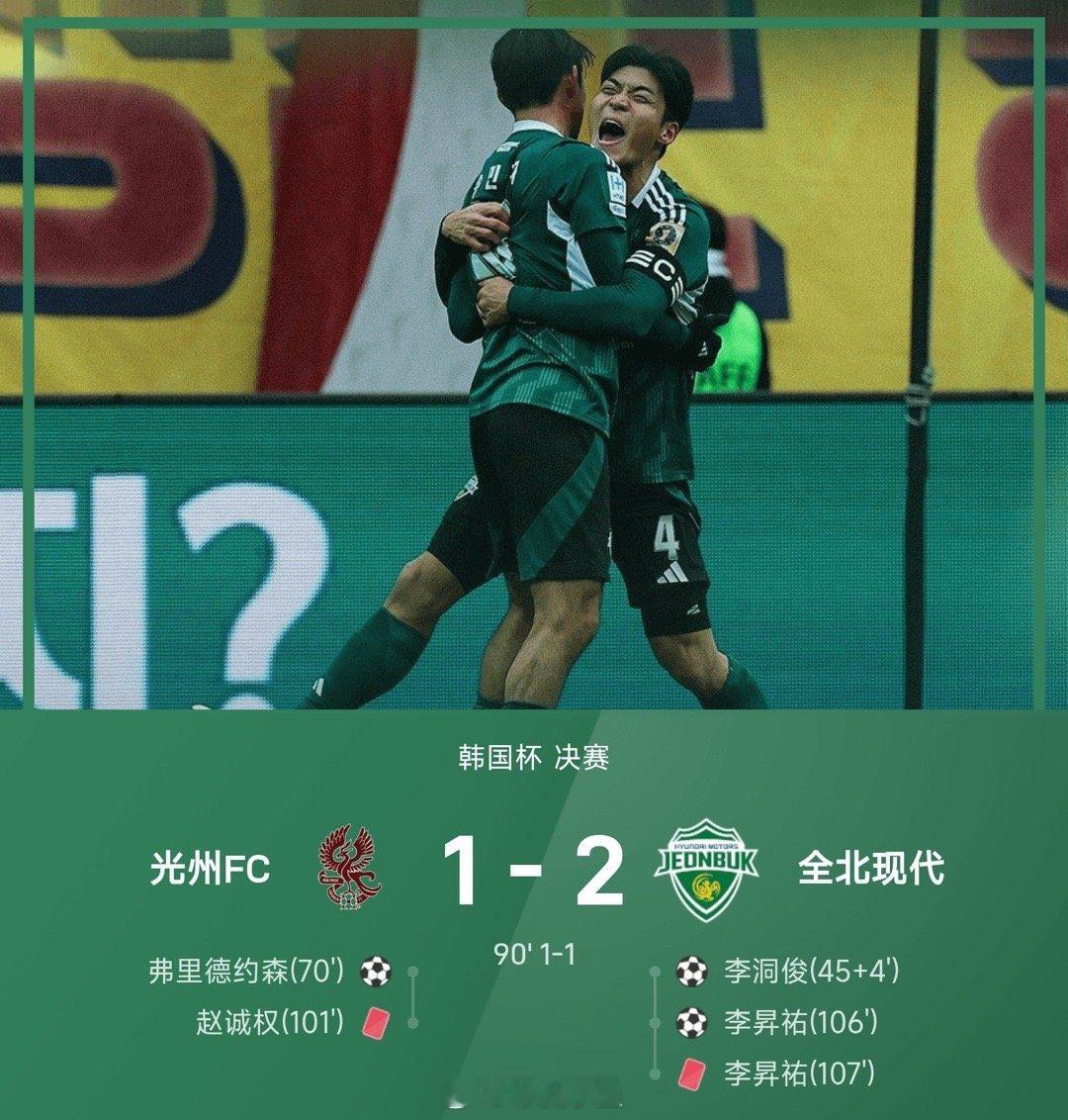 25赛季韩国杯决赛,全北现代经过120分钟加时鏖战,以2-1战胜光州FC。上半场,光州门将金耿民出击失误,李洞俊推射空门为全北现代打破僵局;下半场,弗里德约森为光州扳平比分,两队1-1进入加时赛;加时赛,赵城权肘撞对手染红,李昇祐打入制胜球,但随即也因为冲撞对手染红,最终10打10的情况下,全北2-1取胜夺冠,实现联赛和韩国杯双冠。