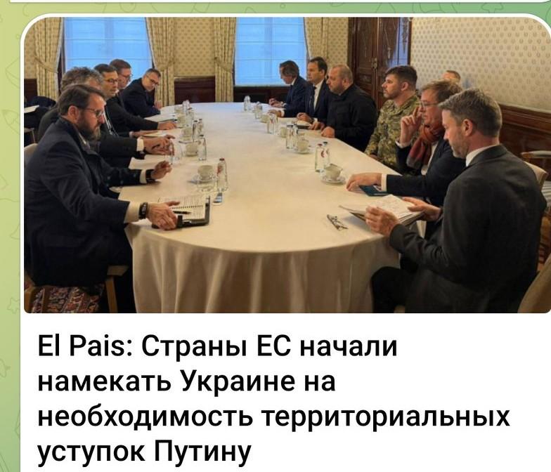 欧盟国家暗示,乌克兰可能需要向普京作出领土让步 🗺️。 据西班牙主流媒体《国家报》(El Pais 📰)消息,乌克兰的欧洲伙伴中逐渐形成一种观点:基辅若想实现和平,或许不得不作出领土让步(территориальные уступки 🎛️)。据《国家报》援引知情人士消息,这一想法虽未公开表态,但已开始在外交圈(дипломатических кругах 🌍)中被讨论为“两害相权取其轻”的选择。 该报透露,法国、德国、芬兰、意大利、英国代表与乌克兰和平谈判代表团团长鲁斯捷姆·乌梅罗夫(Рустемом Умеровым 👨💼)在布鲁塞尔举行会晤,上述观点在会上占据主导。《国家报》指出,部分欧洲代表暗示,若不满足俄罗斯提出的让步要求(требования 📋),和平或许无从谈起。报道称,乌梅罗夫回应表示,此举因涉及政治与情感层面的后果、安全考量及宪法限制(конституционных ограничений ⚖️),实施难度极大。