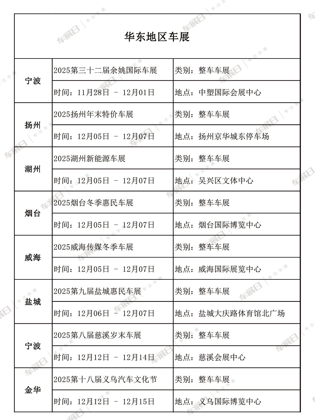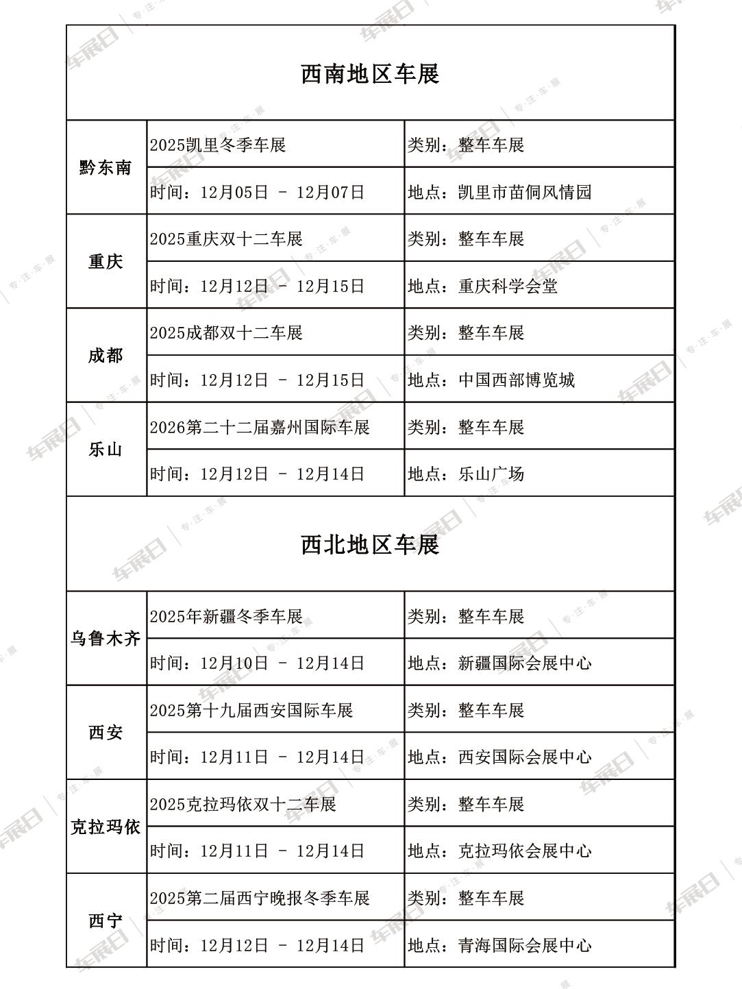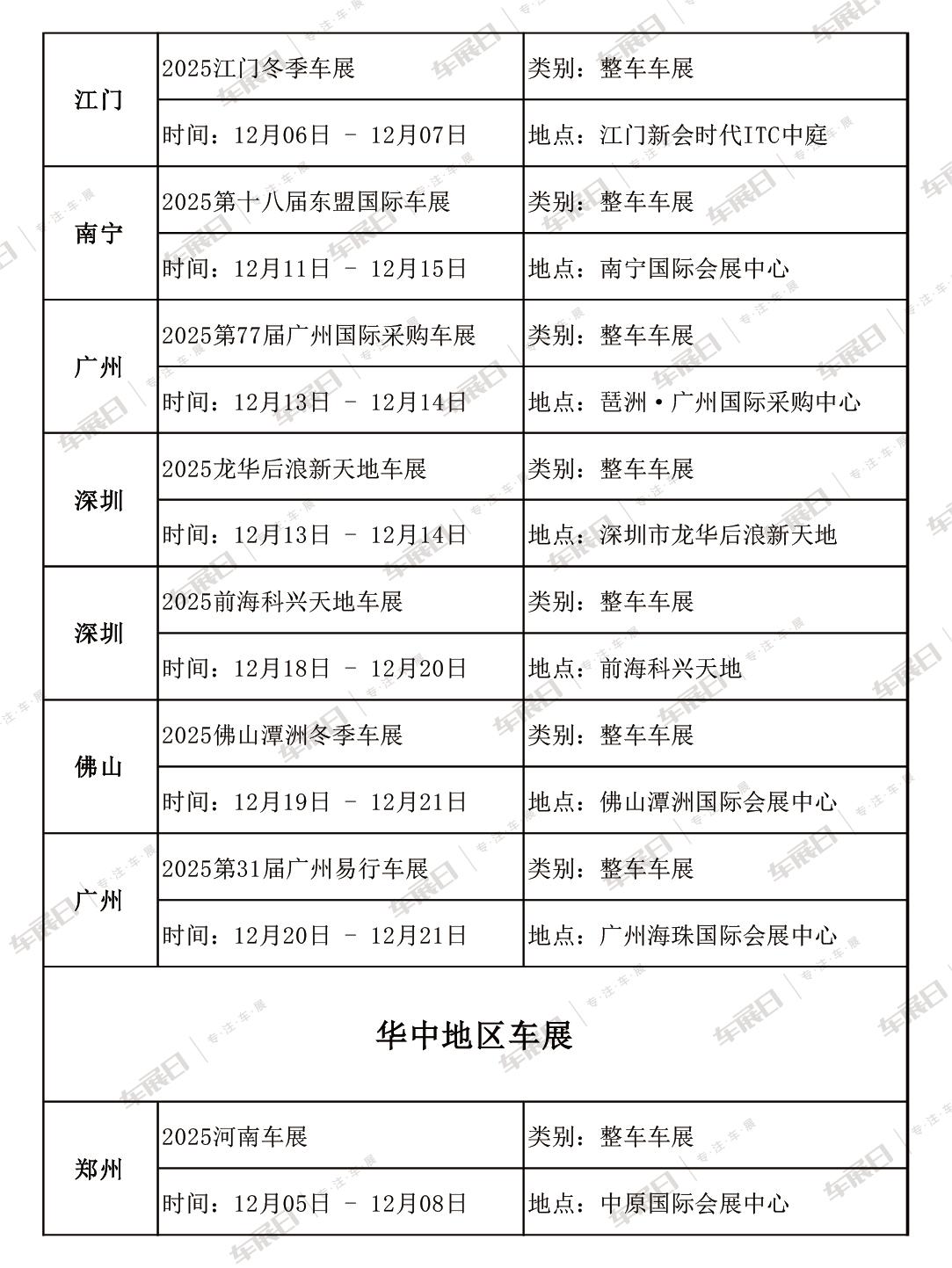 2025年12月全国各地车展排期信息,包括车展时间 、车展举办地点、车展门票领取等。我们的车展信息在不断更新,赶紧收藏起来!东盟国际车展即将盛大启幕,车展门票限时免费领取,@南宁 的朋友们赶紧来领!想了解最新最全的车展信息请留言。【来自懂车帝车友圈】