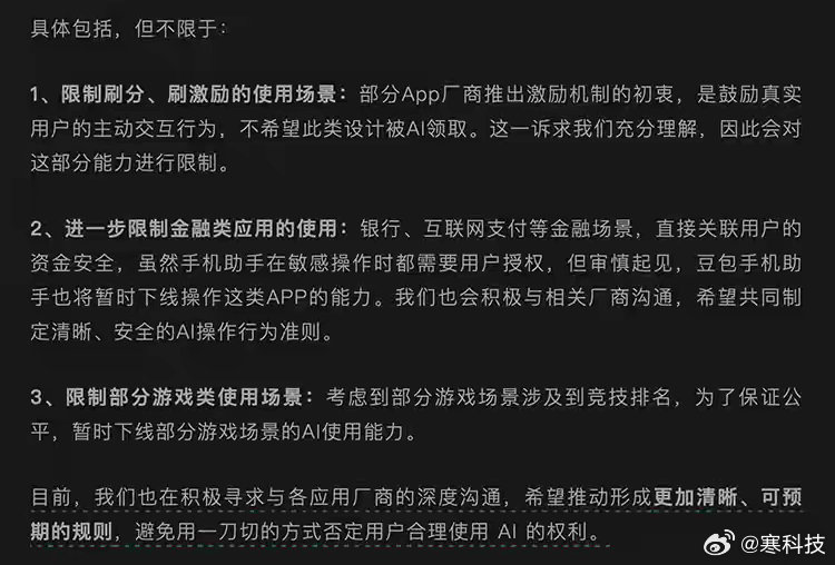 多家APP对豆包手机禁用,现在各品牌手机的涉及第三方应用的AI功能上线没多久也会出现这样那样的限制,豆包手机也没能例外,因为没有一个应用会希望被机器人接管,涉及到了安全、利益、粘性等各个方面 !