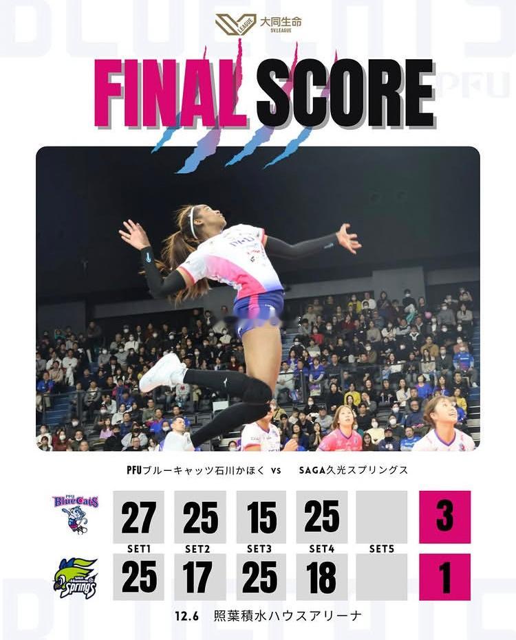 【技术统计】2025-2026日本女排联赛第9轮第一场A久光制药1-3石川PFU蓝猫(25-27 17-25 25-15 18-25)总得分:85-92进攻:57-54拦网:10-10发球:2-3自失:25-16久光制药女排个人得分:史蒂芬妮:31分(66扣26中5失误4被拦、5拦)斯特兰扎利:13分(36扣10中2失误4被拦、1拦2发)荒木彩花:6分(13扣5中2失误0被拦、1拦)中岛咲爱:5分(22扣4中2失误1被拦、1拦)平山诗嫣:5分(13扣4中0失误0被拦、1拦)吉武美佳:5分(18扣4中1失误0被拦、1拦)北窓絢音:4分(19扣4中1失误1被拦)西村弥菜美:15次一传、12到位0失误一传到位率80%、一传效率80%、完美到位率47%清松排球石川PFU蓝猫女排个人得分:巴尔德斯:21分(49扣18中2失误2被拦、3拦)川添美优:15分(42扣12中4失误1被拦、2拦1发)上村杏菜:13分(38扣13中3失误2被拦)横田真未:8分(13扣3中1失误2被拦、3拦2发)川﨑铃奈:5分(14扣4中1失误1被拦、1拦)细沼绫:4分(14扣3中0失误2被拦、1拦)松井珠己:1分(2扣1中0失误0被拦)舩田璃璃香:13次一传、8到位0失误一传到位率62%、一传效率62%、完美到位率38%清松带你看排球2025-2026日本女排联赛