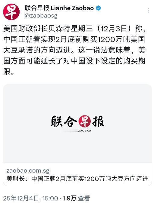 新加坡联合早报12月4日报道:“美国财政部长贝森特星期三称,中国正朝着实现2月底前购买1200万吨美国大豆承诺的方向迈进。这一说法意味着,美国方面可能延长了对中国设下设定的购买期限。” 先看看美国方面的表态,贝森特这番话其实有点“给自己找台阶”的意思。毕竟根据美国农业部11月发布的报告,截至9月11日,中国自2025年5月以来就没采购过美国大豆,新季大豆的订单更是一片空白。这种情况下说“正朝着承诺方向迈进”,延长期限的可能性确实不小。 中国这边的选择其实很现实,不是不想买,而是美国大豆在商业市场上确实没优势。目前美国大豆进入中国还面临23%的关税,这个数字让它在和南美大豆的竞争中很难占到便宜。2025年5月中国单月大豆进口量创下1390万公吨的历史纪录,其中1210万公吨都来自巴西,这个数据就很能说明问题。 巴西大豆这两年简直成了中国市场的“香饽饽”,从南美出口旺季开始后,中国对巴西大豆的采购量一路飙升。6月到8月期间,巴西大豆对华月均出口量都保持在1000万公吨以上,这种稳定的供应让中国企业没必要冒险去买价格更高的美国大豆。 更有意思的是,随着巴西大豆供应开始收紧和价格上涨,中国近期又把目光投向了阿根廷和乌拉圭,从这两个国家预订了额外货量。 德国《油世界》的报告甚至预测,2025年9月至12月期间,中国大豆进口量中的3450万吨将来自南美,而美国大豆的进口量预计为零,和去年同期900万吨的出口量形成鲜明对比。 中国大豆加工商心里有本账,他们很清楚至少到2025年底前,完全可以通过南美进口和动用国储库存来满足需求。 今年7月以来,中国已经从阿根廷采购了至少800万吨大豆,预计到年底还可能再增加600万吨,这个量比2024年同期阿根廷对华出口的250万吨翻了好几倍。 关税波动也给中美大豆贸易添了不少变数。今年4月到5月期间,双方的关税像坐过山车一样调整,从125%降到10%,8月12日起又暂停实施24%的对等关税90天。 但即便如此,年初3月4日宣布的10%报复性关税还是让美国大豆的成本居高不下,再加上三家美国大豆出口商被暂停对华出口资格,贸易流畅度大打折扣。 美国农业部预测24/25市场年度中国大豆进口量会达到1.07亿公吨,这个数字看起来不小,但里面美国大豆的占比可能微乎其微。中国海关总署的数据显示,南美大豆已经占据了中国进口市场的绝对主导地位,这种格局短期内很难被打破。 中国大豆压榨行业也在调整策略,今年的压榨量预计缩减至9420万公吨,25/26市场年度的进口量可能减少到9580万公吨。 行业人士透露,不少压榨厂开始使用更多国产大豆,国储大豆拍卖进程也在加速,这些举措都在降低对进口大豆的依赖度。 美国大豆农户其实很着急,眼看着中国市场被南美抢占,他们多次向政府施压,希望能通过降低关税、提供补贴等方式提高竞争力。 但美国政府面临的压力也不小,既要平衡贸易逆差,又要照顾农户利益,这种两难让大豆贸易谈判进展缓慢。 贝森特提到的“延长购买期限”,更像是美国方面释放的一个积极信号,希望能为后续谈判争取时间。毕竟中国作为全球最大的大豆进口国,任何采购动向都能影响国际大豆价格,美国不想彻底失去这个重要市场。 但现实情况是,南美大豆的供应优势太明显了。巴西2025/26年度大豆产量预计创下1.76亿吨的历史纪录,阿根廷和乌拉圭的产量前景也很乐观,这些都让中国有足够的底气选择更划算的货源。 中国企业也不是完全不考虑美国大豆,只是需要更合适的条件。如果后续关税能进一步降低,或者美国方面能提供更有吸引力的价格,中国采购美国大豆的量可能会有所增加,但想达到1200万吨的承诺量,还需要双方在贸易政策上做出更多调整。 说到底,中美大豆贸易从来不是简单的“买与卖”,背后牵扯着关税博弈、市场竞争和全球供应链调整。贝森特的表态更多是一种外交辞令,真正决定贸易走向的还是市场规律和双方的利益平衡点。未来几个月,随着南美新季大豆上市和关税政策到期,中美大豆贸易可能会出现新的变化,但目前来看,中国的选择空间依然很大,没必要在一棵树上吊死。