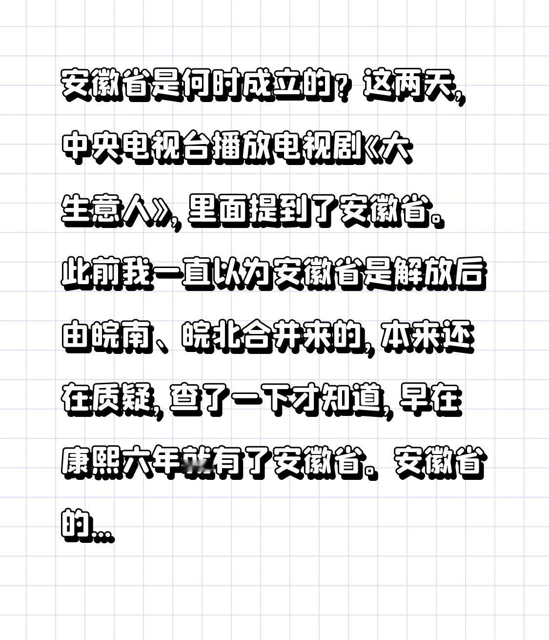 安徽省是何时成立的? 这两天,中央电视台播放电视剧《大生意人》,里面提到了安徽省。此前我一直以为安徽省是解放后由皖南、皖北合并来的,本来还在质疑,查了一下才知道,早在康熙六年就有了安徽省。 安徽省的设立经历了两个关键阶段,正式以省级行政区划成立的时间是清朝康熙六年(1667年),而现代行政区划意义上的安徽省人民政府则成立于1952年。 历史建省是1667年(清朝康熙六年)。清朝初年,江南省(辖今上海、江苏、安徽)因辖区庞大、治理困难,被拆分为江苏和安徽两省。 1661年,江南省左、右藩划片分治;1662年,设安徽巡抚,管理安徽地区;1665年,调整辖区,确定疆界,为分治奠定基础;1667年,正式撤销江南省,分设安徽、江苏两省。安徽省名取自安庆府(今安庆市)和徽州府(今黄山市)的首字。 安徽自此成为独立的省级行政区,疆域格局基本定型,安庆府成为临时省会。 现代行政区划是1952年。新中国成立后,行政区划调整频繁,安徽初期分为皖北、皖南两个行署区。 1949年4月,皖北人民行政公署在合肥成立,辖长江以北的安徽地区;1949年5月,皖南人民行政公署在芜湖成立,辖长江以南的安徽地区;1952年1月;中共中央批准成立中共安徽省委,省委机关驻合肥市。 1952年8月7日,中央人民政府批准撤销皖北、皖南行署,合并成立安徽省;1952年8月25日,安徽省人民政府正式成立,合肥成为安徽省省会。 安徽以统一的省级行政区划重新成立,奠定了现代安徽的行政基础。 历史建省,安徽从江南省分出,成为独立省份,省名沿用至今;现代成立,撤销皖北、皖南行署,合并成立安徽省人民政府,合肥成为省会。 这一过程体现了安徽从历史到现代的行政区划演变,既保留了深厚的文化底蕴,又适应了国家治理的需要。