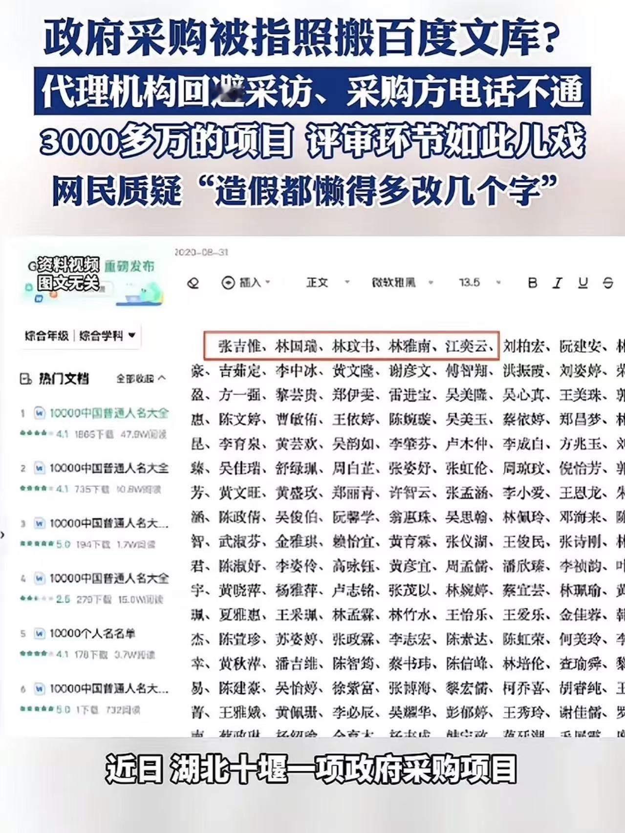 荒唐至极!3000 多万的政府采购项目,竟然连造假都偷懒了!湖北十堰,一项政府采购项目被爆出评审小组名单,完全照搬百度文库1万中国普通人名大全前五名!连顺序都没有改,直接复制粘贴进了中标公告。网友直呼:这也太敷衍了吧,连演都懒得演了? 最近湖北十堰出了件荒唐到家的事,说出来都让人觉得不可思议,一个3000多万的政府采购项目,居然在评审名单上犯了最低级的错误,造假都懒得动脑子,直接复制粘贴百度文库的人名,连顺序都没改,网友看完直呼:“这也太敷衍了,连演都懒得演了?” 这事要不是网友眼尖,可能就这么蒙混过关了。 涉事的项目中标金额高达3188万元,供应商是竹溪创拓劳务有限公司,这么大一笔财政资金的去向,按说评审环节得严丝合缝,专家库的抽取、名单的保密都得是重中之重,毕竟关系到纳税人的钱,容不得半点马虎。 可谁能想到,负责这事的人,连最基本的“造假敬业度”都没有。 项目公示的评审名单里,列着五个名字:张吉惟、林国瑞、儿林纹书、林雅南、江奕云。乍一看这名字挺普通,还带着点书卷气,跟咱们身边的路人甲乙丙丁没区别,谁也不会多想。 可偏偏有位网友闲着没事,觉得这名字排列有点奇怪,就顺手复制了这串名字,去网上搜了搜。这一搜可不得了,结果直接让人惊掉下巴——这五个名字,一个字不差,连排序都严丝合缝地对应着百度文库里一份“1万中国普通人名大全”的前五位。 也就是说,负责这个3000多万项目的人,连编造评审专家名字的功夫都省了,只需要按下Ctrl+C和Ctrl+V,一个决定巨额资金去向的评审团就这么“诞生”了。 这种操作简直是对公众智商的降维打击,说出去都像个笑话。以前咱们听人吐槽豆腐渣工程、萝卜招聘,好歹人家还会走个形式,编造点像模像样的信息掩人耳目,可这次倒好,造假者似乎是彻底懒癌发作,连脑筋都不愿意动一下,甚至都没想过打乱一下名字的顺序,就这么堂而皇之地放进了政府公告里。 这要是让一个八岁的小学生抄作业,都知道稍微改几个字、换个顺序掩人耳目,可在这么严肃的国家项目里,居然出现了如此敷衍的操作。 想想都觉得离谱,3000多万啊,不是300块、3000块,那是实打实的财政资金,关系到项目质量,关系到公共利益,就这么被当成了“过家家”,连最基本的流程都懒得走。 网友们看到这事儿后,彻底炸了锅,吐槽的声音一波接一波。有人说:“这也太明目张胆了吧,生怕别人不知道是造假?”还有人调侃:“百度文库这是间接参与了千万级项目评审?建议给文库颁个‘最佳配合奖’”;更有人气愤地说:“以前造假还需要点技术含量,现在直接复制粘贴,这是把公众当傻子耍啊!”大家的愤怒不是没有道理,这种敷衍背后,是对规则的无视,是对纳税人的不尊重。 事情败露后,记者也试图联系相关方了解情况,可得到的回应却让人寒心。 作为中间人的采购代理机构,面对记者的质询,要么顾左右而言他,要么干脆避而不谈,像惊弓之鸟一样躲着问题;而作为出资方的采购单位,电话打过去永远是无法接通的盲音,仿佛这事跟他们没关系一样。 这种沉默和回避,比任何辩解都更说明问题——在他们眼里,只要资金发出去了,中标单位定下来了,过程有多离谱根本不重要,反正没人会真的去查。 更让人意外的是,这五个“专家”名字,还不是第一次“现身”。 有细心的网友扒出来,早前某个书法大赛的获奖名单里,就出现过这一模一样的五个名字,连排序都没改,当时也是因为造假被抓了现行。看来这套“百度前五名”的操作,已经成了某些懒得动脑子的造假者的御用模板。 这就让人不得不怀疑,十堰这个3000多万的项目里,到底是单纯偷懒随便填了名字,还是早就内定了中标单位,只是随便抓了几个虚拟代号来充数,走个过场而已?有网友直言:“这分明就是哪家有关系的人‘包圆’了工程,连演戏的耐心都没有了。” 面对漫天的舆论压力,竹溪县住房和城乡建设局终于有了回应,只轻飘飘地说了一句“正在调查”。 可在铁证如山的复制粘贴面前,这么一句敷衍的回应,根本压不住公众心头的怒火。大家愤怒的不仅仅是造假者的懒惰,更是背后的恐惧,如果连公开公示的环节都能如此儿戏,那么那些不为人知的隐秘角落,比如项目的钢筋水泥质量、资金流水的走向,又会是怎样一番景象?这3000多万的项目,会不会最后变成一个隐患重重的“豆腐渣工程”? 说到底,这根本不是一次简单的“失误”,而是对政府公信力赤裸裸的羞辱。 “阳光采购”本来是为了让资金使用更透明、更公正,结果却变成了一键搜索的文字游戏;严肃的财政审批,居然沦为了互联网烂梗的素材。这不仅仅是挥霍纳税人的钱财,更是在疯狂试探社会公平的底线。 希望这次的调查能真的动真格,给公众一个满意的交代。 信息来源:海报新闻