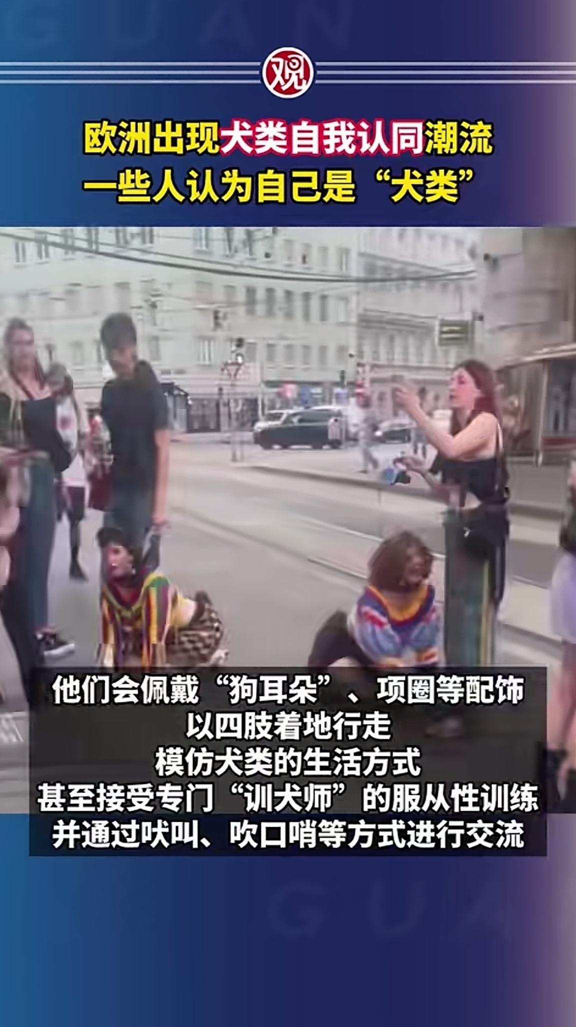 我们中国人很难理解,欧洲掀起一场“犬类身份”的自我认同潮流。 她们自我认可为“犬类”,像犬类一样以四肢着地爬行带项圈和狗绳,并配有“狗耳朵”。 如果国内网友感觉这也太离谱了,别着急,更离谱的还在后面。 她们还要过犬类的生活,甚至还有一个训犬师对她们发号施令。 她们和训犬师之间的交流,是通过模仿犬叫等方式。 千万别感觉太逆天了,应该很小众。 早在2023年,它们就能组织上千爱好者参加的大型聚会。 我们需要警惕的是:欧洲以后可能会出现各种各样的离谱事件,请不要感觉奇怪。 这是因为欧洲已经无法掌控自己的命运。 重点是,我们要敢于对这样的事情向国内渗透说“不!” 因为谁都清楚,背后有一双看不见的黑手。