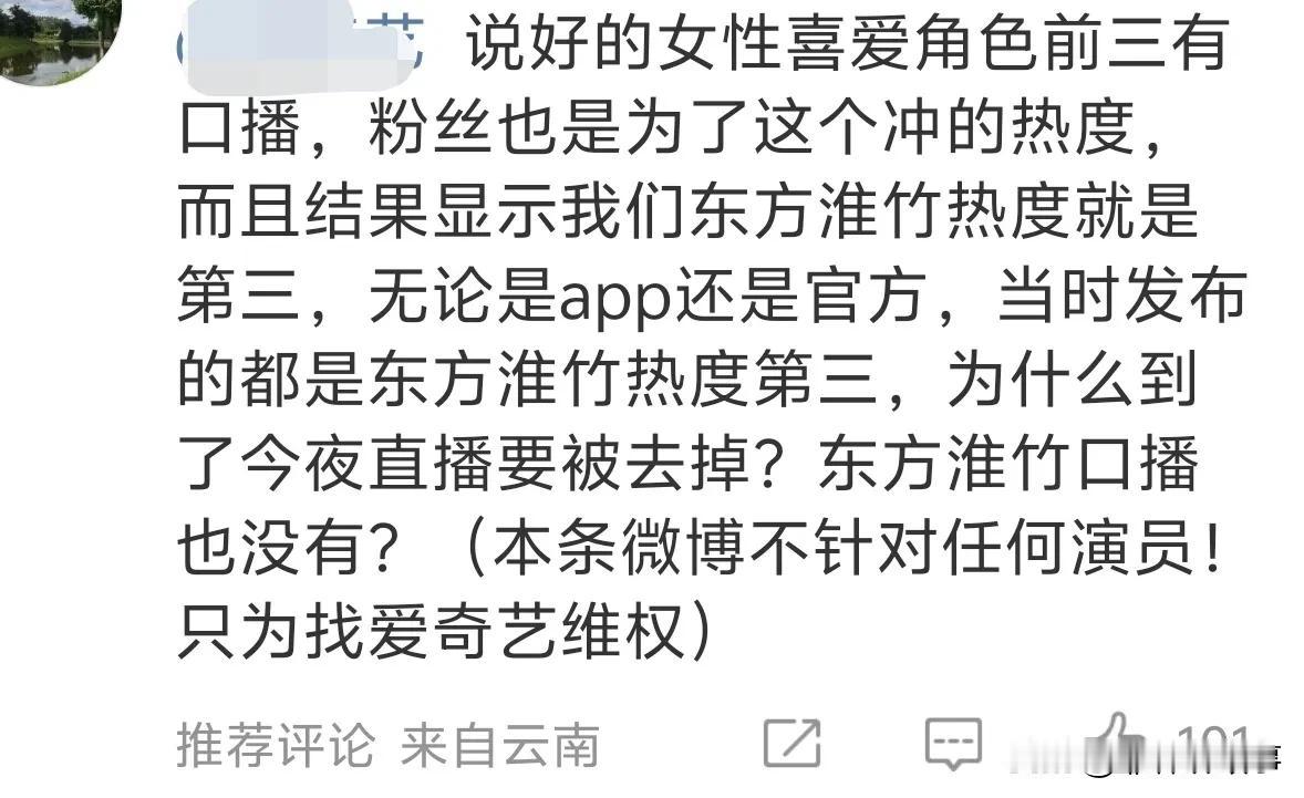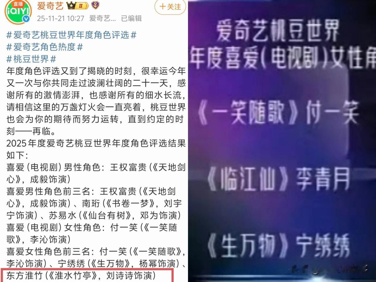 这个奖的评定标准是什么? 11月21日,爱奇艺公布的喜爱女性角色前三名,还有刘诗诗。 怎么今天爱奇艺尖叫之夜,现场公布的名单,却没有刘诗诗《淮水竹亭》东方淮竹? 粉丝:说好的女性喜爱角色前三有 口播,粉丝也是为了这个冲的热度,而且结果显示我们东方淮竹热度就是第三,无论是app还是官方,当时发布的都是东方淮竹热度第三,为什么到了今夜直播要被去掉?东方淮竹口播也没有?(不针对任何演员!只为找爱奇艺维权)