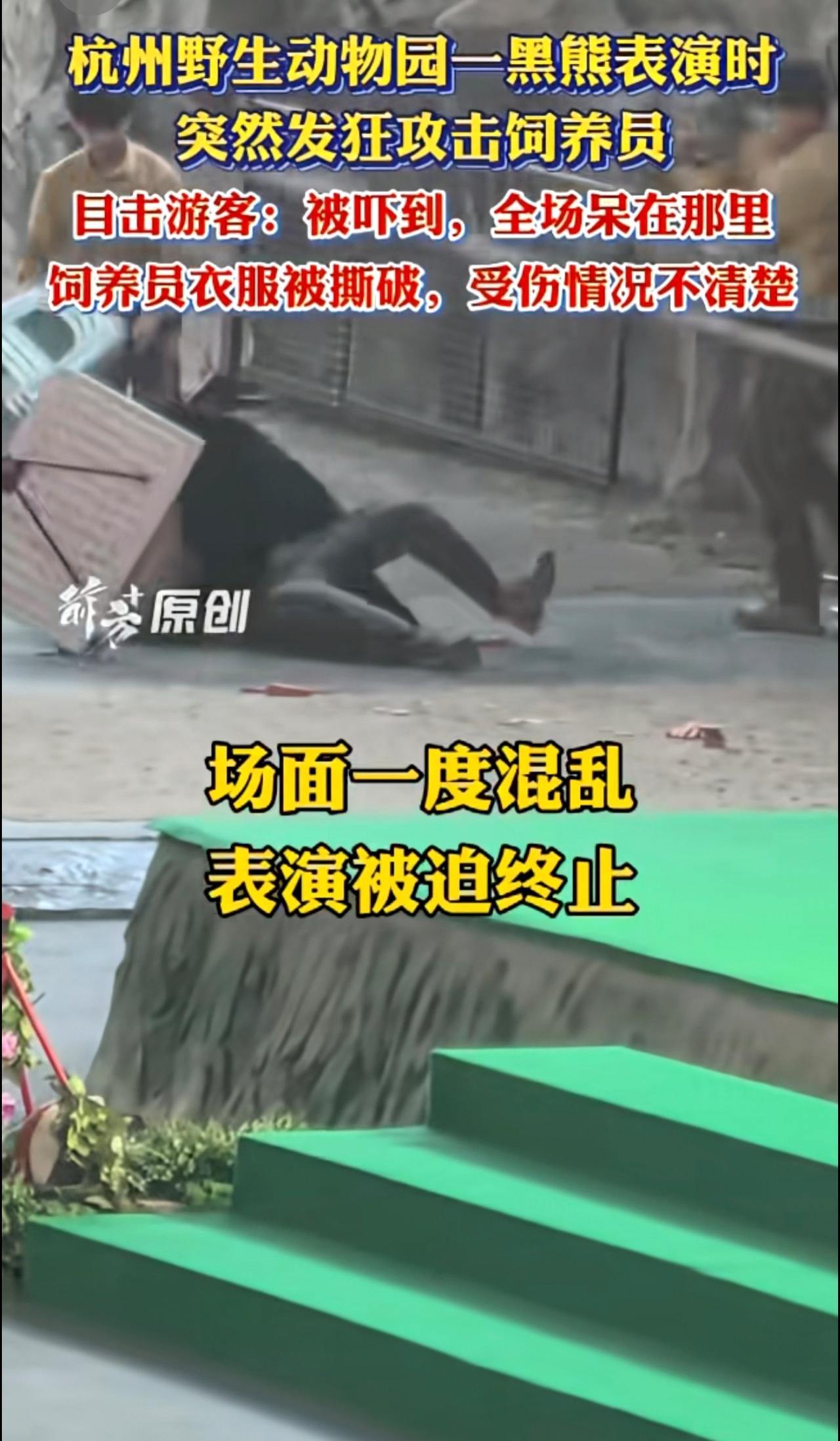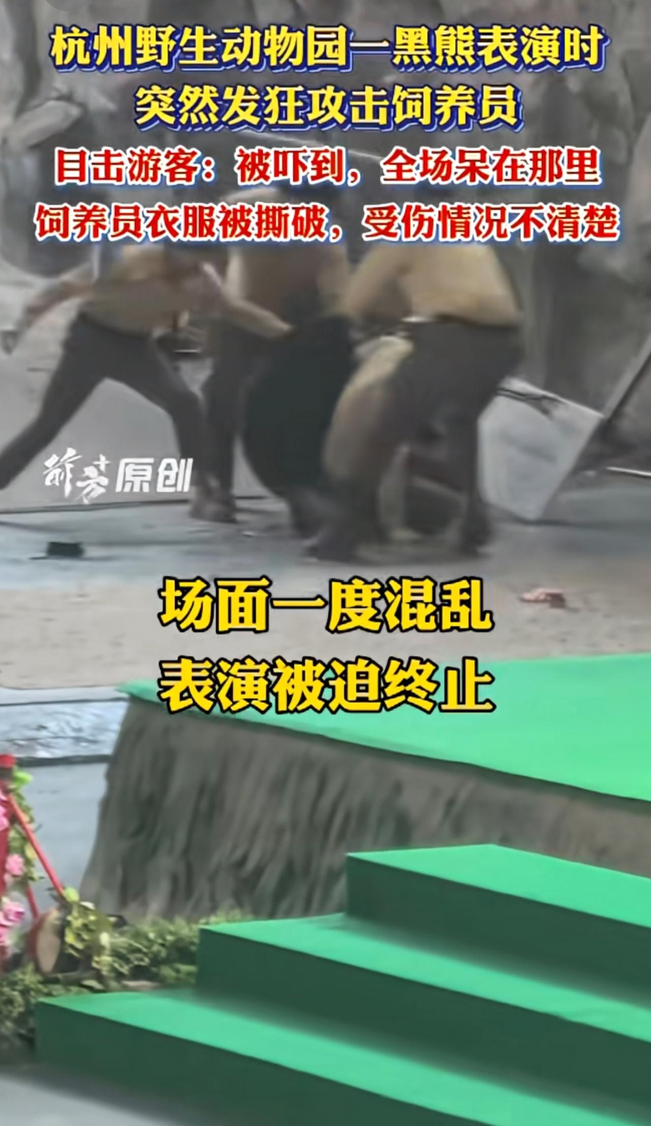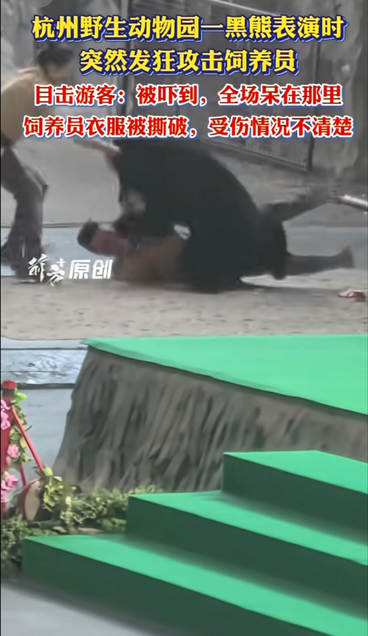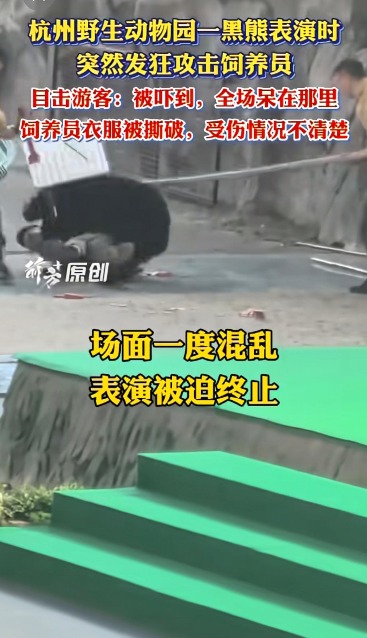 杭州野生动物园一黑熊表演时,突然发狂攻击饲养员,目击游客:被吓到,全场呆在那里,饲养员衣服被撕破,受伤情况不清楚。(晨视频)编辑:木子