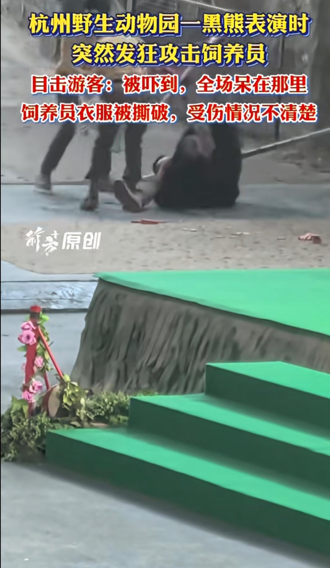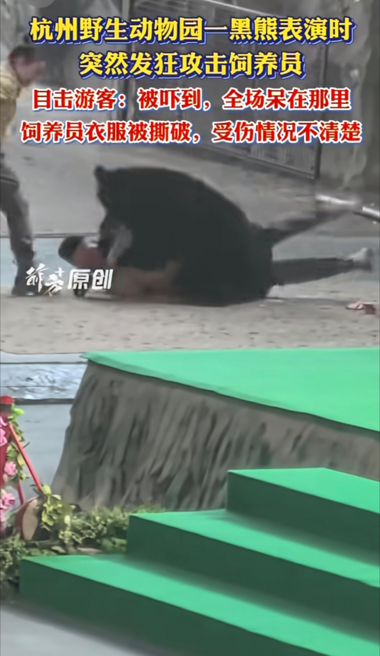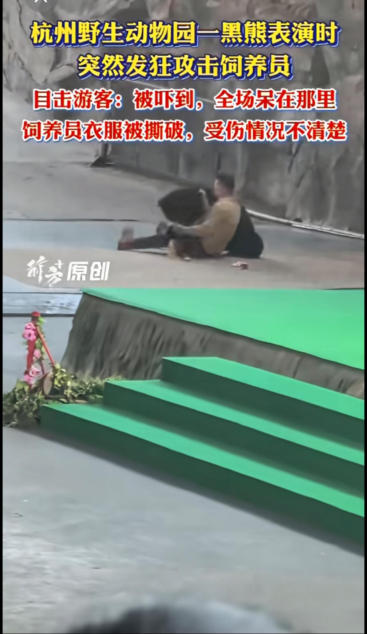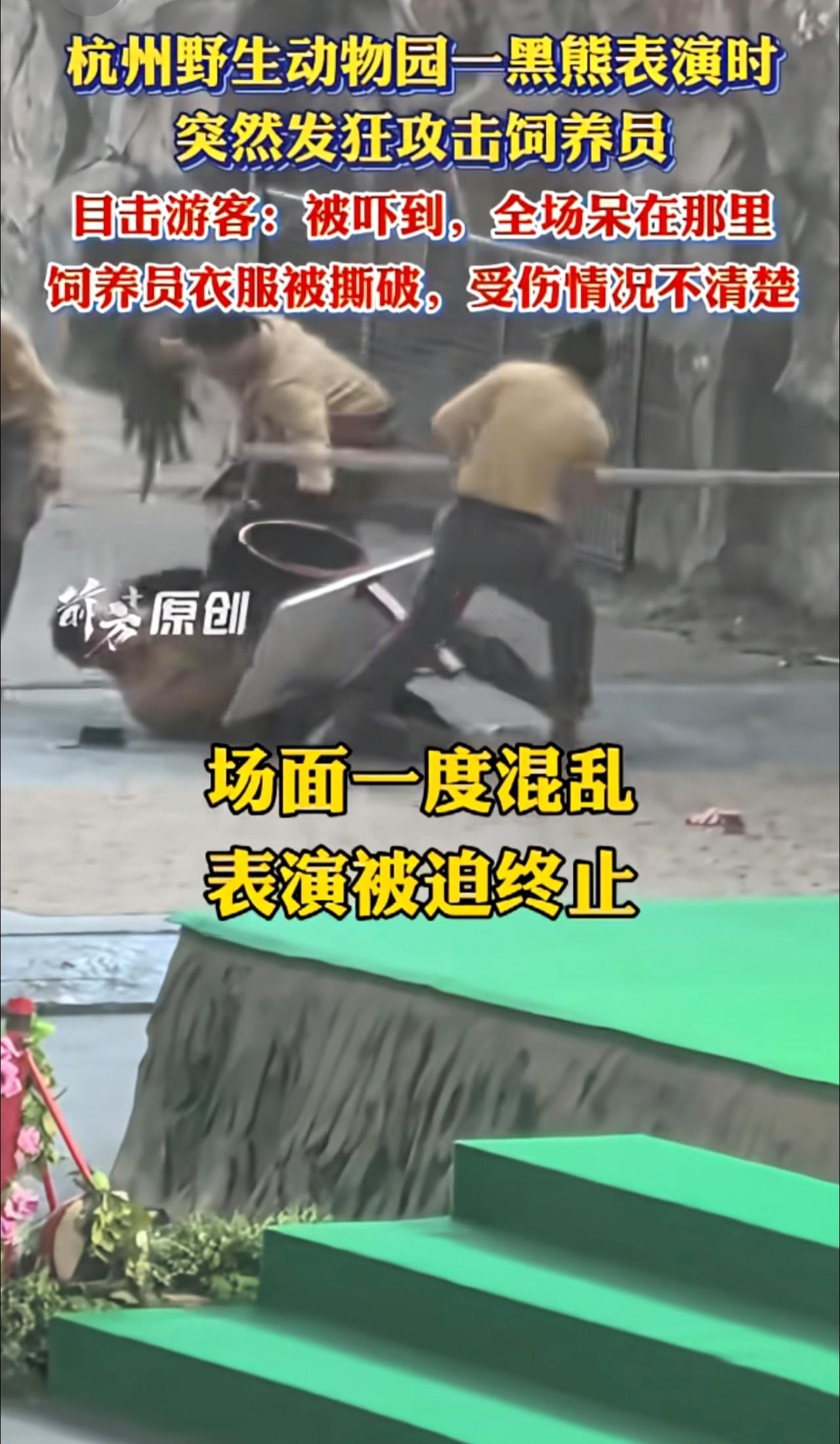 杭州野生动物园一黑熊表演时,突然发狂攻击饲养员,目击游客:被吓到,全场呆在那里,饲养员衣服被撕破,受伤情况不清楚。(晨视频)编辑:木子