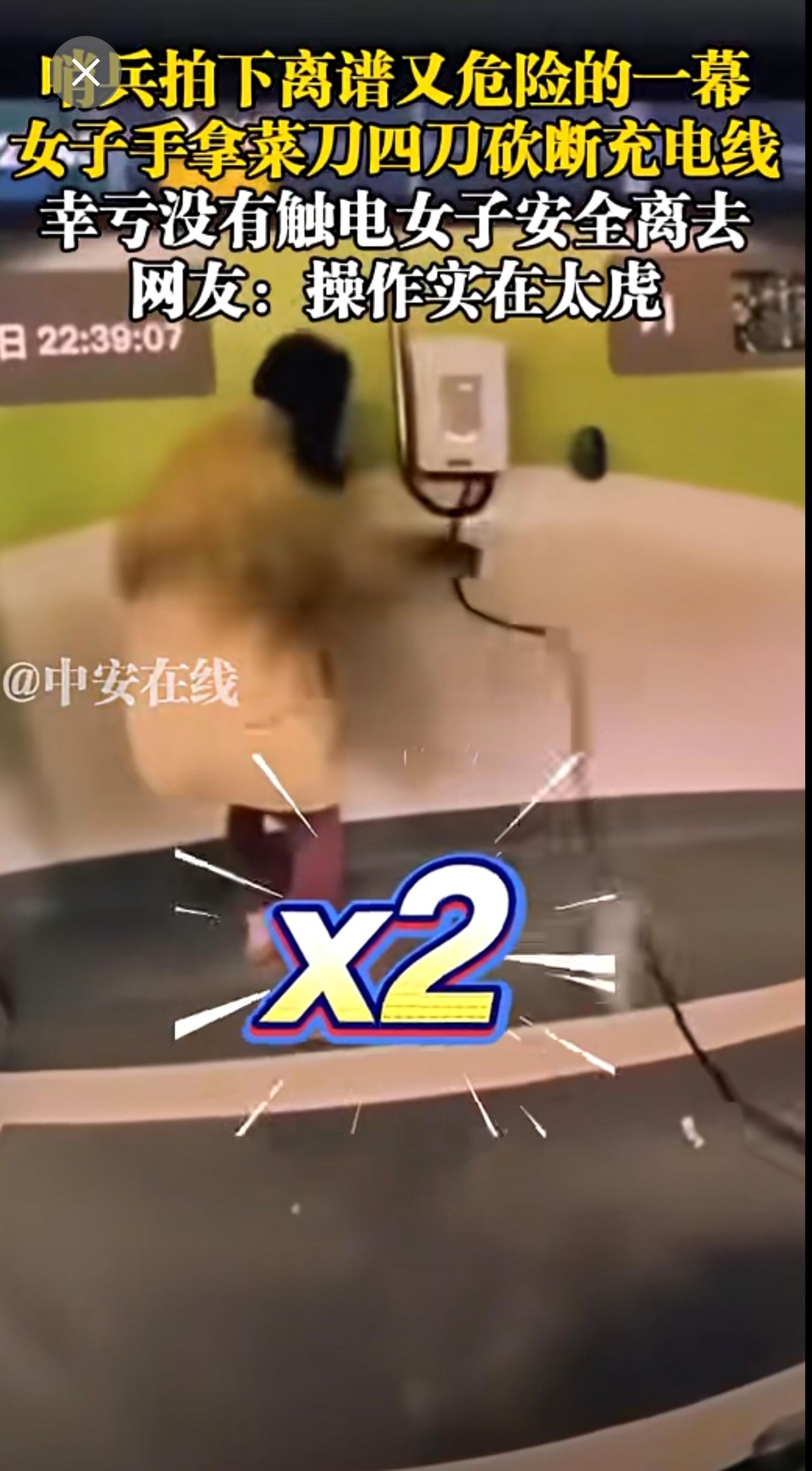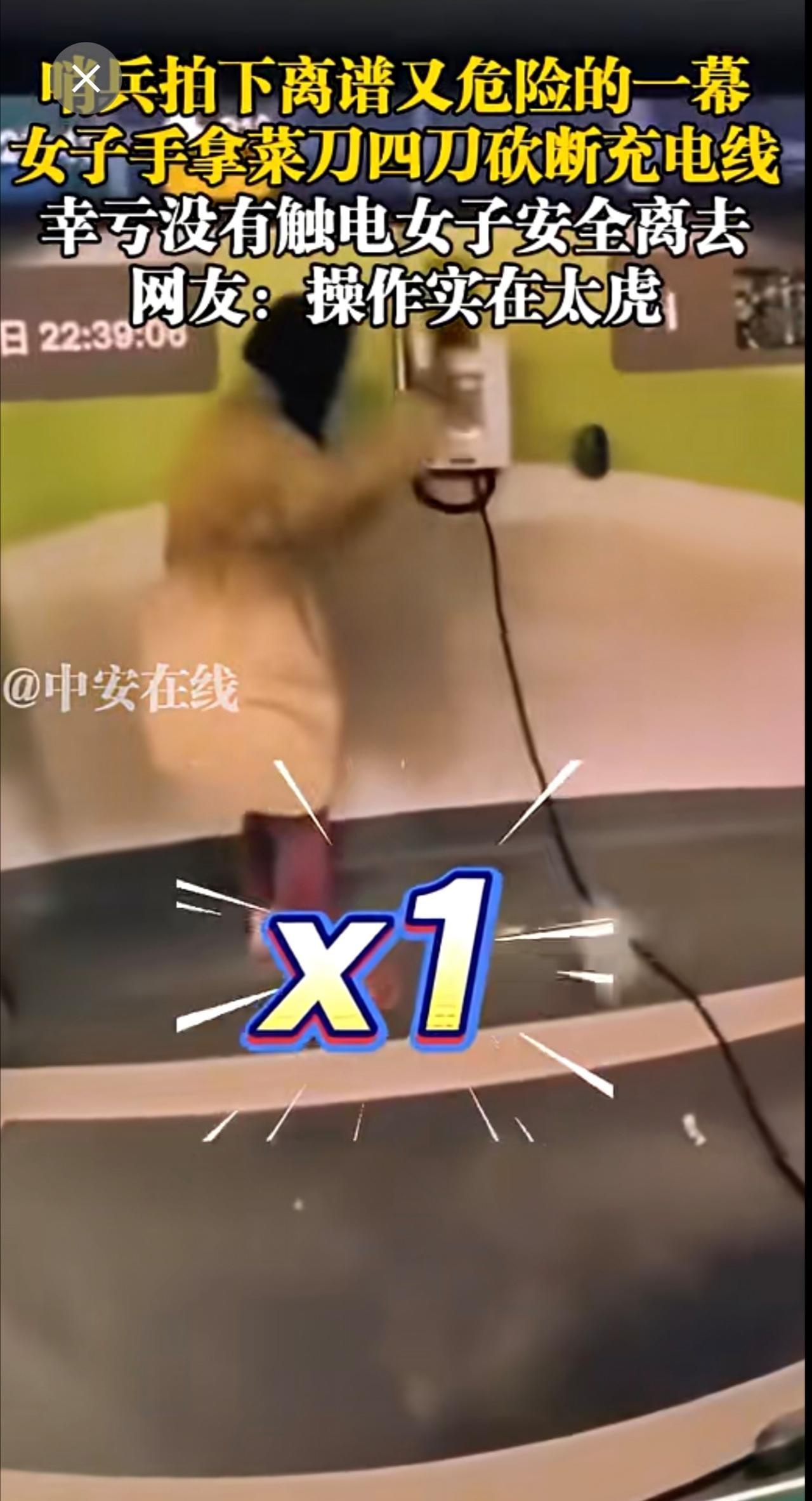 哨兵拍下离谱又危险的一幕,女子手拿菜刀四刀砍断充电线,幸亏没有触电女子安全离去,网友:操作实在太虎 充电桩 离谱 危险一幕 (陈三多)