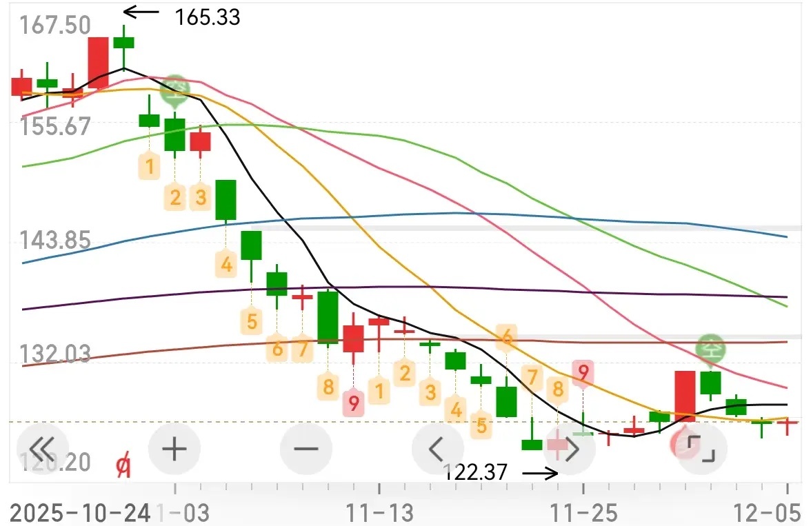 赛力斯的小阳十字星意味深长……1.股价连跌三天后,收出如此K线形态,有短线企稳的意味;2.这几天的下跌,股价并没有创上一轮的低点122.37元;3.周五的低点也并未破周四的低点124.60元(下跌不创新低,说明下跌动能有限);4.其实这一轮的下跌,就是没有突破二十日均线后的再度回落蓄势;5.12月1日的中阳是上一轮反弹的高点,也是对11月份销量利好的释放和消化;6.短期企稳后,目标是继续上攻二十日均线(也叫生命线);7.一旦攻破,并站稳,则意味着新一轮上攻行情(目标前高)的开始。