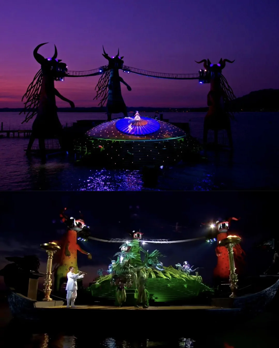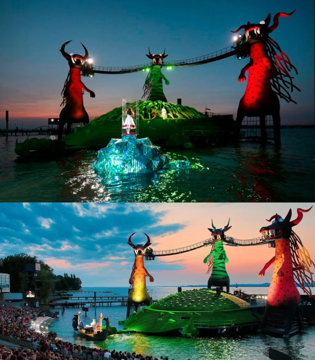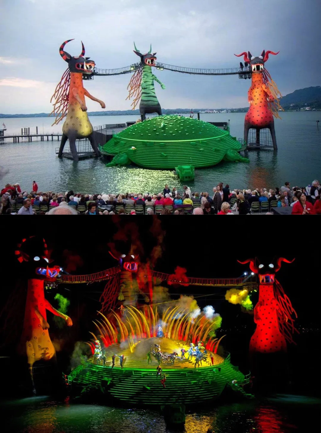 🧙2013~2014《魔笛》 🧙该版本于2013年首演,由英国导演大卫·庞特尼(David Pountney)执导 🧙该剧的舞台设计具有童话般色彩~ 🧙主色调为橙红绿三只巨龙和一只庞大的绿色海龟构成了舞台主结构 🧙设计新颖前卫,色彩绚丽的水上舞台搭配着灯光、烟火元素等打造出一种梦幻般的故事 🧙博登湖中离岸25米固定的露天舞台,巨大而华美的舞台设计和高水平的歌剧演出,不再重演,也绝无可能复排
