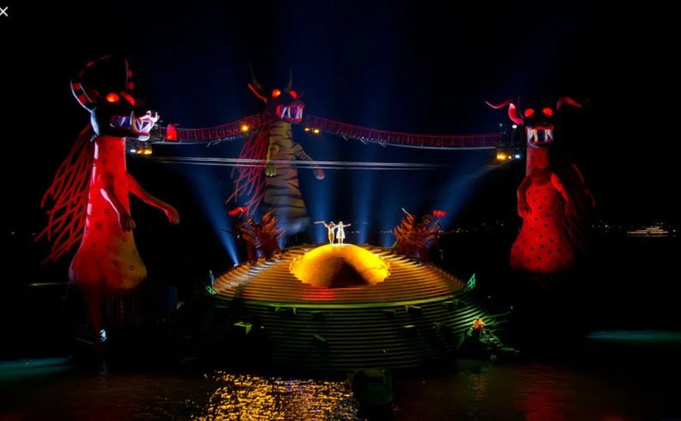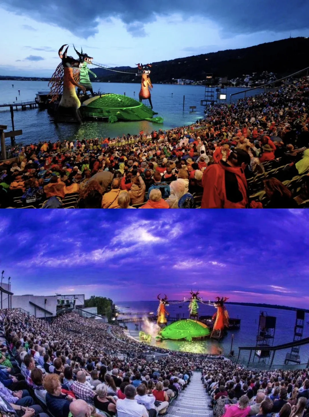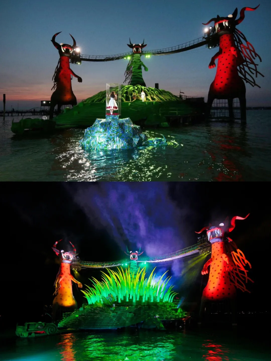 🧙2013~2014《魔笛》 🧙该版本于2013年首演,由英国导演大卫·庞特尼(David Pountney)执导 🧙该剧的舞台设计具有童话般色彩~ 🧙主色调为橙红绿三只巨龙和一只庞大的绿色海龟构成了舞台主结构 🧙设计新颖前卫,色彩绚丽的水上舞台搭配着灯光、烟火元素等打造出一种梦幻般的故事 🧙博登湖中离岸25米固定的露天舞台,巨大而华美的舞台设计和高水平的歌剧演出,不再重演,也绝无可能复排