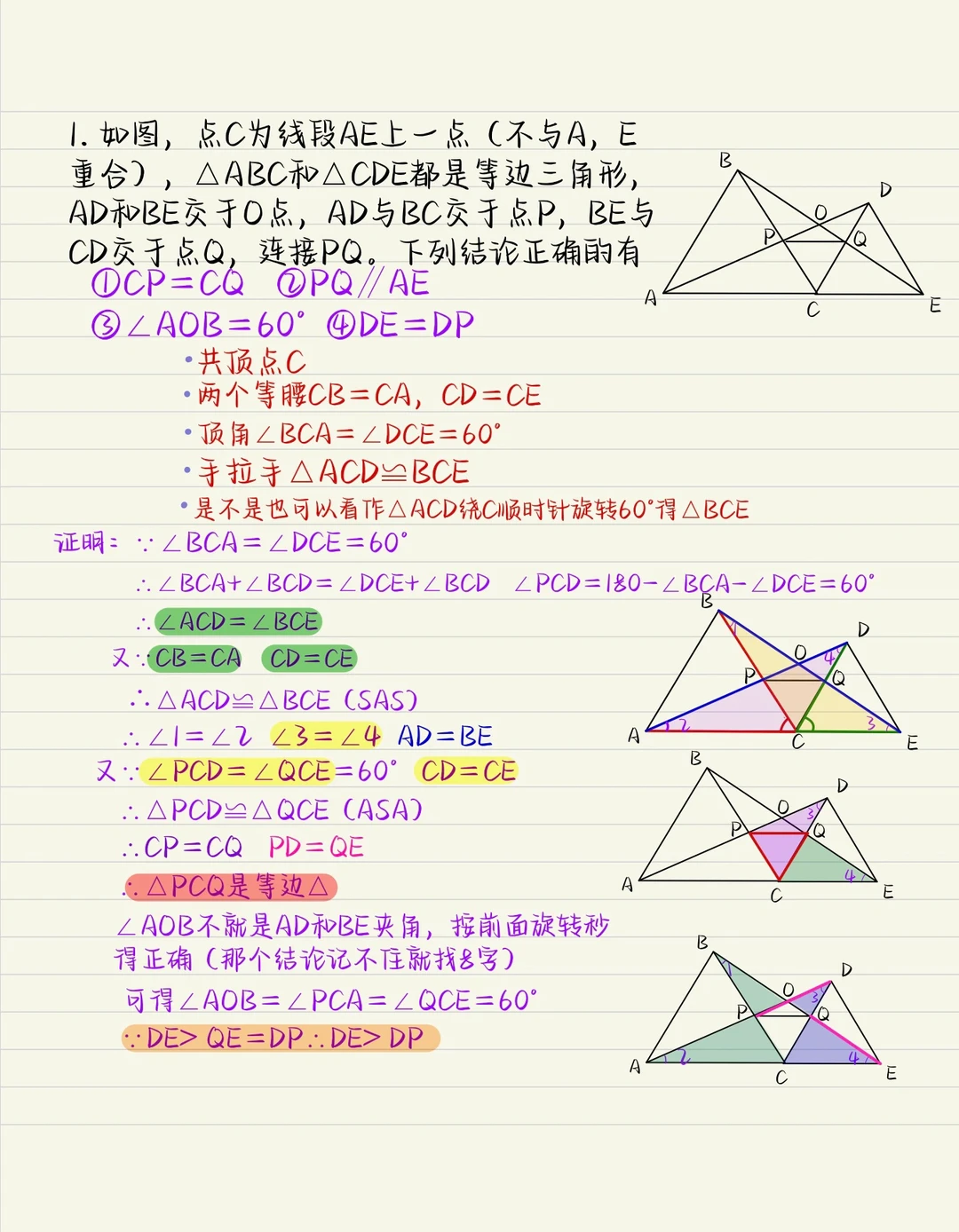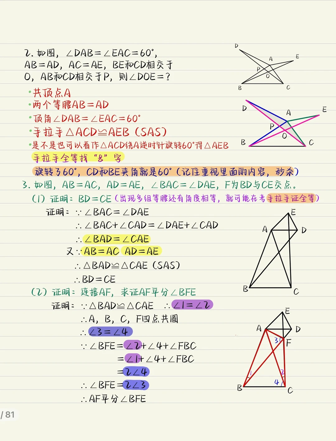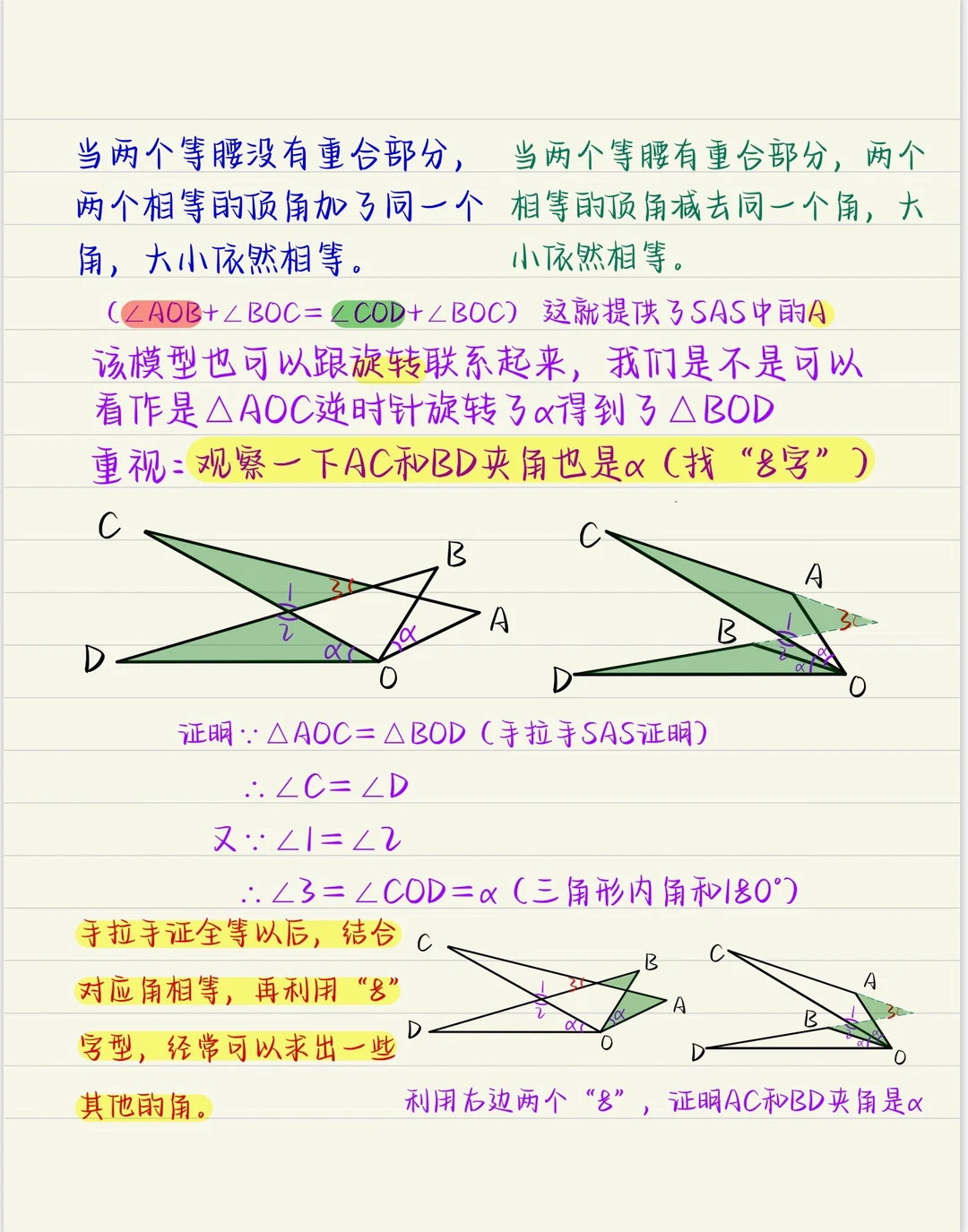 手拉手是整个初中阶段非常重要的模型,初二,初三,尤其中考生要掌握的重点模型。 多组等腰,且出现角相等,就要考虑手拉手构造全等三角形了。然后就可以利用全等三角形的性质,对应边相等对应角相等。然后还可以利用“8字”来找角,非常好用。 后面还会更新手拉手模型的构造,以及反向手拉手,敬请期待。