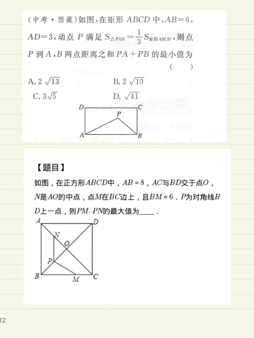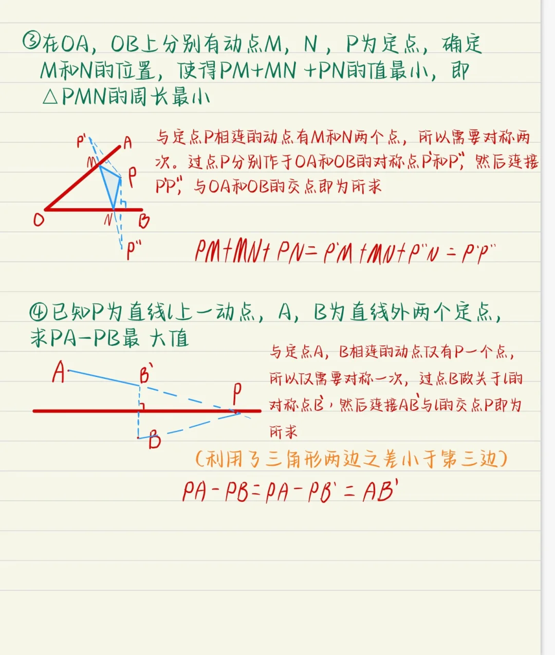 作将军饮马模型,核心关键是作辅助线。于定点相连的动点有几个就做几次辅助线。 求和一般求最小值,将点转化到线的两侧,利用两点间线段最短,点到直线垂线段最短来做题。 求差一般求最大值,将点转化到线的同侧,利用三角形两边之差小于第三边。
