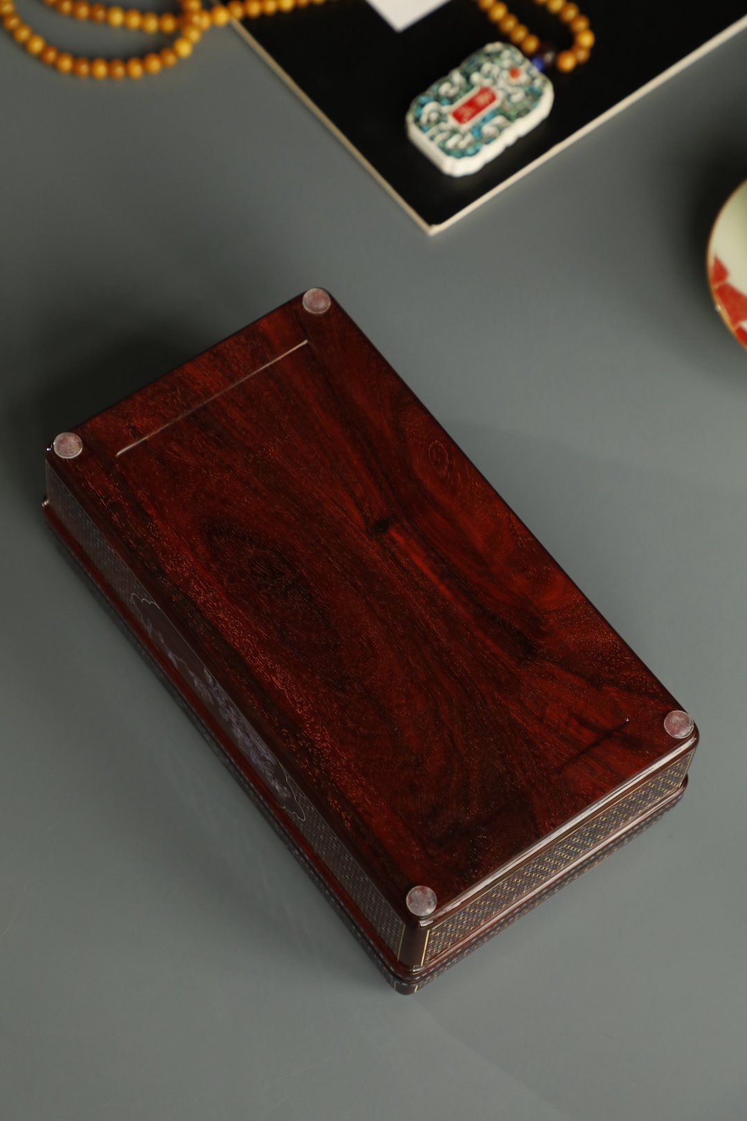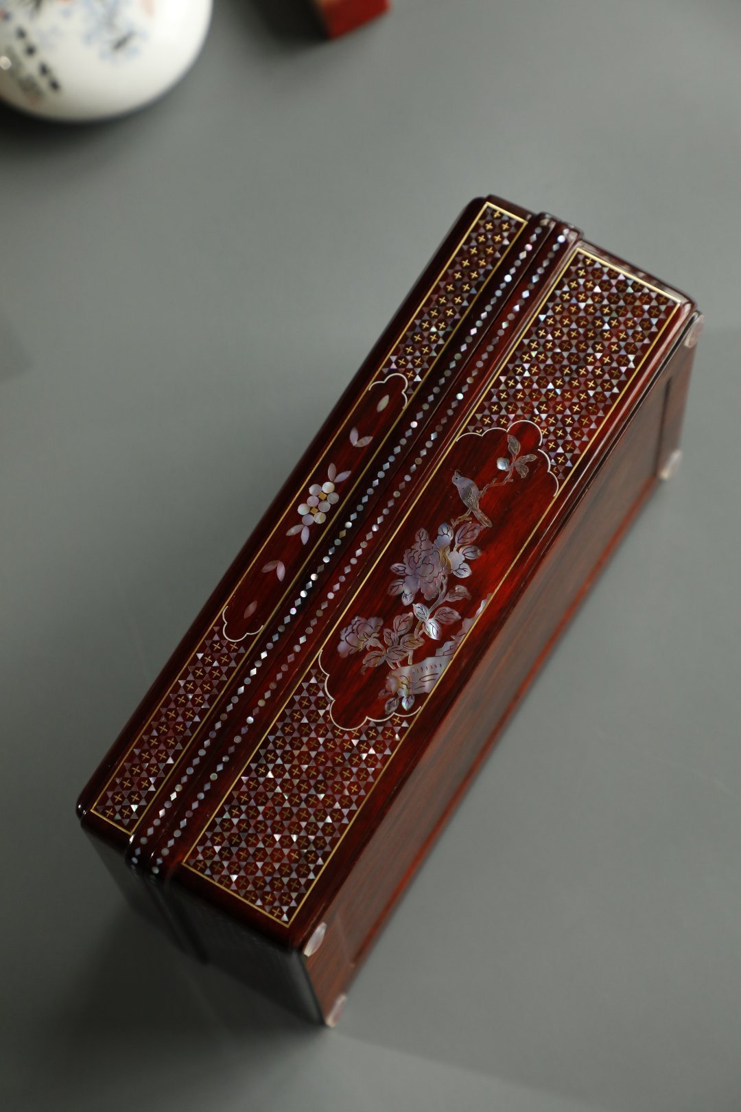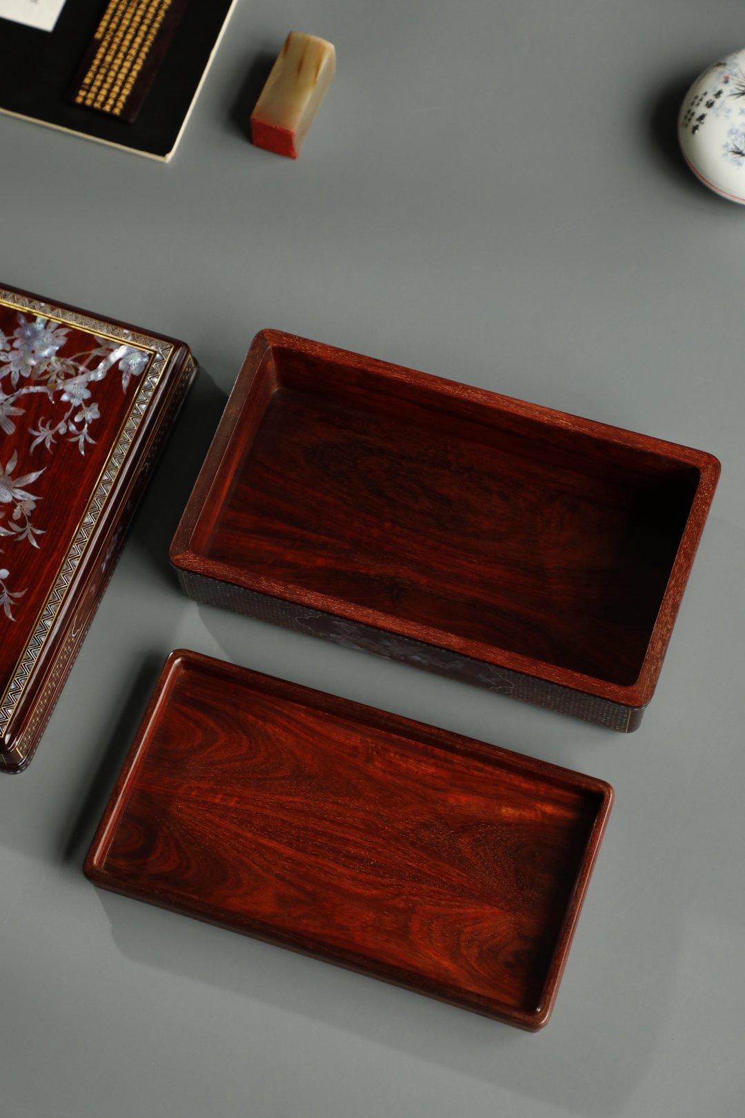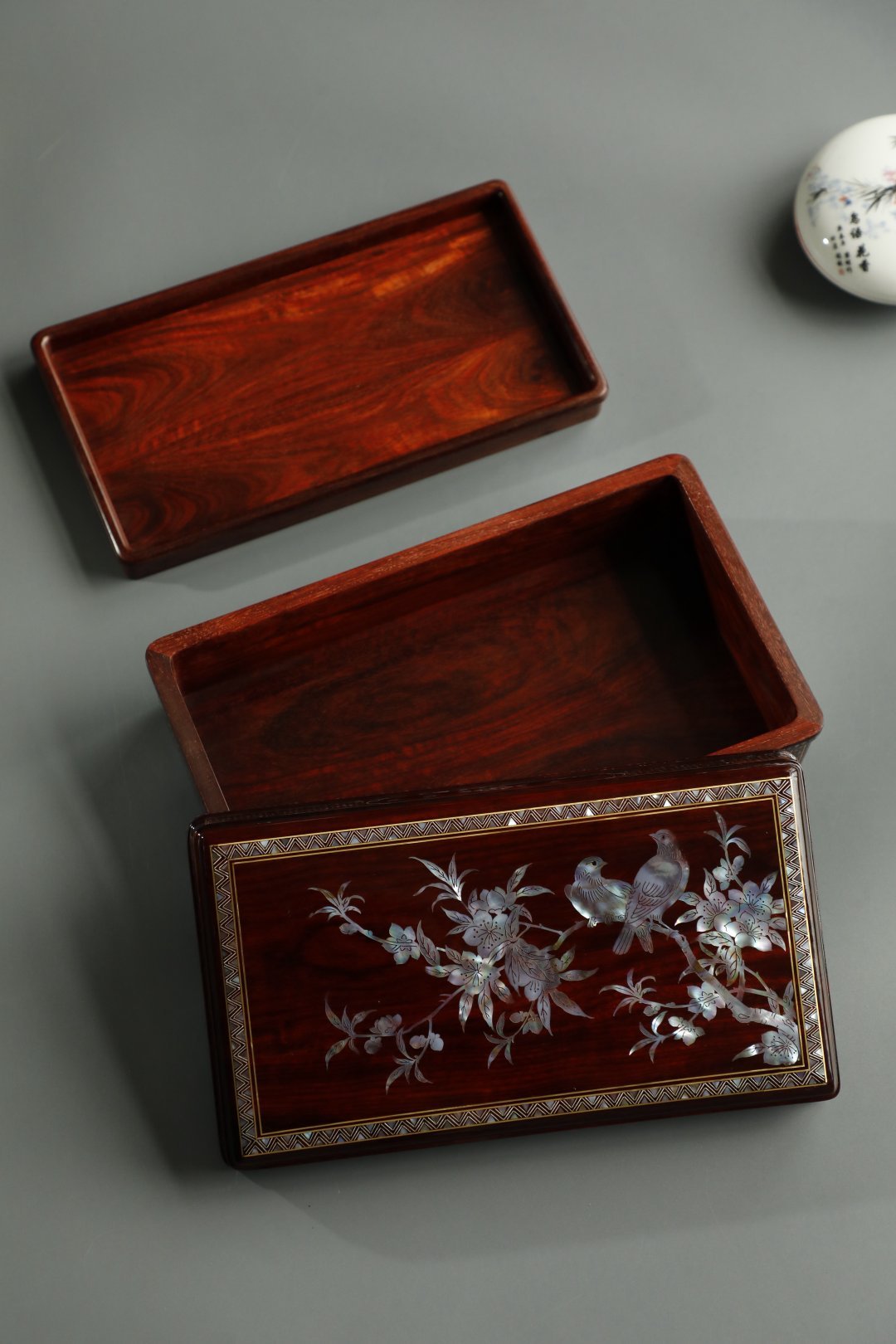 小叶紫檀×螺钿 | 花鸟图文盒老料底胎,榫卯结构明式经典器型,盒面螺钿镶嵌花鸟图,立墙锦地,密丽精美,内设小屉,做工考究。23*13*8.5cm 重900克