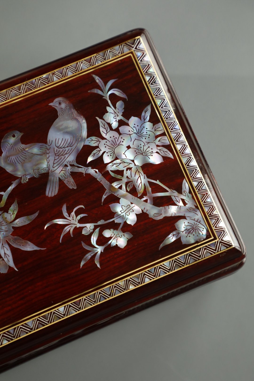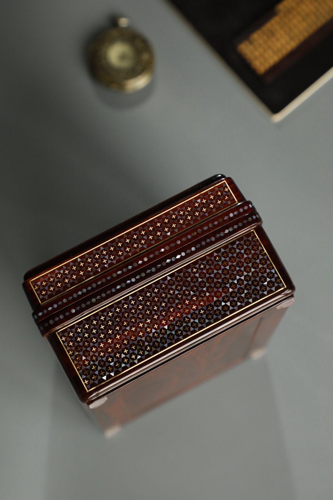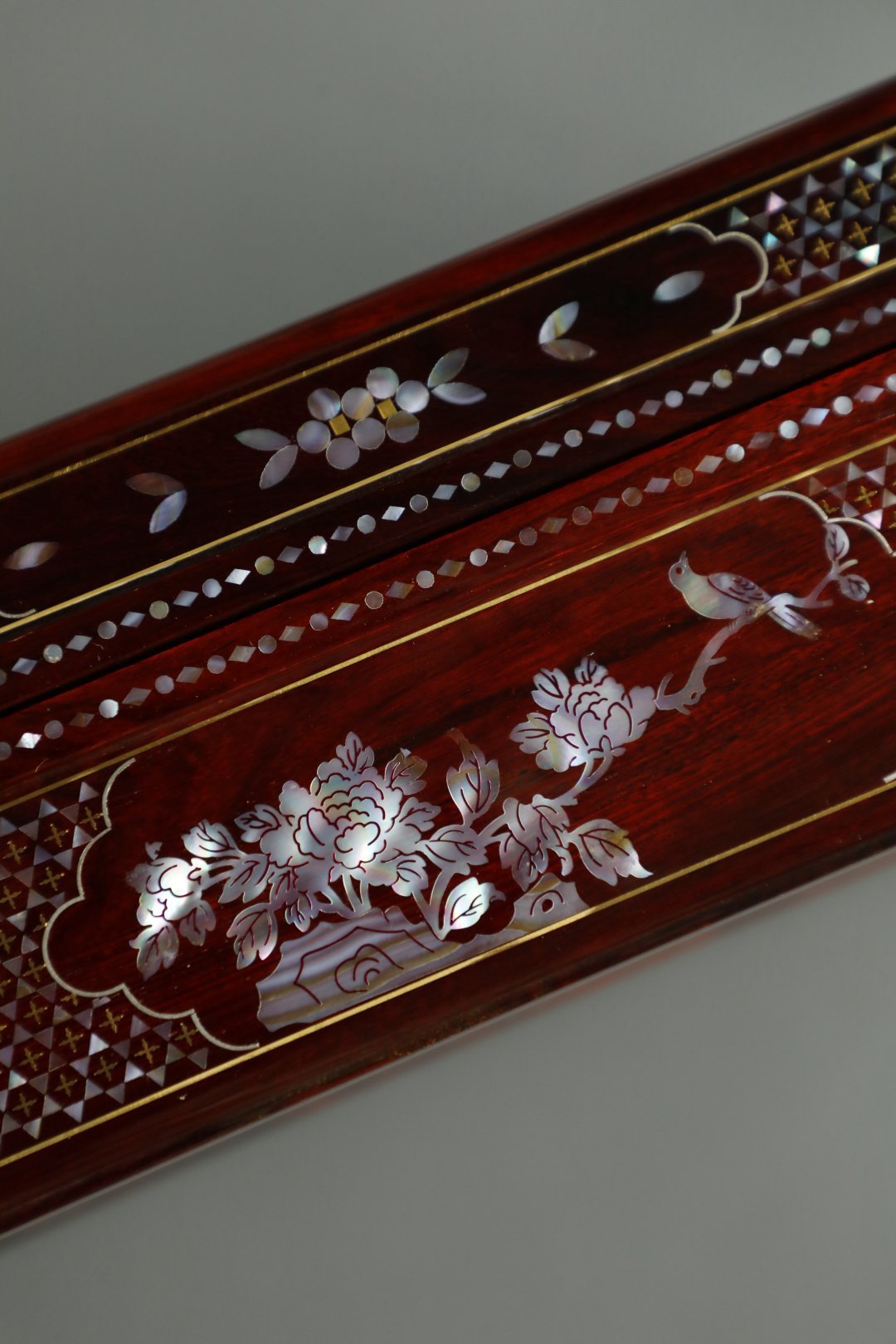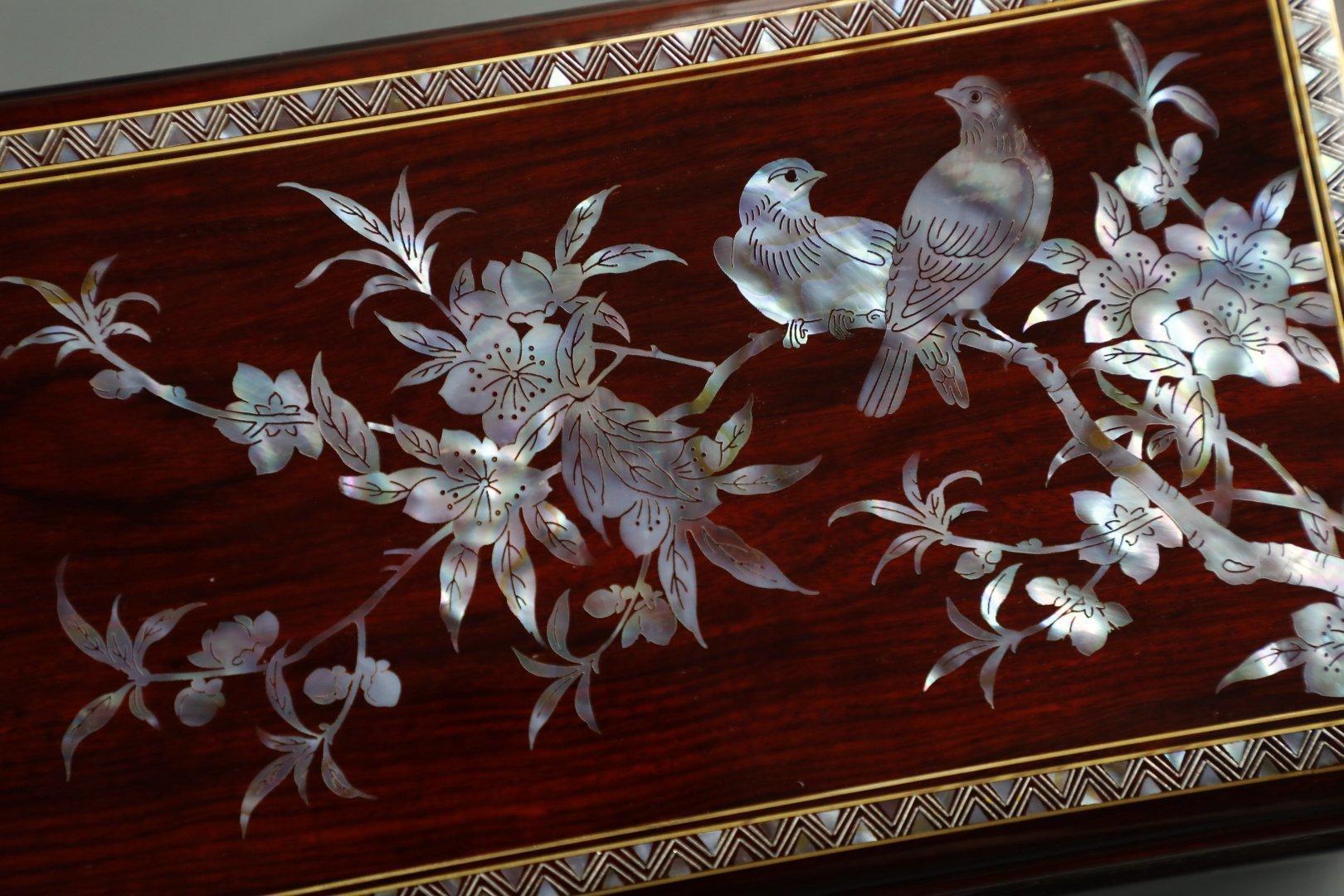 小叶紫檀×螺钿 | 花鸟图文盒老料底胎,榫卯结构明式经典器型,盒面螺钿镶嵌花鸟图,立墙锦地,密丽精美,内设小屉,做工考究。23*13*8.5cm 重900克