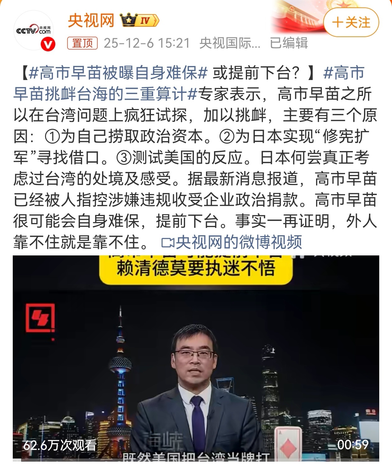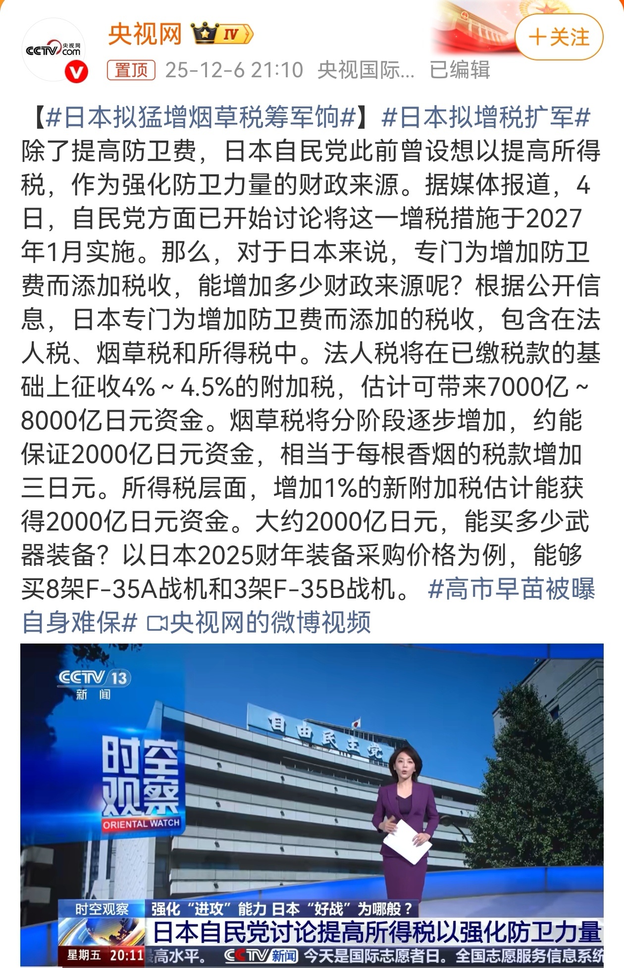 12月1日,东京举行的国际投资会议上,日本首相高市早苗引用动漫《进击的巨人》台词:“都给我闭嘴!把钱都投到我这儿来!”然而,她似乎本能忽略了【这句话说完后被暴揍】的原剧情,现实中的高市早苗也面临着外忧内患的窘境,随时有提前下台的可能。高市早苗被曝自身难保日本拟猛增烟草税筹军饷当今的国际关系主旋律,不再是美国以为的对抗关系,高市早苗出身浅、派系弱,只能借助右翼势力,实现个人的政治野心,进而继续错误押宝美国。前日本首相石破茂选择辞职,除了选票崩盘、议席失守的直接原因,还有在美日关税谈判中的“丧权辱国”,日本被迫接受美方5500亿日元投资框架且利润九成上缴。高市早苗上台后,选择性遗忘美国霸权对日本经济的破坏,还是选择抱紧美国的“虚假大腿”,甘愿充当“印太马前卒”。然而,美国自身问题缠身,国内政治分裂、经济衰退,国际影响力江河日下,对外的国际干涉,明显有些力不从心。长久以来,美国靠着对外输出霸权,实现经济上贸易逆差,向全球各国兜售美元,久而久之,美国的经济体系成了严重空心化的金融经济。近年来,美国从出兵伊拉克到介入俄乌冲突,对外输出武力后,却没能收获期望的利益。世界格局在变化,美国对外干涉的成本,已远远超过潜在收益。美国选民之所以选择特朗普,是美国人在全球化浪潮下,已感受到自身利息受到损害,更倾向于孤立主义,即特朗普的美国优先,日本在美国战略棋盘上的角色,其实是不对称同盟中的工具性存在。在干涉主义时代,日本还可以作为美国对外干涉的“前沿碉堡”,既能封堵对手又能分摊成本,一旦美国转入孤立主义,日本随时可以被弃用,甚至还要被美国拿来“回血”。1951年,《日美安保条约》把日本列岛定义为“美军永不沉没的航母”,驻日美军基地成为殖民地2.0版本;1985年的“广场协议”缓解了美国贸易逆差,却直接把日本推向资产泡沫与长期停滞的深渊;2025年,美日再次签署“新贸易协议”,同样要求日本扩大对美投资、利润回流。日本把国家发展希望寄托在美国身上,必然会有战略焦虑,更是陷入越配合越被动的恶性循环。尤其可笑的是,在特朗普的关税大棒下,日本选择继续购买美国液化天然气、军火,实质是交保护费。高市早苗被曝自身难保