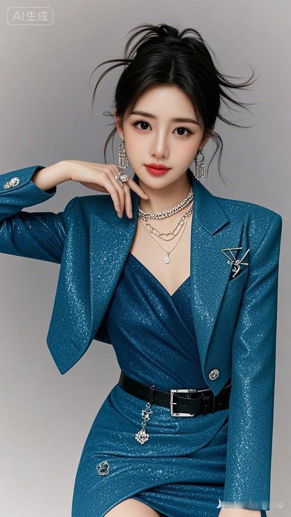 龚女长发凌乱盘起,浓眉下双眸清澈。亮色不规则西服闪耀,胸针与项链耳坠呼应。亮晶晶腰带束于深色阔腿裤上,姿态松弛,定格镜头下的摩登魅力。