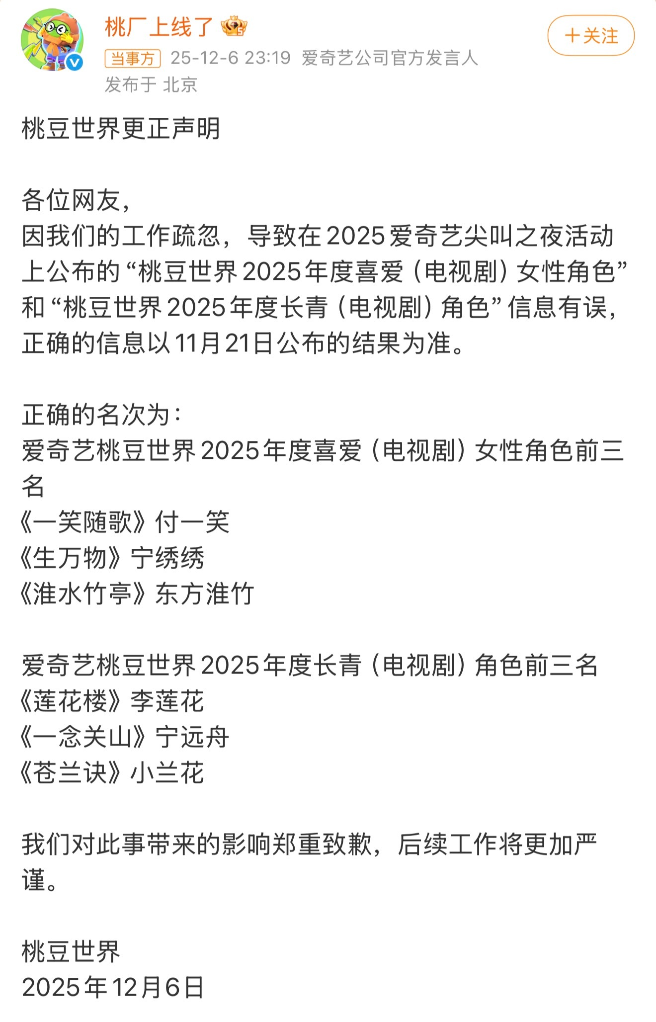 爱奇艺道歉了,真是个草台班子,把刘诗诗的奖给了白鹿,现在又改回去了