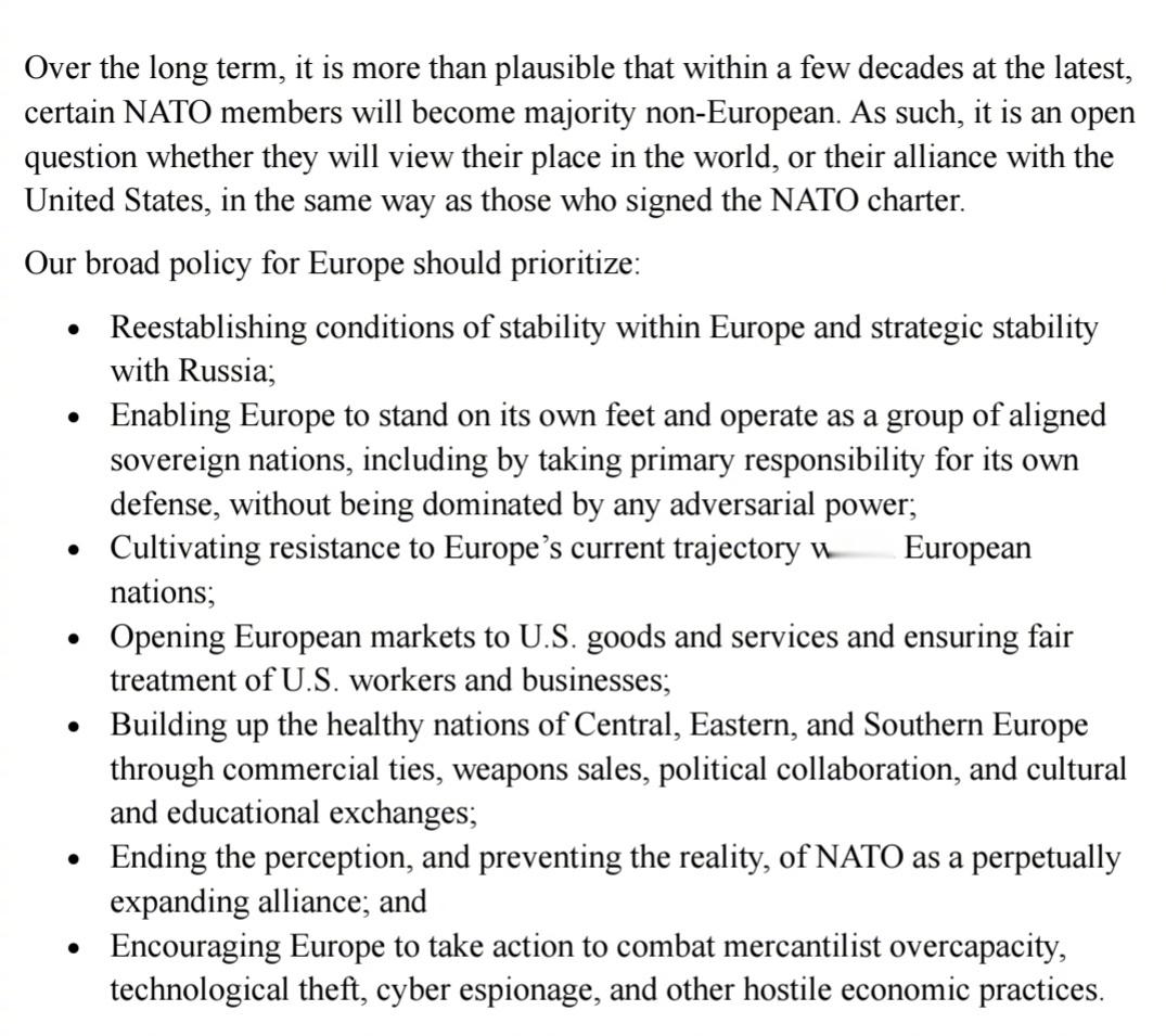 12月4日,美国2025新版《国家安全战略》发布,现在大家基本上都看完了。欧洲人现在都在无能狂怒中……为什么呢?这么说吧,这个文件里,骂欧洲的篇幅是俄罗斯的十倍,充满了侮辱和残酷的批评,说欧洲文明正在消失和丧失民族认同。除了昨天我发的那条美国要甩掉欧洲防务的部分,文件还说现在欧洲是民主的威胁,因为欧洲少数派政府打压、迫害“欧洲爱国政党”,说美国要优先培养欧洲当前进程的抵抗力量,将欧洲复兴的希望寄托在这些“爱国政党”身上,欧洲人一看:这TM不就是赤裸裸的干涉内政么。另外,文件还批评欧洲对俄乌战争有着不切实际的幻想,要求欧洲顺应民意结束冲突,与俄罗斯恢复战略稳定,并称这是美国的优先考虑事项。文件中这些对欧洲的要求,真是一项比一项无法接受,气的瑞典前首相痛批:这个新版美国国家安全战略比欧洲极右翼还右!