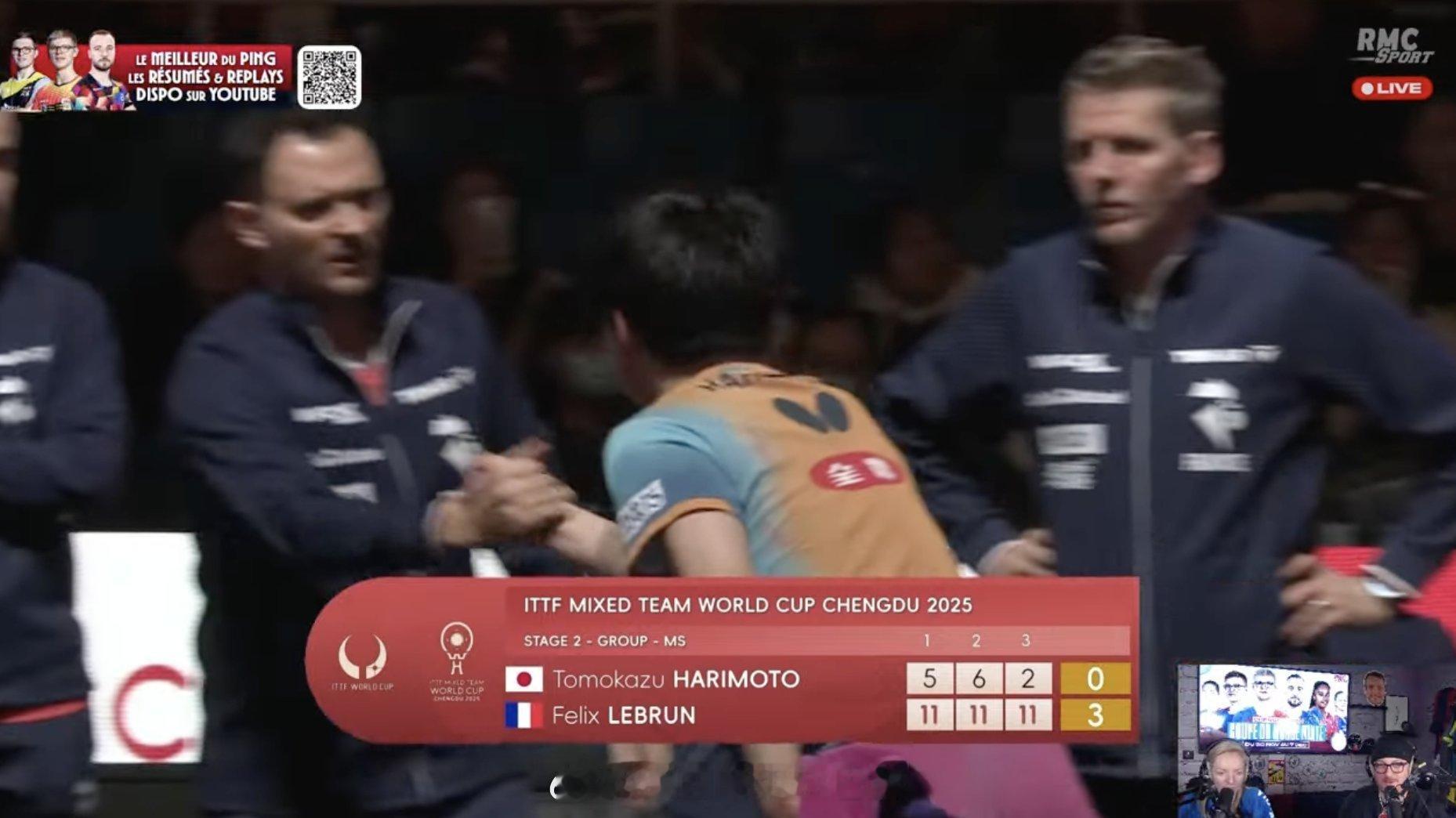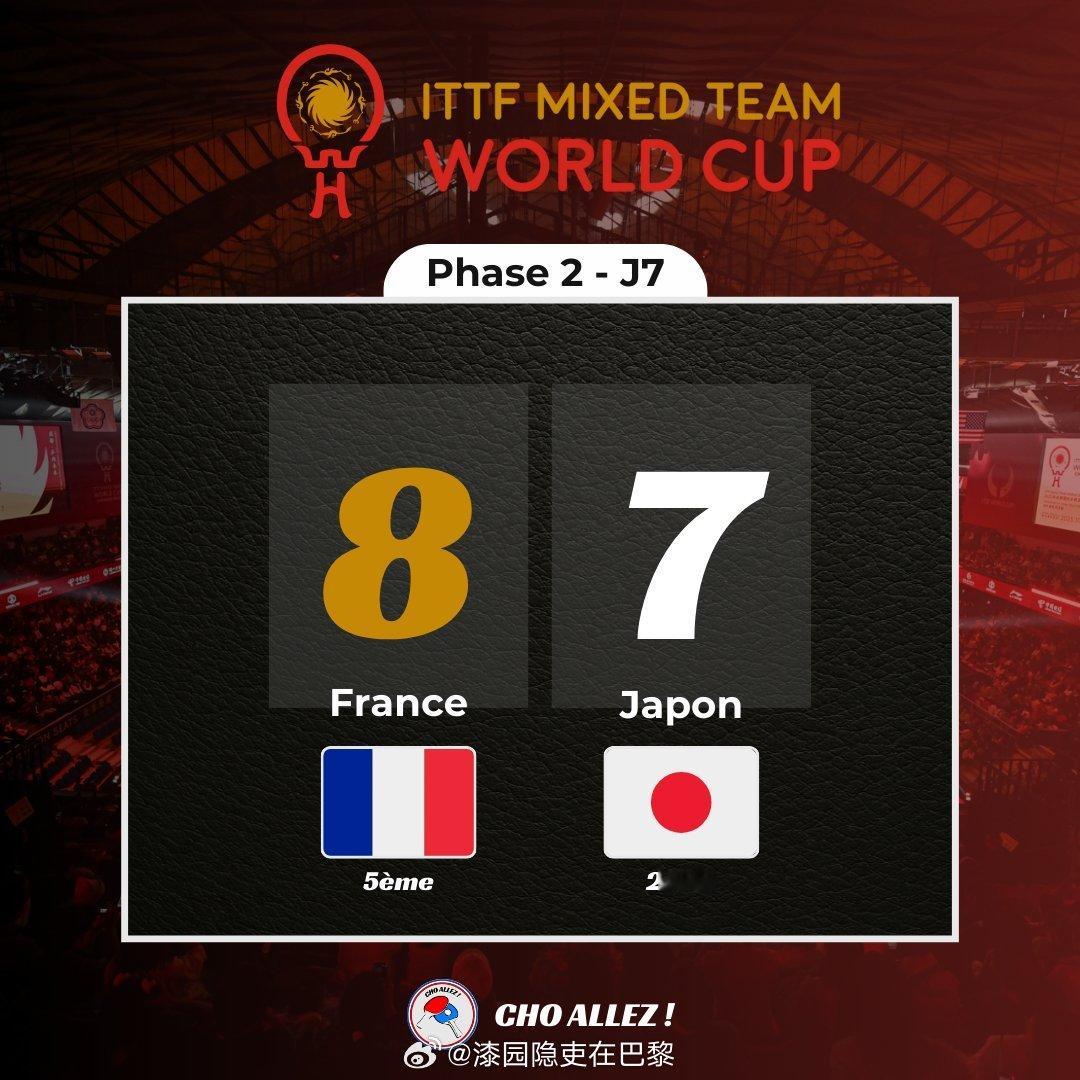 2025年成都混合团体世界杯 成都混合团体世界杯日本队VS法国队,张本智和连丢三局惨败小勒布伦,三局仅得13分,第三局仅得2分,最终日本队7-8法国队告负。尽管已经被淘汰,法国队仍以一场含金量十足的胜利收官!法国队以本届混合世界杯第 5 名结束征程!法兰西的故事乒乓球勒布伦 法国8比7日本
