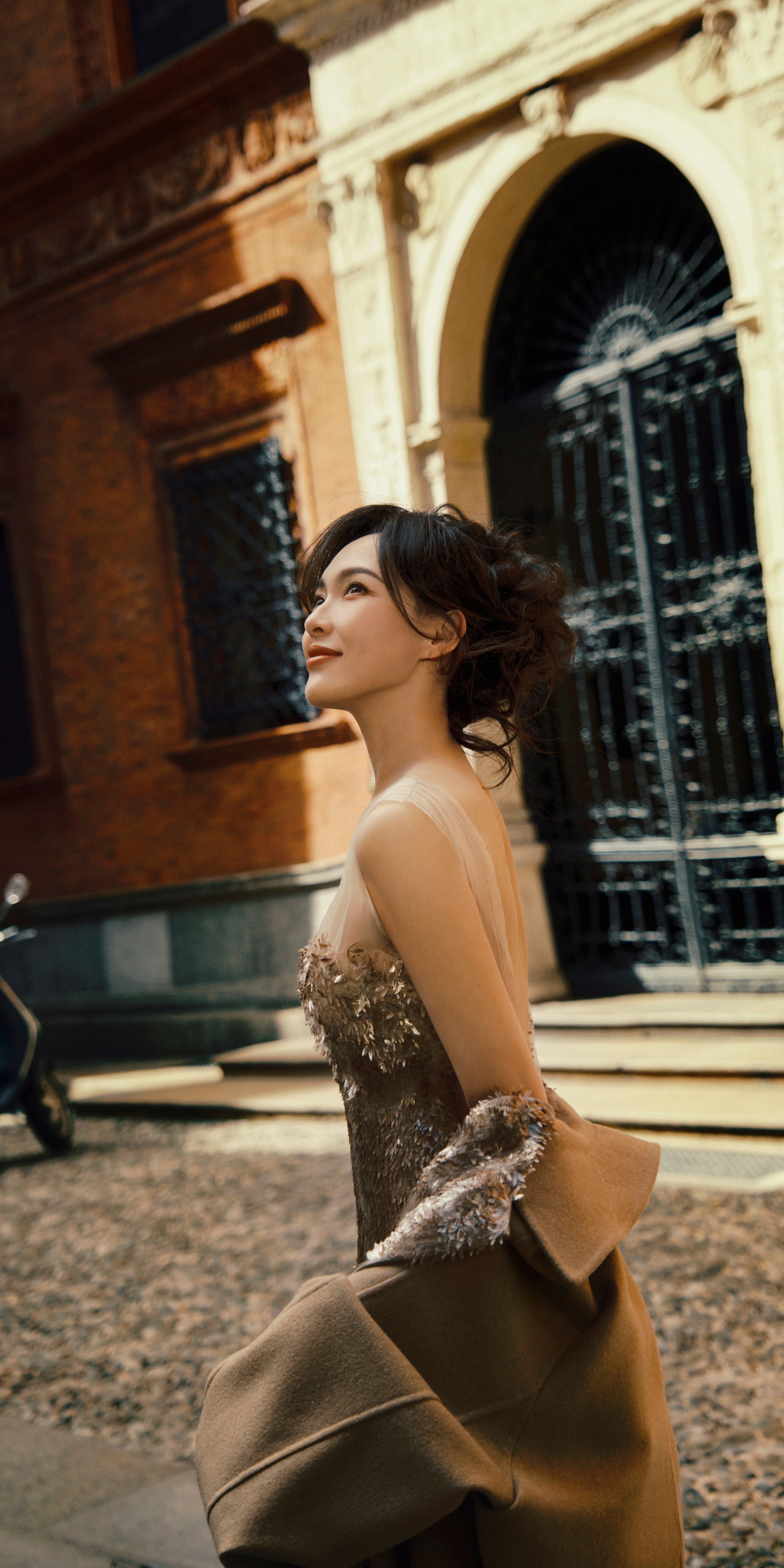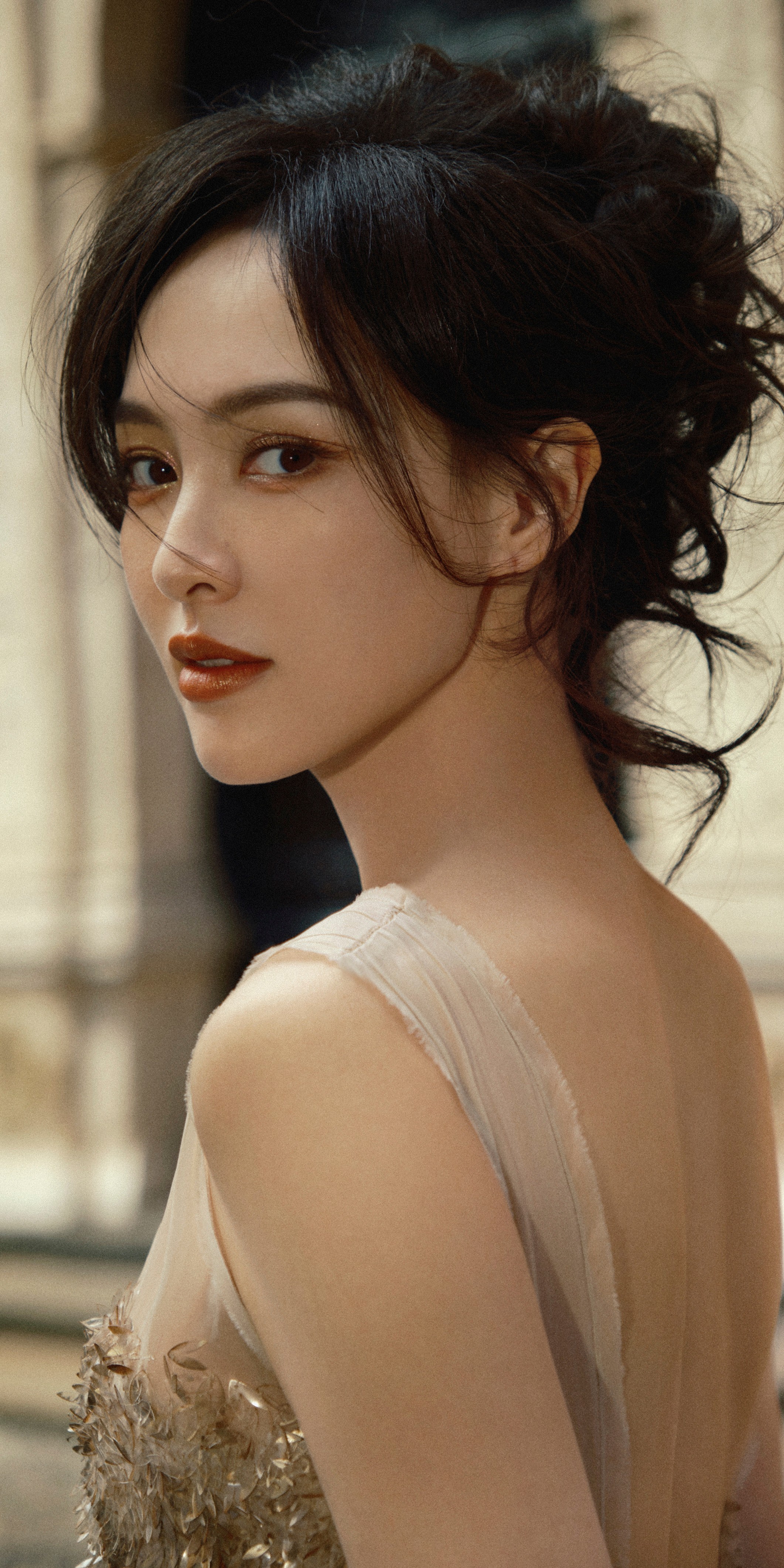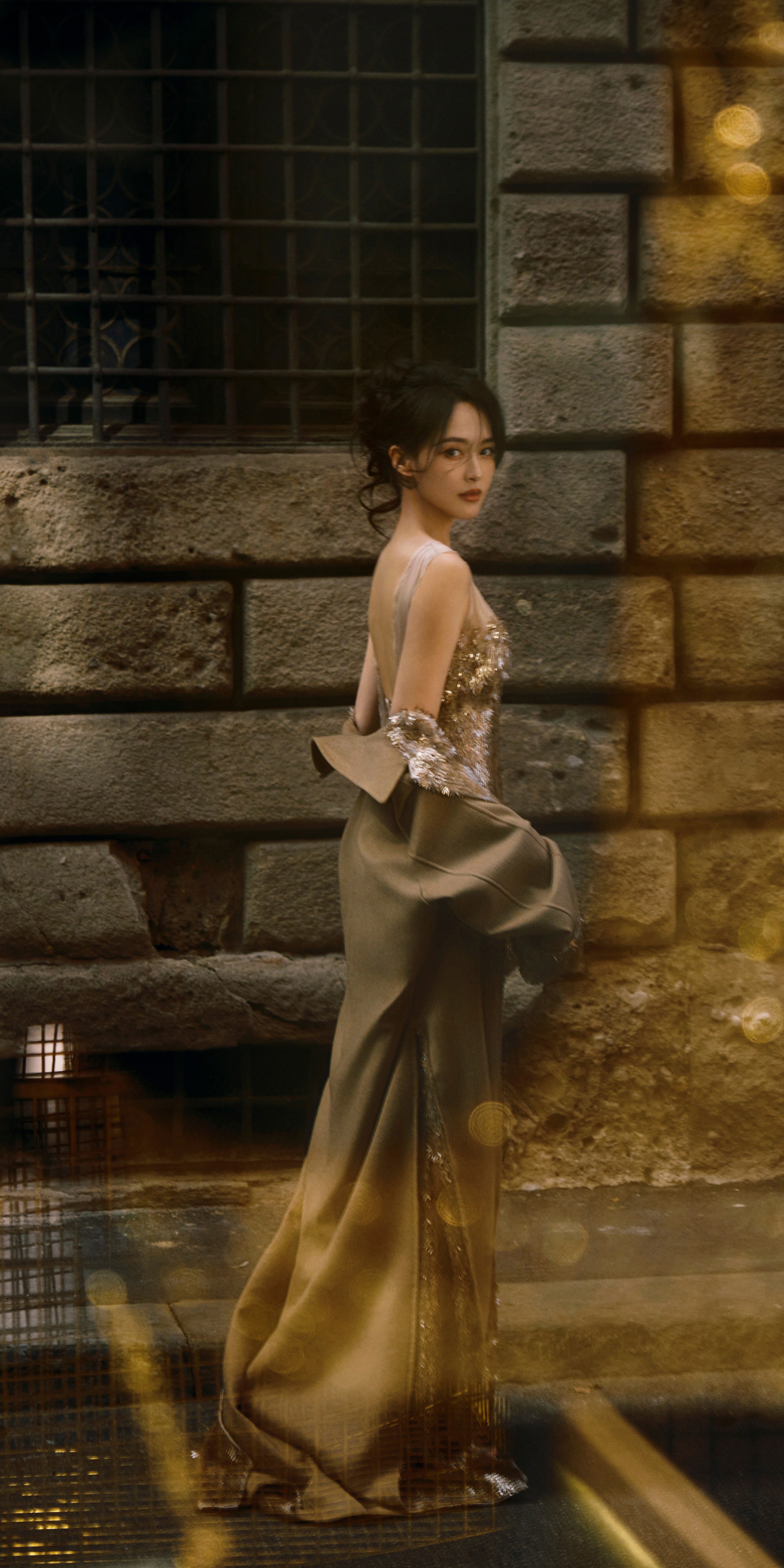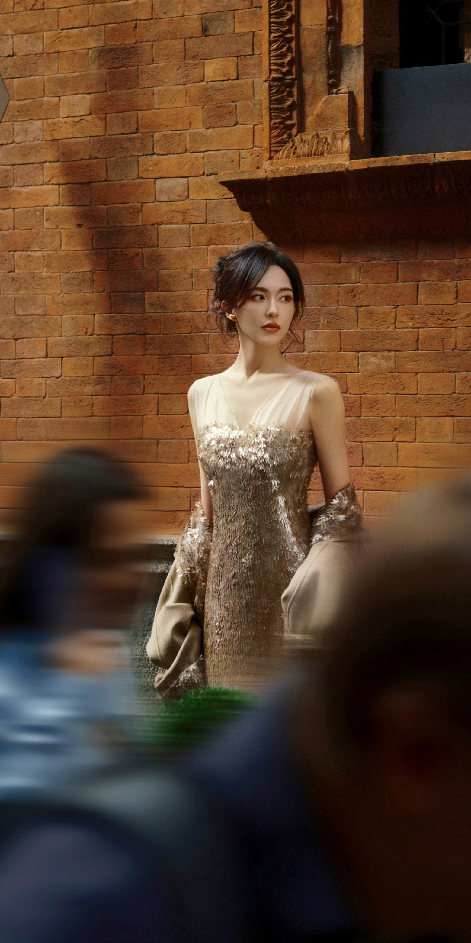 唐嫣壁纸:金色长裙,街角的浪漫。唐嫣