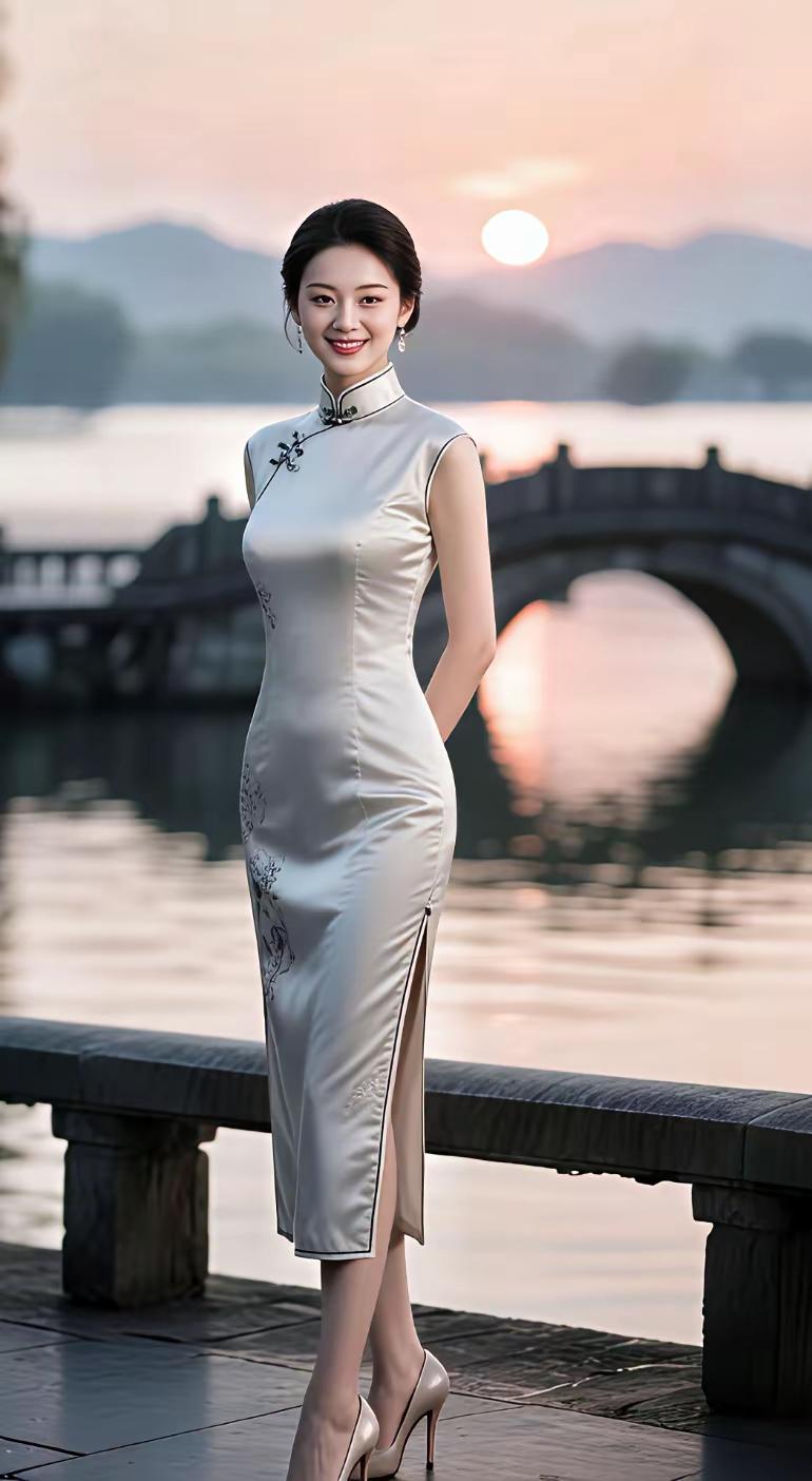 哇,这身旗袍太适合她了,站在湖边有种古典美人范,太漂亮了。