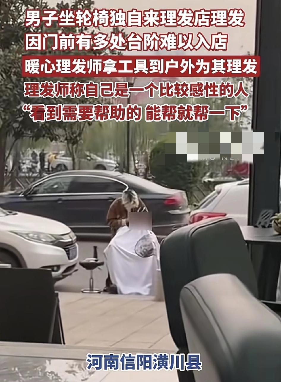 河南信阳一位男子坐着轮椅想到街边的一家理发店去理发,店主看到之后想过来帮忙推进去,但是从路边的进店有280米,还有多个有斜坡和阶梯。为了保证安全,店主干脆拿出工具,在路边给这位男子剪头发,整个过程十分钟。男子表示特别感动,因为此前他去过很多理发店,想进店理发都被拒绝了。店主成自己比较感性,看到有需要帮助的人,就会忍不住去帮忙。