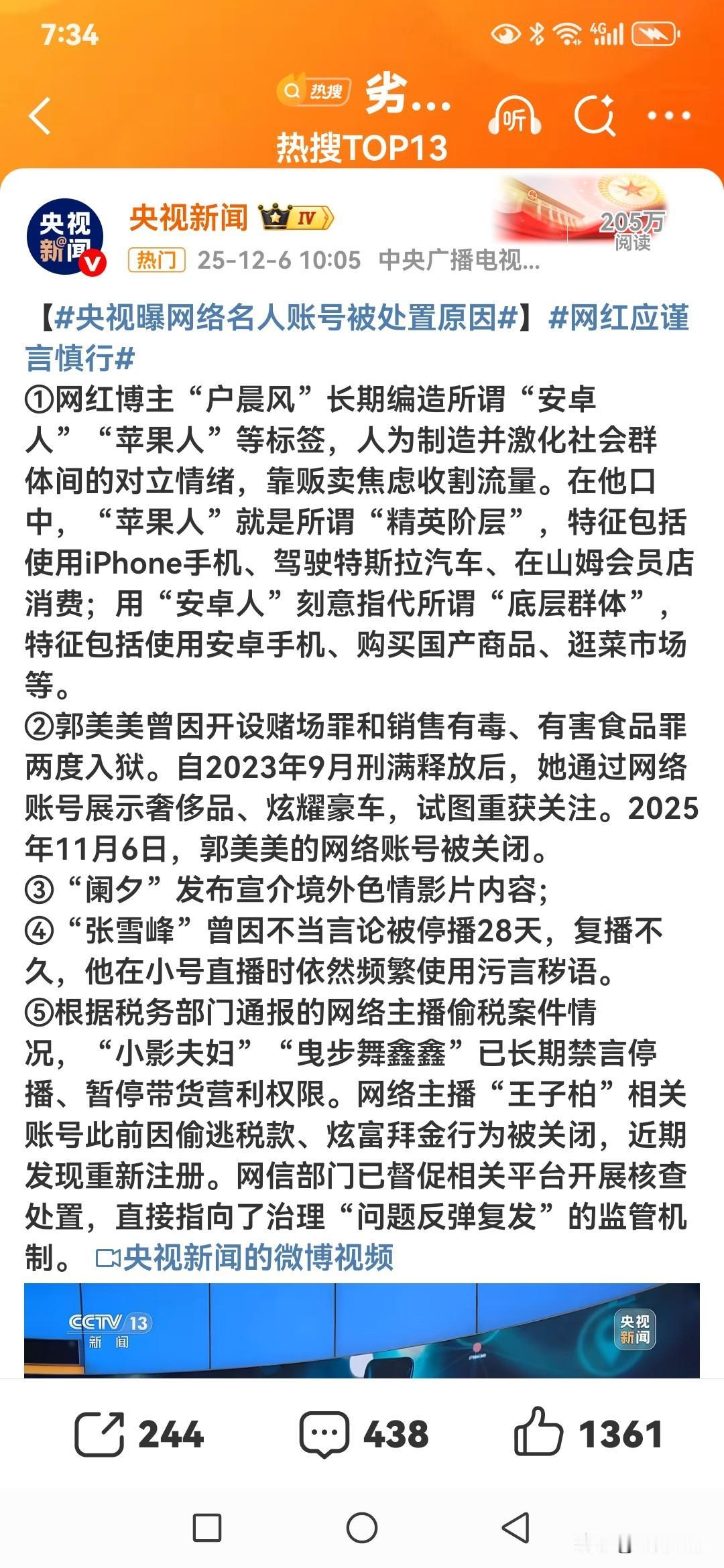 央视曝光网络名人账号被处置原因,给所有网红敲响了警钟。像“户晨风”“张雪峰”“阑夕”等头部网红都在此次被通报之列。这些网红违法违规行为多样,有的编造标签煽动群众对立,有的炫富拜金宣扬扭曲价值观,还有的用低俗内容污染网络环境。 比如郭美美,作为“初代网红”,两次入狱仍不知悔改,继续网络炫富。网红拥有大量粉丝和影响力,他们的言行会对社会产生很大作用。所以,网红必须谨言慎行,不能为了流量不择手段。网络不是法外之地,只有遵守规则,才能让网络空间风清气正。 封禁网红 主播账号封禁 网红直播间封禁